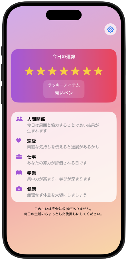 占いは信じないけど見てしまう。 1位になるとなんか嬉しい。最下位だとなんか嫌なことが起きる気がする。 自己肯定感を上げるためだけに完全に根拠のない良いことだけ、いい運勢を提示する占いアプリです。 占いに根拠なんか求めないけど良い運勢だとその日アクティブになれる人に向けたインチキ占い、背中を押すアプリ。