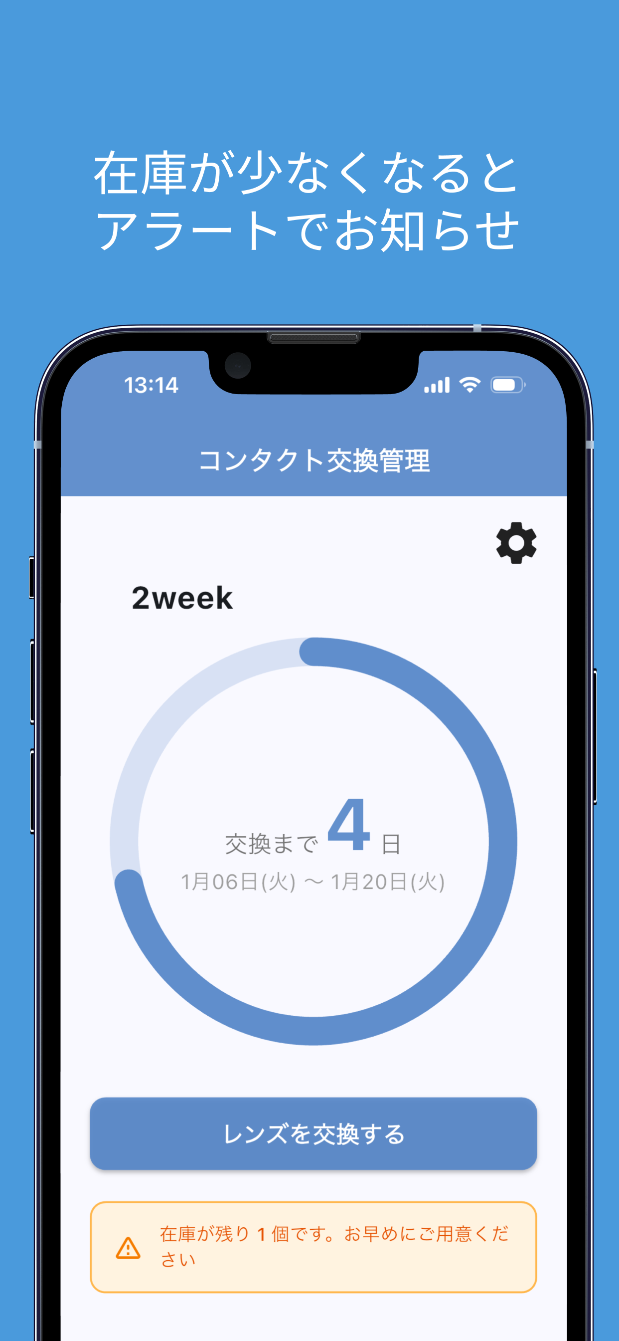 コンタクトレンズの交換日を忘れがちな人のための管理アプリです。 交換までの残り日数を円グラフで確認でき、前日・当日の通知や在庫アラートにも対応。 1day・2week・1monthなど、使い方に合わせてシンプルに管理できます。