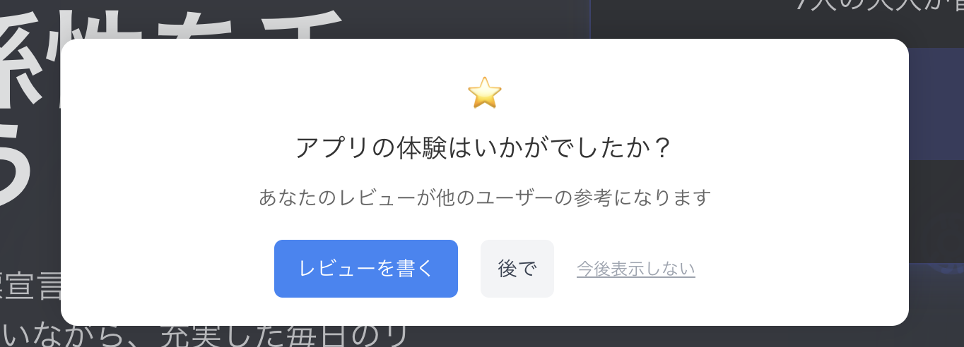 - 「アプリの体験はいかがでしたか?」のメッセージでレビューを促進