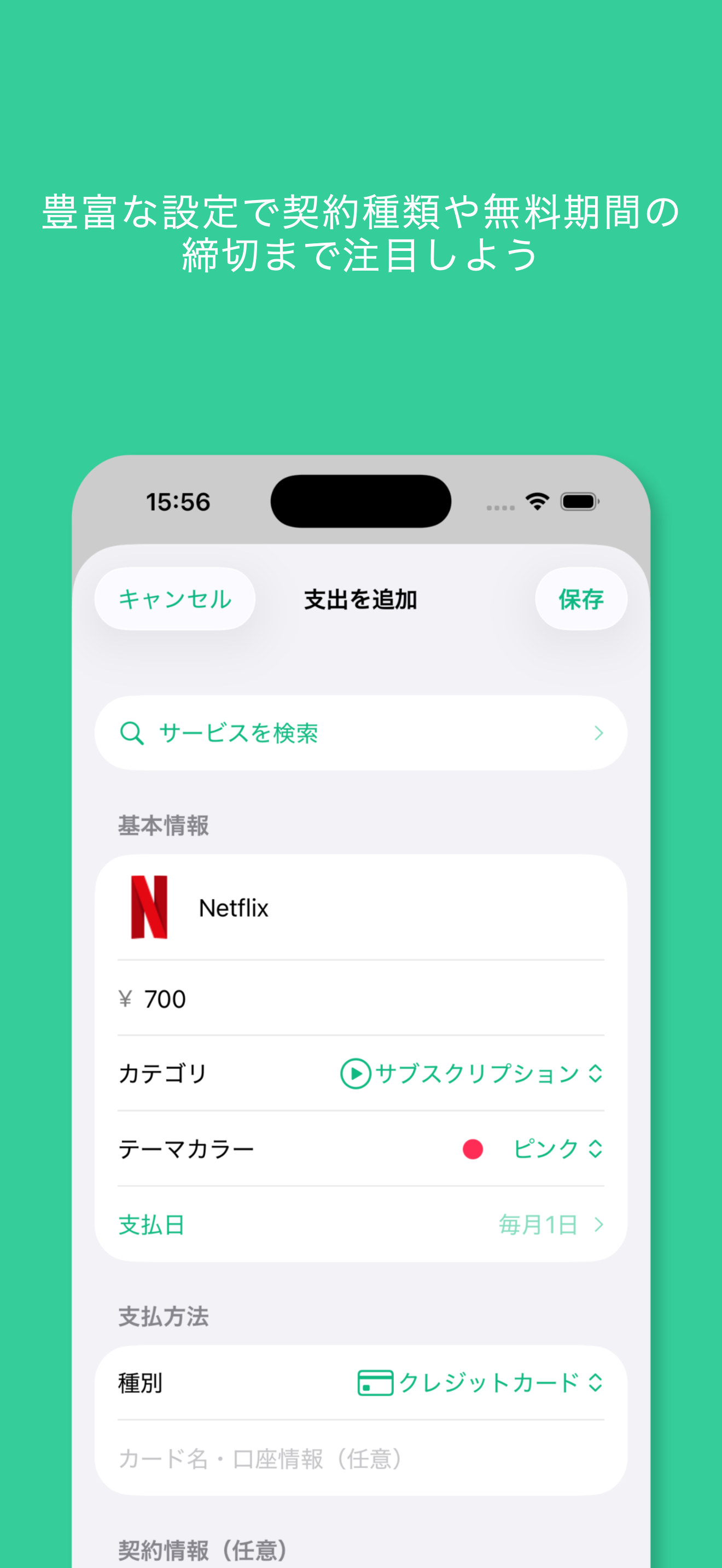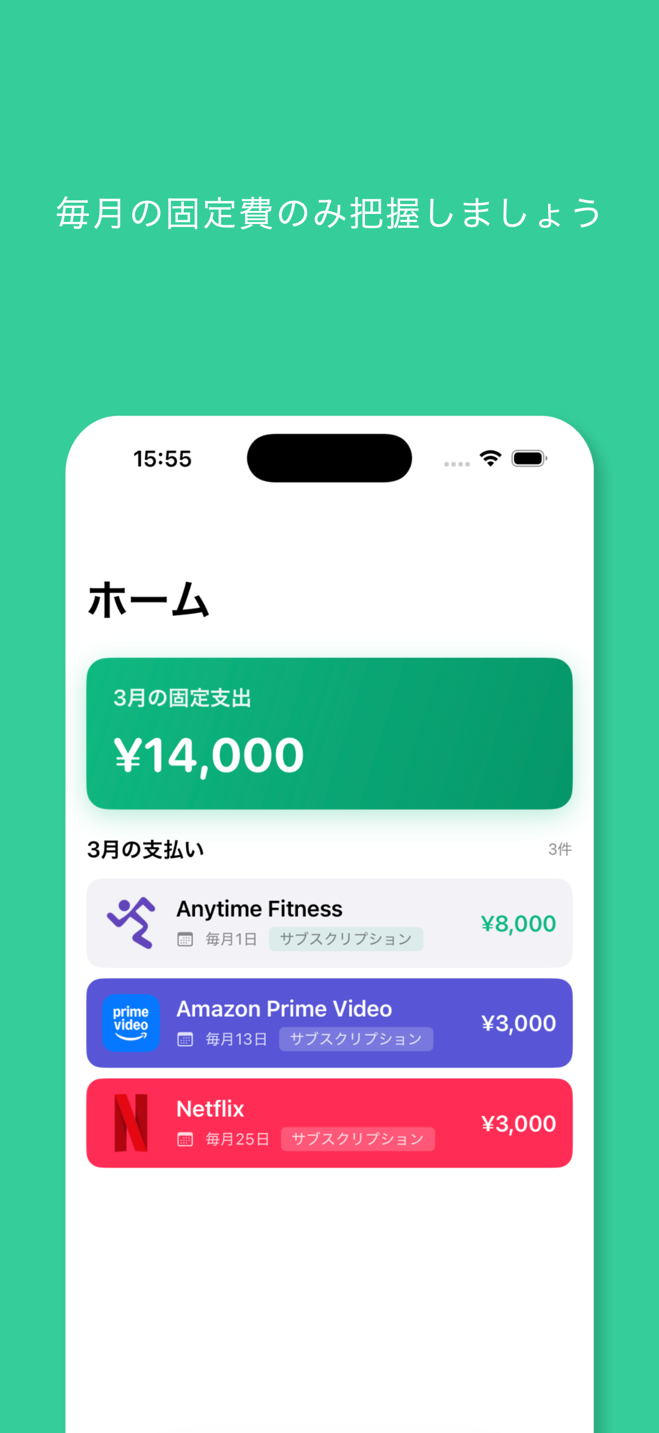 CashTowerは、毎月の固定費管理に特化 したシンプルなアプリです。 サブスク、通信費、光熱費、保険料など 、毎月発生する支出をまとめて管理。「 今月いくら払っているか」がひと目でわ かります。 ■ 主な機能 ・固定費の一覧管理 Netflix、Spotify、携帯料金など、すべ ての固定支出を一箇所で管理 ・カテゴリ分類 サブスク、通信、光熱費、保険など、カ テゴリ別に整理 ・月額合計の自動計算 登録した固定費の合計額をリアルタイム で表示 ・支払日の確認 各支出の支払日を登録して、いつ引き落 としがあるか把握 ・サービス検索 Netflix、Amazon Prime、楽天モバイル など、人気サービスをワンタップで登録 ■ こんな方におすすめ ・サブスクが増えすぎて把握できていな い ・毎月の固定費を見直したい ・家計の固定支出を整理したい シンプルな操作で、毎月の支出をスッキ リ管理しましょう。