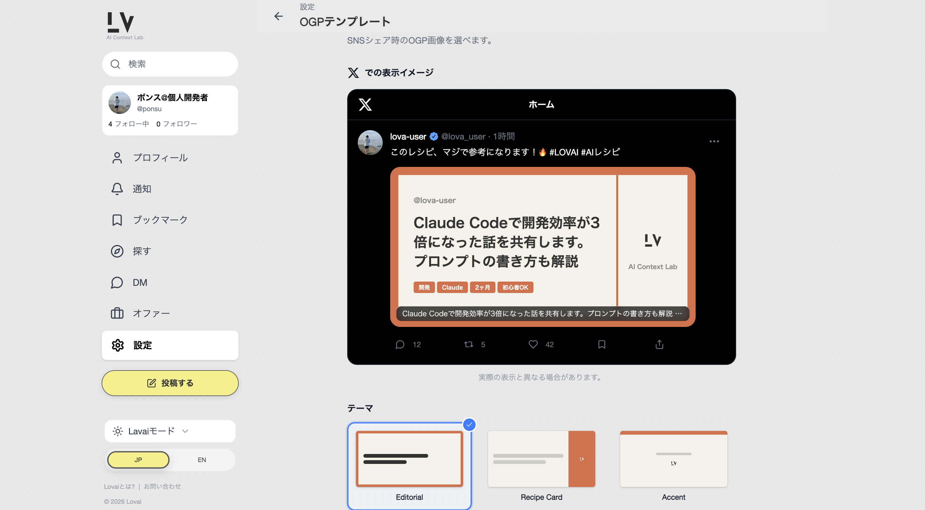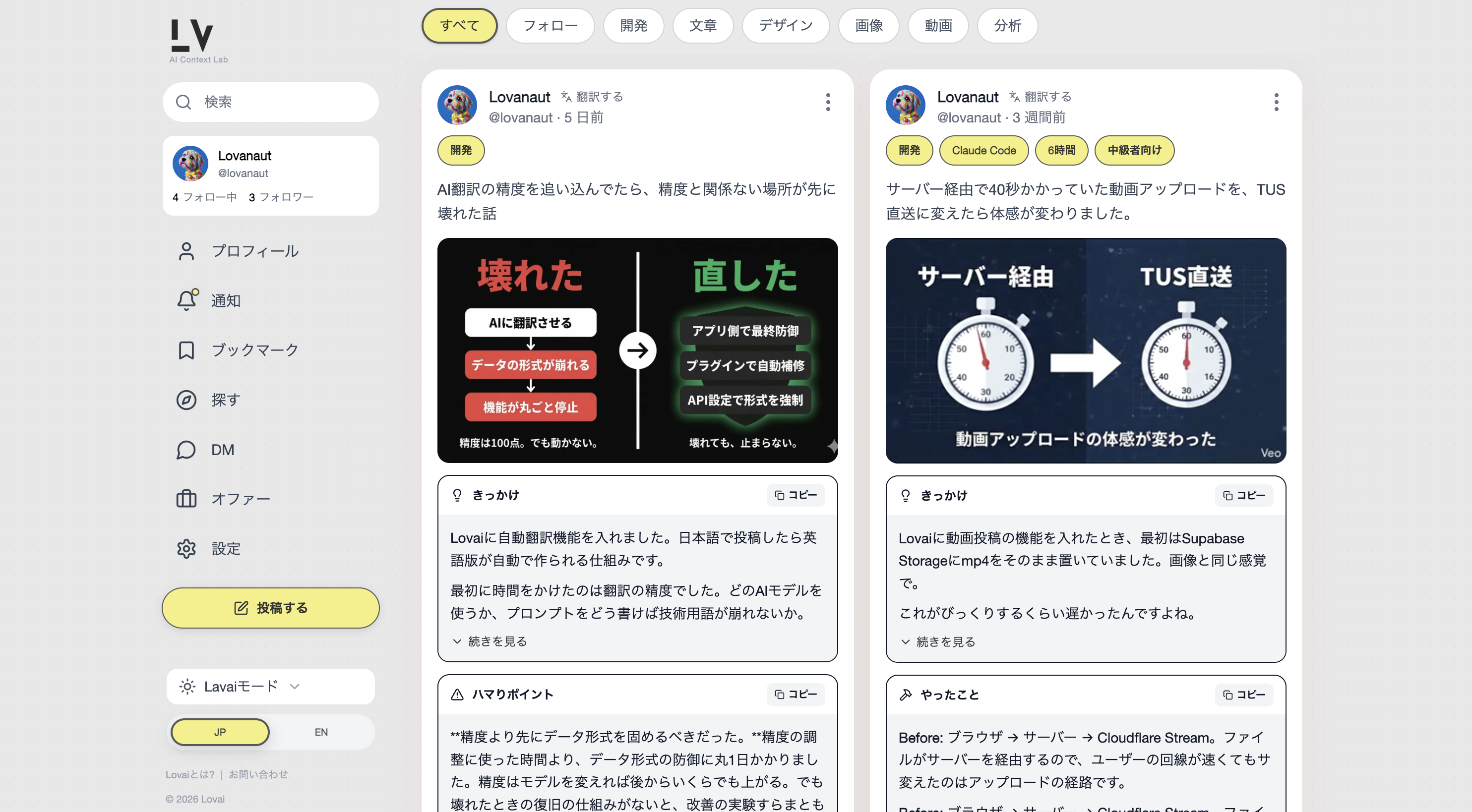 AIで何かを作ったとき、「どうやったんだろう」と調べても、出てくるのは断片的な情報ばかりでした。 Xは流れてしまう。ブログやnoteは詳しいけど、構造化されていない。プロンプトだけ見ても再現できない。文脈がないと、同じ結果にならない。 「Xの流動性と、記事の深さの中間地点が欲しかった」。それがLovaiを作ったきっかけです。 --- 投稿の構造 --- Lovaiの投稿は「きっかけ」「やったこと」「ハマりポイント」の構造化ブロックで書きます。 プロンプトだけじゃなくて、なぜそうしたか、どこで詰まったかまで含めて共有できる設計です。 各ブロックに public(無料)/ premium(有料)/ private(非公開)を設定できます。 たとえば「きっかけ」は無料で公開して、「やったこと」の核心部分だけ有料にする。 投稿者が「文脈のどこに価値があるか」を自分で決められます。 --- 「買う前に価値がわからない」をなくす --- 有料コンテンツで一番困るのは、買うまで中身がわからないことだと思っています。 Lovaiではブロックのメタデータ(タイトル・概要)は常に公開されていて、 中身のコンテンツだけが保護されます。 「何が書いてあるかはわかる。でも詳細は有料」という設計です。 これはDB層で強制しています。Supabase RLS + Security Definer関数で、 ブロックの行は返すけど、premiumブロックのcontentだけnullにする出し分けを実装しています。 クライアント側のフィルタでは突破できない構造です。 --- 収益化 --- 最低価格500円。手数料はプラットフォーム10% + Stripe 3.6%で、投稿者に約86%が届きます。 500円にした理由は、手数料を引いた後に投稿者にちゃんと残る最低ラインだからです。 決済はStripe Connect Expressで、投稿者のアカウントに直接届きます。 --- その他の機能 --- . 日英バイリンガル対応(投稿の自動翻訳あり) . 動画投稿(60秒まで、Cloudflare Stream + HLS配信) . OGPカスタマイズ(プリセット3種 + テーマ3種 + カスタムカラー) . DM・オファー機能(仕事の依頼や提携に使える) . ブックマーク・通知・探索ページ --- 技術スタック --- . Next.js 15(App Router)/ TypeScript strict / React 18 . Supabase(PostgreSQL + RLS + Auth) — ブロック単位の権限制御 . Stripe Connect Express — 投稿者への直接決済 . Cloudflare Stream — 動画のHLS配信とTUS直接アップロード . Tailwind CSS 4 / Radix UI / Zustand / TanStack React Query . Vercel