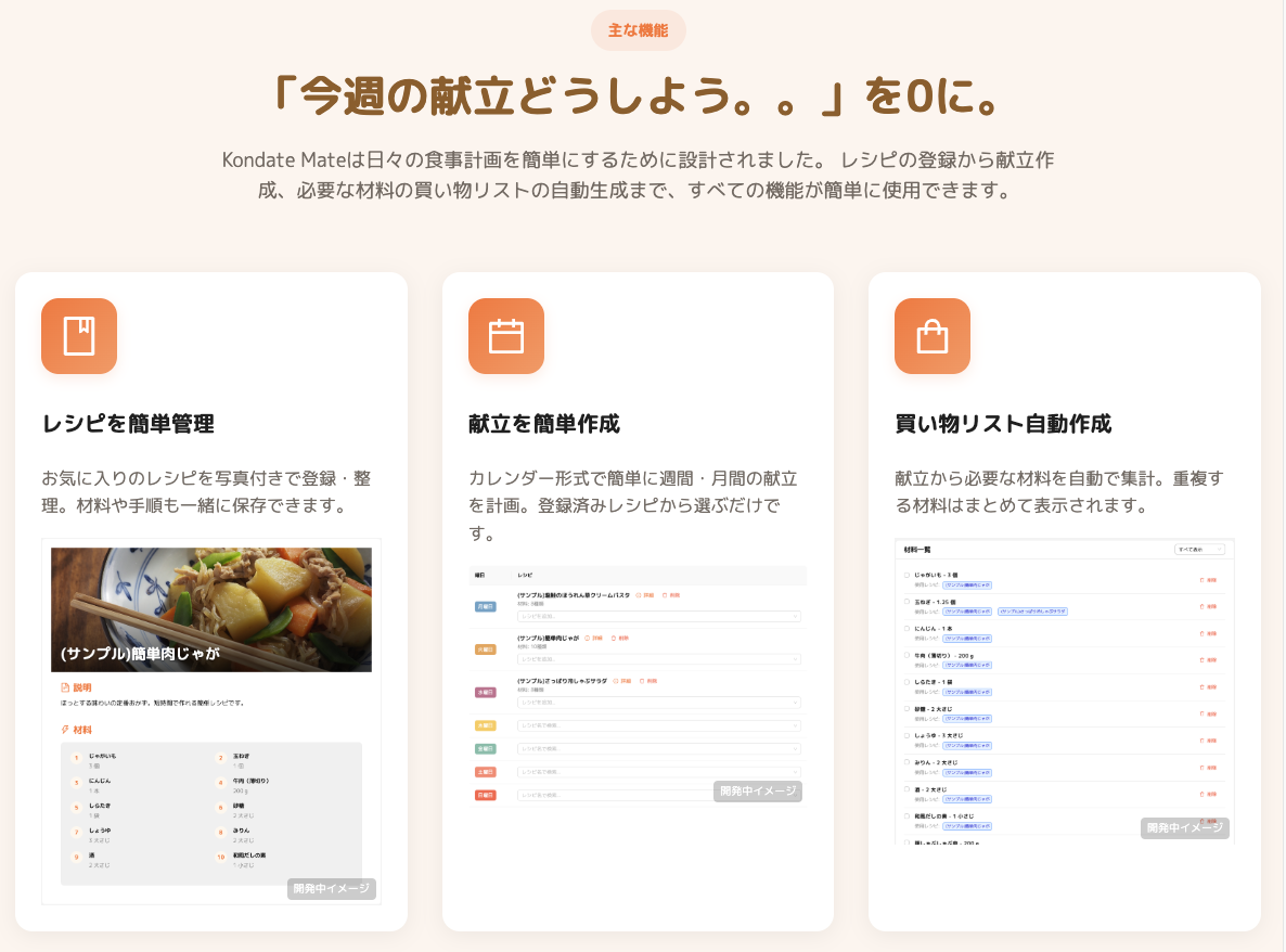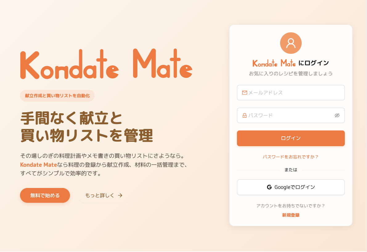 「今週の献立どうしよう。。」を0に。 Kondate Mateは日々の食事計画を簡単にするために設計されました。 レシピの登録から献立作成、必要な材料の買い物リストの自動生成まで、 すべての機能が簡単に使用できます。