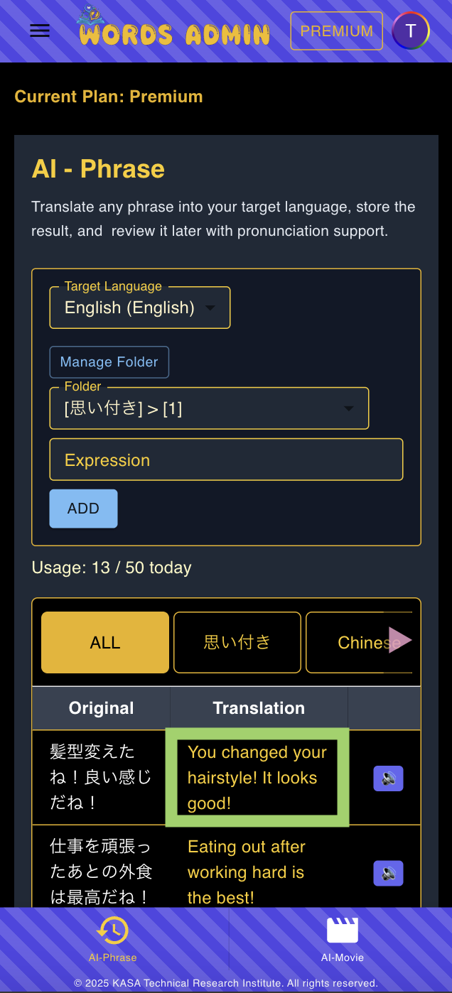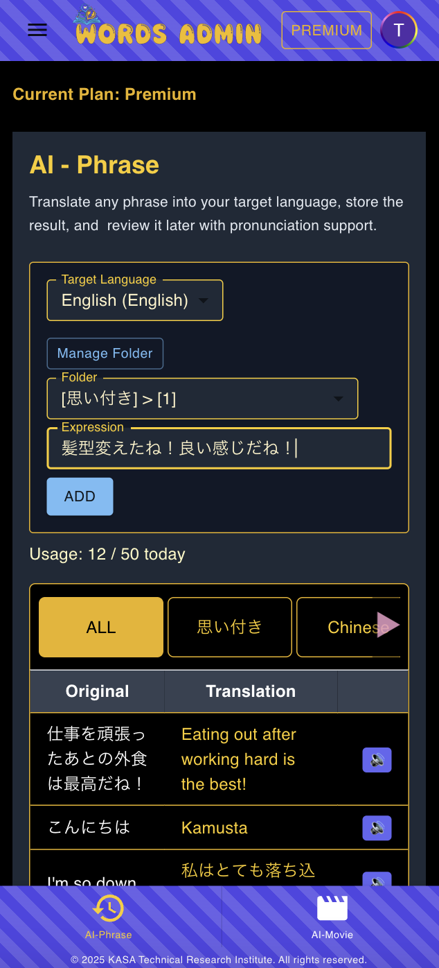 【Words-Adminアプリについて】 常に英語やロシア語を学習中の自分に必要な言語学習のサポートツールを自分用に開発し、 結構便利なものになってきたので公開しました。 https://words-admin.web.app/admin 毎日、一所懸命作ってきました。 Googleログインだけすればすぐに試せますので、どなたでもご自由にご利用ください。 (ぜひ、下部のどのような考えでこのアプリを開発したかについて、背景の内容も読んでいただき、言語学習時の課題感について共感してもらえる方が多いと嬉しいです。人にうまく自分の考えを伝えるのって本当に難しいですね。。。少しでも考えが伝わると嬉しいです。) <機能概略> Words-Admin https://words-admin.web.app/admin 機能は現在2つ ⚫︎AI-Phrase → 「これをこの英語で言いたい」を書くだけで、対象の英語でどう言えば伝わるか?のセットを用意して自動記録するもの。 (対象の言語は英語も含めて40言語ほど用意してあります。) ⚫︎AI-Movie → 「この英語表現が実際に使われているシーンを見たい」と思う表現を入力するだけで、実際に使用されているシーンを動画で再生可能(現在は3動画を抽出) (こちらは現在英語のみ) <背景> 私は英語学習が好きでした。 今まで英語話者の人と会話ができなかったのに対して、勉強をすると意思の疎通ができるようになる喜びを感じていました。 もっと上手く、自由に、言葉を”操り”、コミュニケーションが取れるようになりたいと、 今も英会話レッスンに通っています。 しかし、続けていくうちにある課題間を感じるようになりました。 英会話の練習を続けていく度に”成長しているなという感触”、があれば何も問題はなかったのですが、 実際には英会話の練習を続けても”あまり成長できていない感”(0ではないが...) を常に感じるようになりました。 ただ、そもそも”成長していかない感”とは何なのか?それすらもよく分からない。 ボキャブラリーはまぁやる度に多少は増えるので、ボキャブラリー=成長であれば、成長していなくもない。 ただ、確実に自分の中にある上手く成長できていない感は確実にあることだけは事実だ。 この成長できていない原因と対策を色々考えました。 ・仮説:レッスン時の姿勢に問題がある? ・対策:もっと積極的に、細かいニュアンスなどについても講師に質問をする意識をする ・結果:意識をしたところで、この細かい質問自体も上手くできないことに気づく。 ・仮説:量の問題? ・対策:Youtubeでもっと英語の動画を観る時間を増やす? ・結果:もちろん量を増やせばその分多少効果はあるが、聞き流す感じになったりしてしまい、成長していく感触が強くはない その他、GPTとの会話も定期的に試しているが、なかなか語彙、表現のバリエーションを増やせないなと思いました。 上記のクリティカルではない対策なども踏まえて、自分の最も重要な対策について考えていった結果、 以下が自分にとって最重要の解決したいことであると言う考えに至りました。 ーーー 自分が会話をする際に、 「会話をするときにこれが言えなかったぁ」 ということが多々あった。 そして次のレッスンでも同じ内容が上手く話せない。 → これが”成長していない感”の正体ではないか? ーーー 本来であれば、この上手く話せなかった表現について、 模範解答を調べる → メモなど管理をする → 次のレッスンで使用してみる と言ったプロセスを経て、 言えなかった表現 を 言える表現 に変えることが必要であると思うのですが、 ずぼらな自分はそのプロセスを面倒に感じてしまい、中々システマティックにこのプロセスを実行する習慣がつけられなかったです。 要は、レッスンだけ行って満足してしまっていたわけです。 理屈が分かれば、あとは気合いで改善することができル人は問題はないのですが、 自分のような面倒くさがりは一筋縄ではいきません。 頭では分かっていても仕事など他のことでも忙しいなと思ったりすると途端にめんどくさくなるのです。 では自分は言語学習に向いていないと諦めるかというと、それはもったいない。 間違いなく興味はあるし、もっと上手く話せるようになりたいという熱い想いも確かにあるのだ。 自分はアプリを作れるエンジニア。 自分に合うものを自由に作れる。 今はAIの時代だ。 AIの進化は隆盛を極めるものであり、基本自分が知りたいことは自分の”ニーズに合わせて”何でも答えてくれる。 これらを掛け合わせて、自分が面倒なことはある程度AIにも頼って、上記の課題を解決できないか? ここまでの話から、自分が出した答えが、 「言いたかった表現」のみを日本語でメモしていくだけで、AIが残りの答えを記録し、 管理していってくれるようにできないか。 言いたかった日本語の入力くらいは、レッスン後に入力する習慣が付けられそうだ。 これによって、”最小限の力で効率良く成長していける”習慣を付けられるのでは? それを自分で作り、しばらく使ってみると、かなりかゆいところに手が