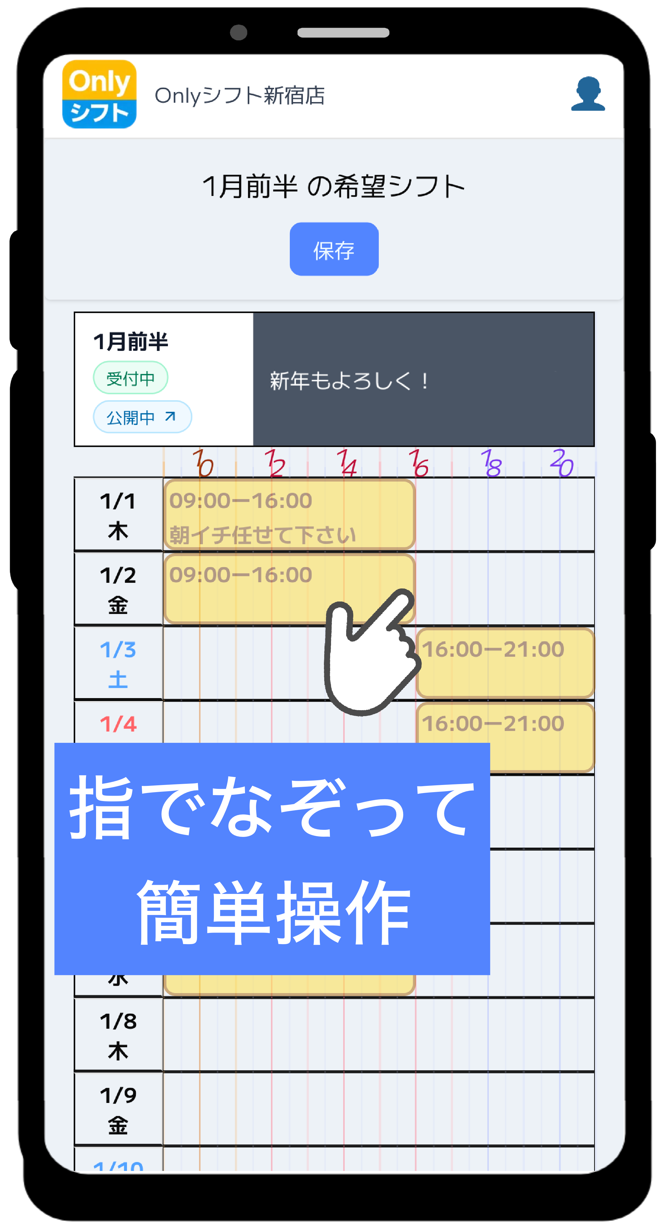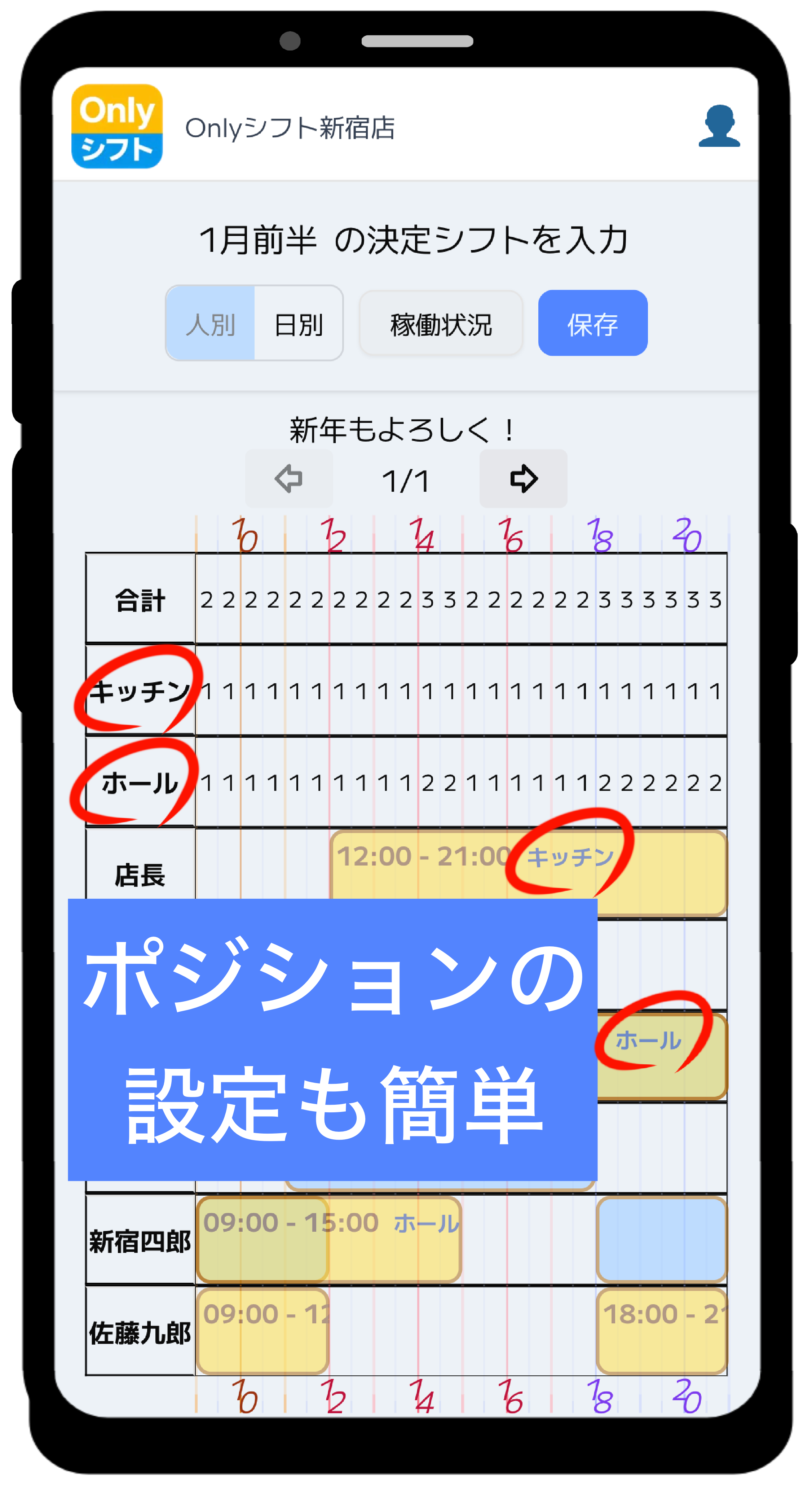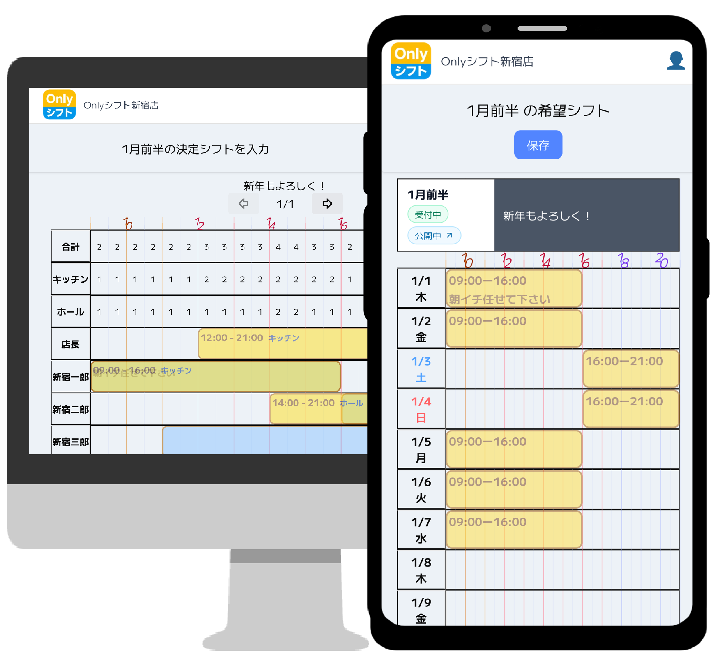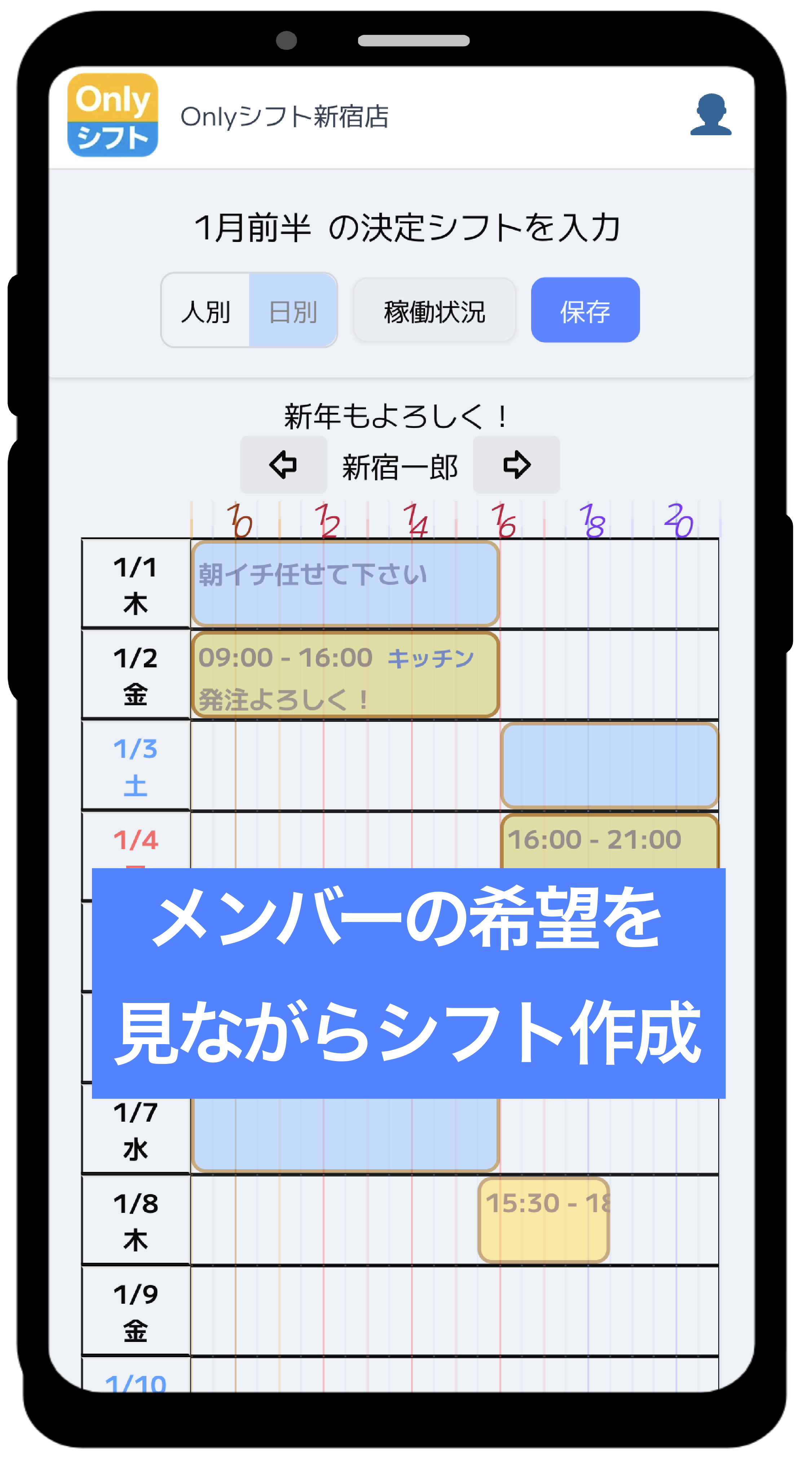 Onlyシフトは、リーダーにもスタッフにもわかりやすい シフトの収集、作成、配布。カレンダーのスケジュール登録 現場で働く人を1番に考えたシフト作成アプリです ## Onlyシフトのおすすめポイント ☝️ **かんたん操作** 迷わない導線、なぞるだけの簡単操作 👀 **ポジション設定** キッチン、ホールなど、時間毎のスタッフ数を一目で確認 ⏰ **働きすぎをチェック** 連続勤務日数、勤務時間数を確認できます ✏️ **作成をアシスト** 決まったシフトのパターンを作成できます --- ## Onlyシフトの使い方 ### 01 希望シフトを提出 各スタッフは締切前までに働きたい日時を提出 ### 02 シフトを作成(スタッフ別表示) それぞれのスタッフが提出したシフトを見ながら作成 メモ用のダミースタッフも設定可能 ### 03 シフトを作成(日別表示) 時間毎のスタッフ数、ポジションも一目で把握できます 個人開発しているITエンジニアの皆さん、 ぜひフィードバックよろしくお願いします! https://shift.onlyops.jp/top