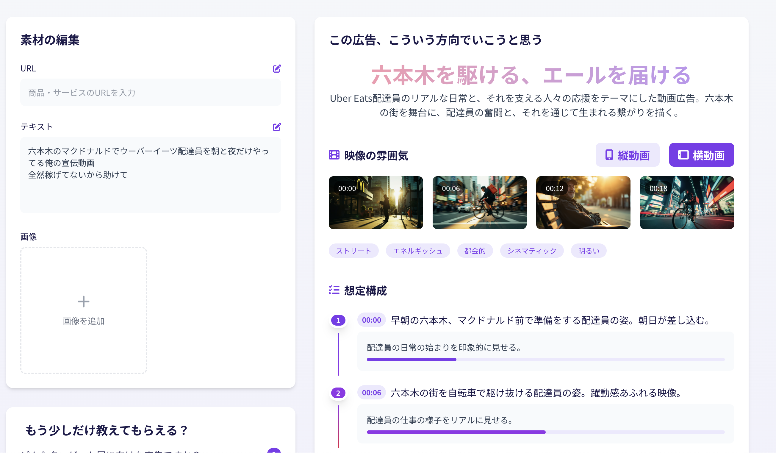 URL・画像・テキストを放り込むだけ。10 分後には"売れる動画広告"が完成。