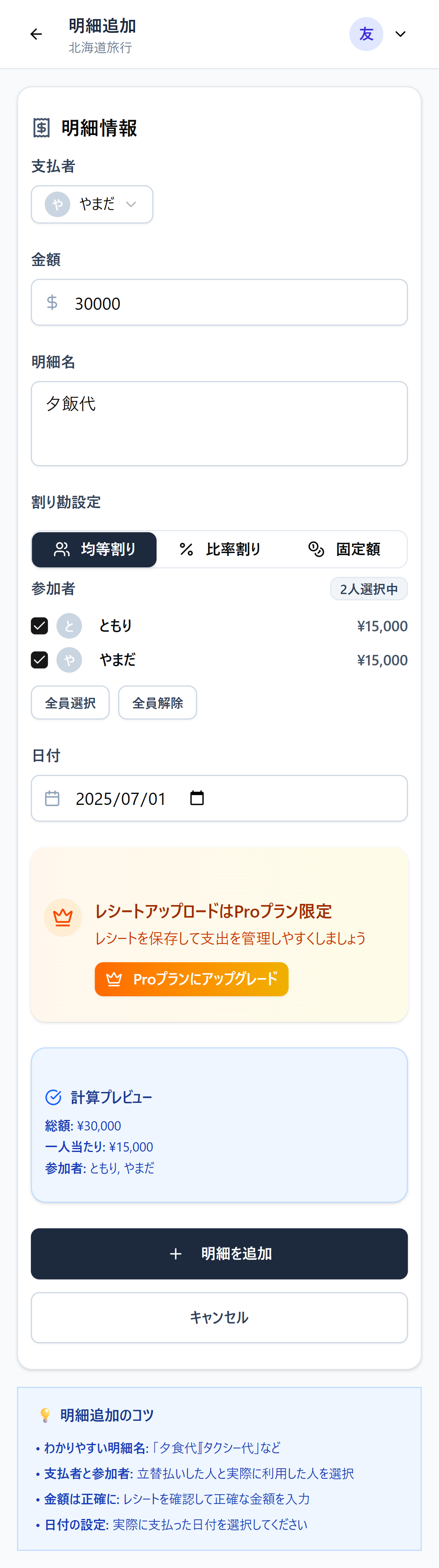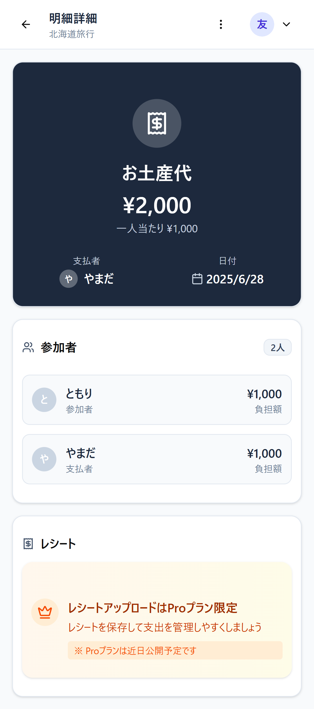 傾斜をつけた割り勘やプッシュ通知機能などかゆいところに手が届く割り勘管理サービスです! 他の割り勘管理サービスと比較して - 参加したグループの履歴が一覧で保存されます グループのリンクをなくしてしまっても安心! - メンバーが立替明細を追加した際にプッシュ通知が来ます - 割り勘の設定を均等割や比率割など傾斜をつけて追加できます - (Proプラン)レシートを添付できます!
