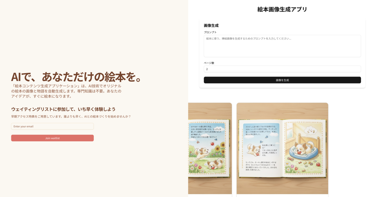 AI技術でオリジナルの絵本の画像と物語を自動生成します。 専門知識は不要。あなたのアイデアが、すぐに絵本になります。