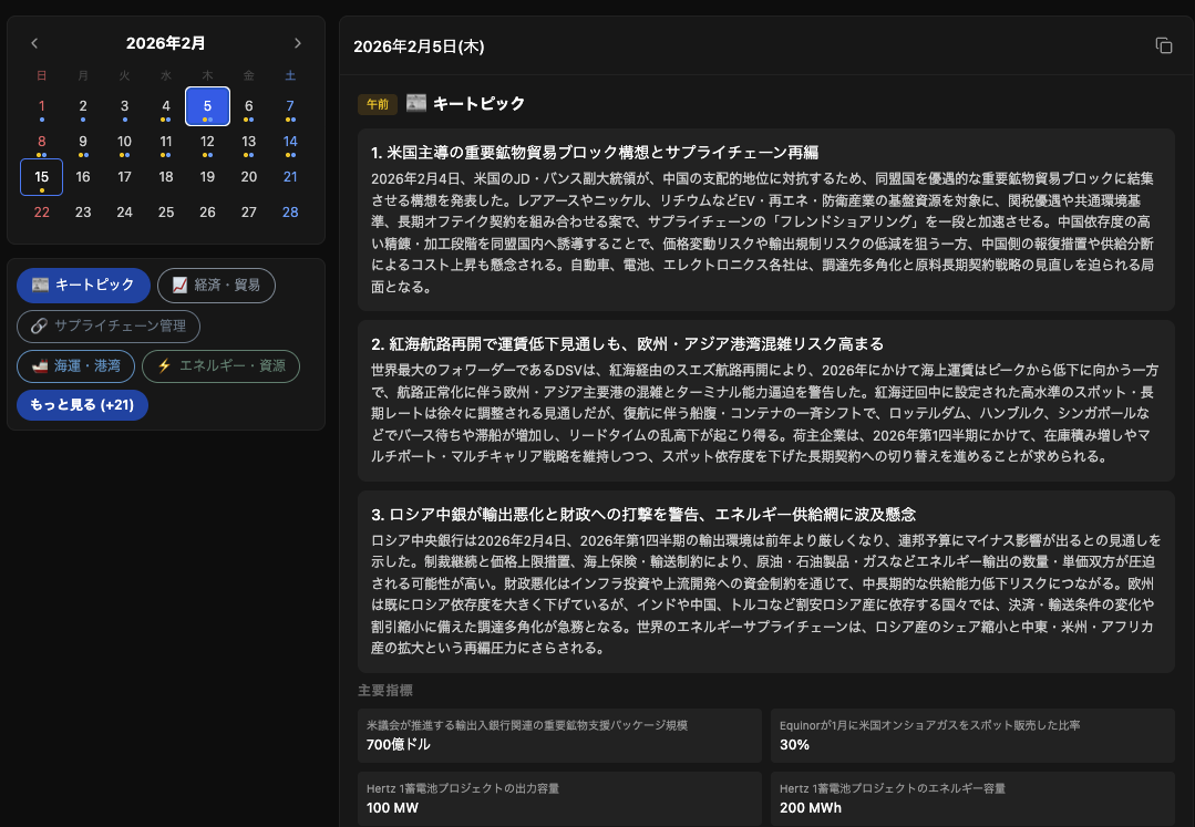 世界の動向やサプライチェーンの動きをウォッチするためのニュース&レポートアプリケーションです。