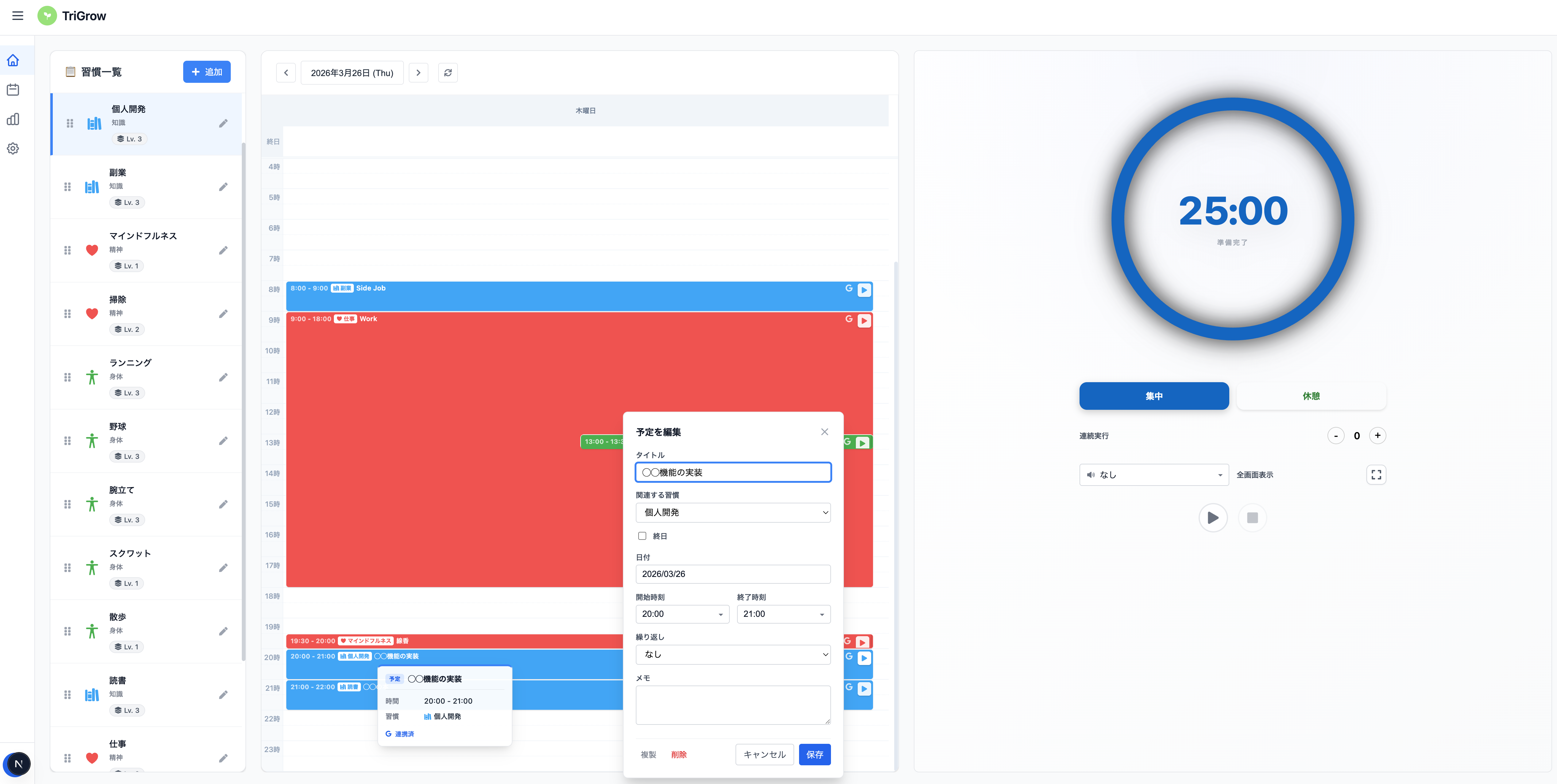 予定はカレンダー 習慣やポモドーロは別アプリ そんな感じになっていませんか? Trigrowは習慣をカレンダーに登録し、そのままポモドーロタイマーで実績を記録できるAll in Oneな習慣管理アプリです。 予定に習慣紐づけ、そのままタイマーをスタートすることができます。