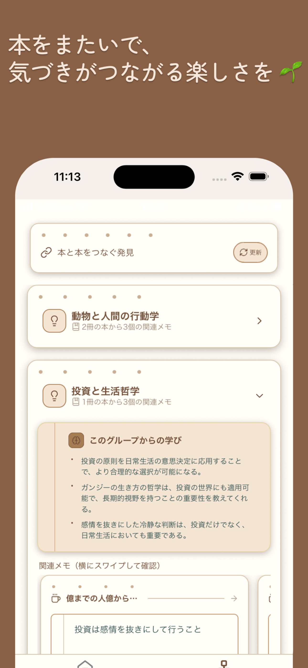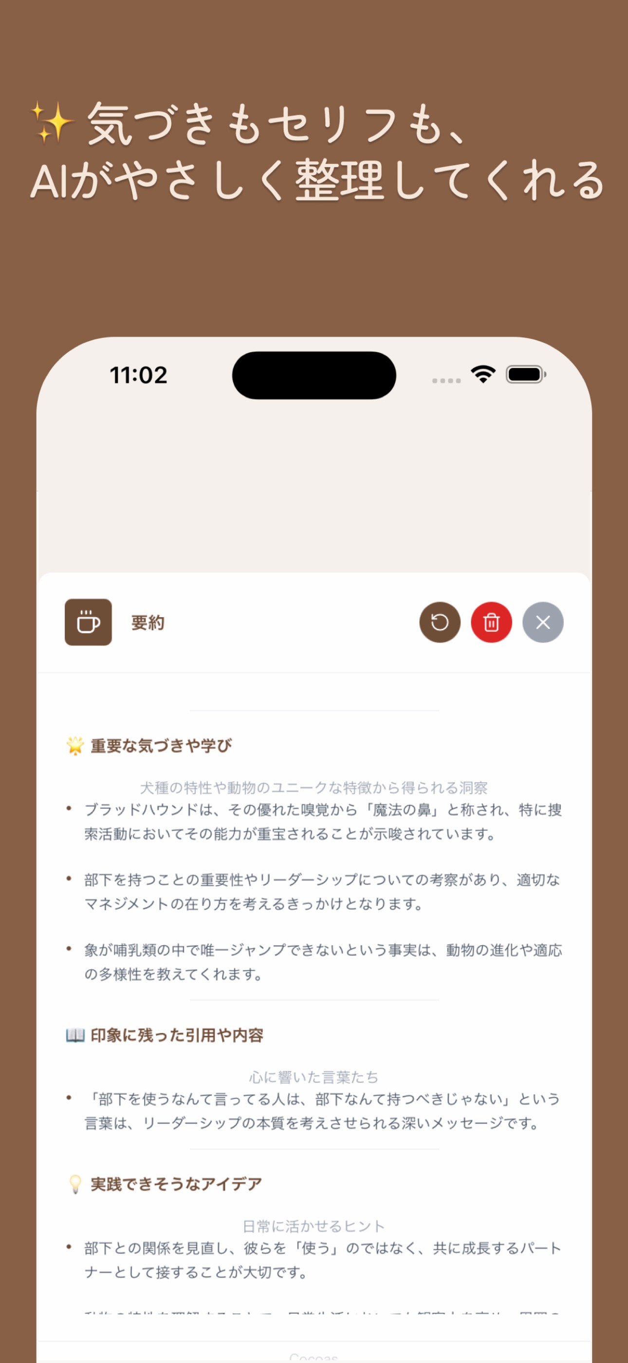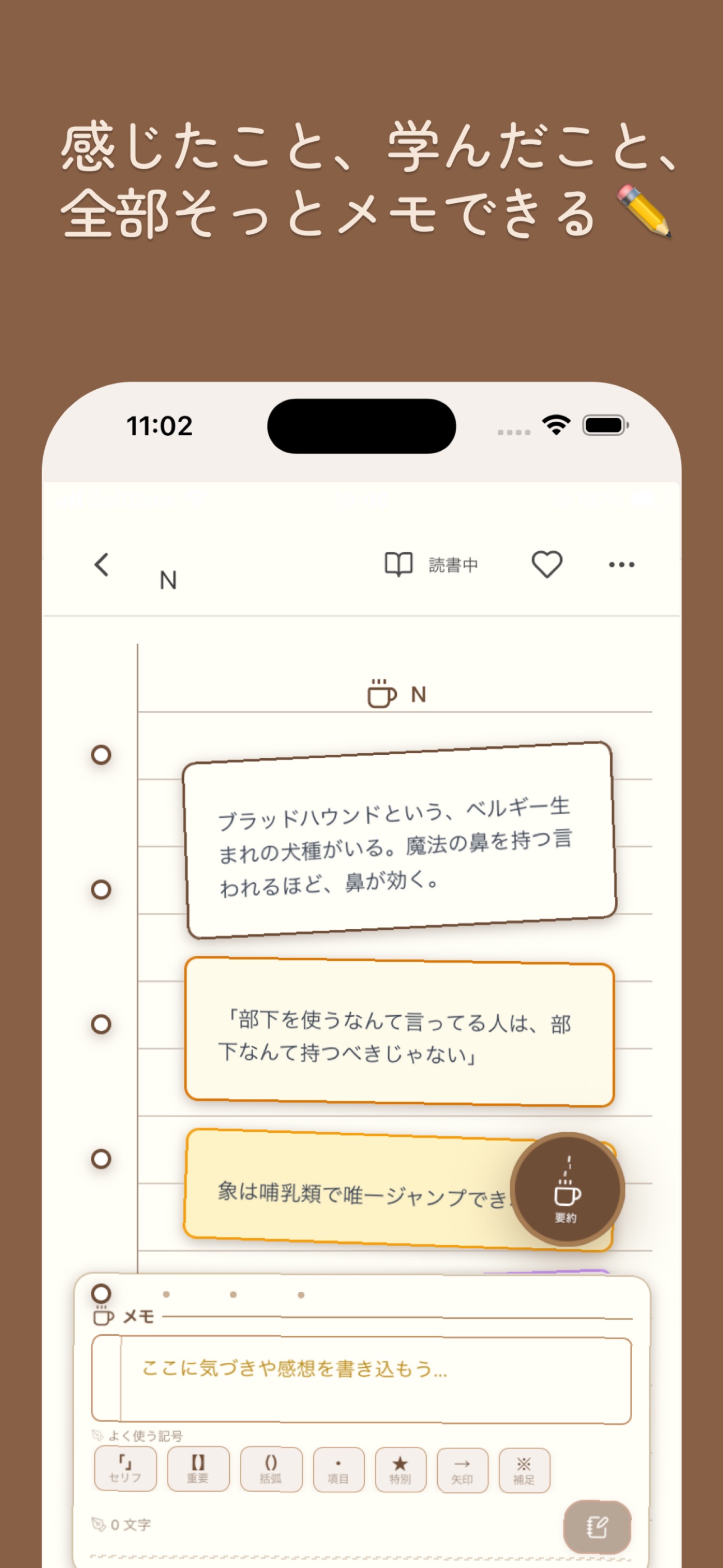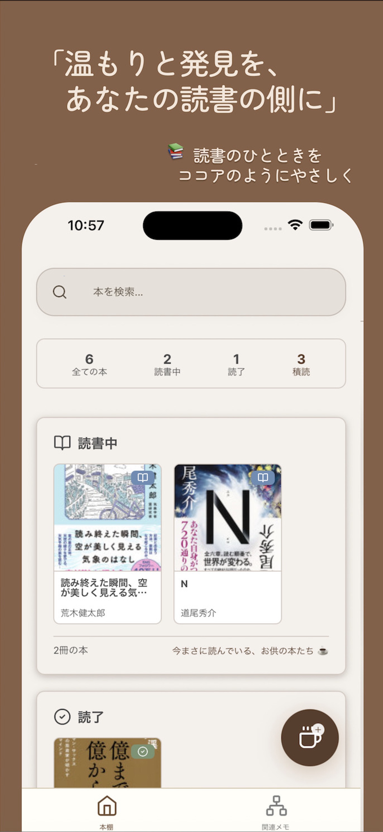 Cocoas – そっと寄り添う、読書メモアプリ Cocoasは、紙の本を読むあなたのための、本棚&メモアプリです。 読書のひとときを邪魔せず、心に残った言葉や気づきを、手書き風に気軽にメモできます。 📝 手書き風の温かいUIで、すぐにメモできる 🤖 AIがメモを自動で整理・要約 📚 積読〜読了まで、あなただけの本棚を育てられる 🕸 メモのつながりを可視化するナレッジグラフ機能も搭載 「あとから読み返したくなる」読書体験を、アプリで自然に。 忙しい日常でも、読書の余韻をそっと残せるCocoasをお試しください。