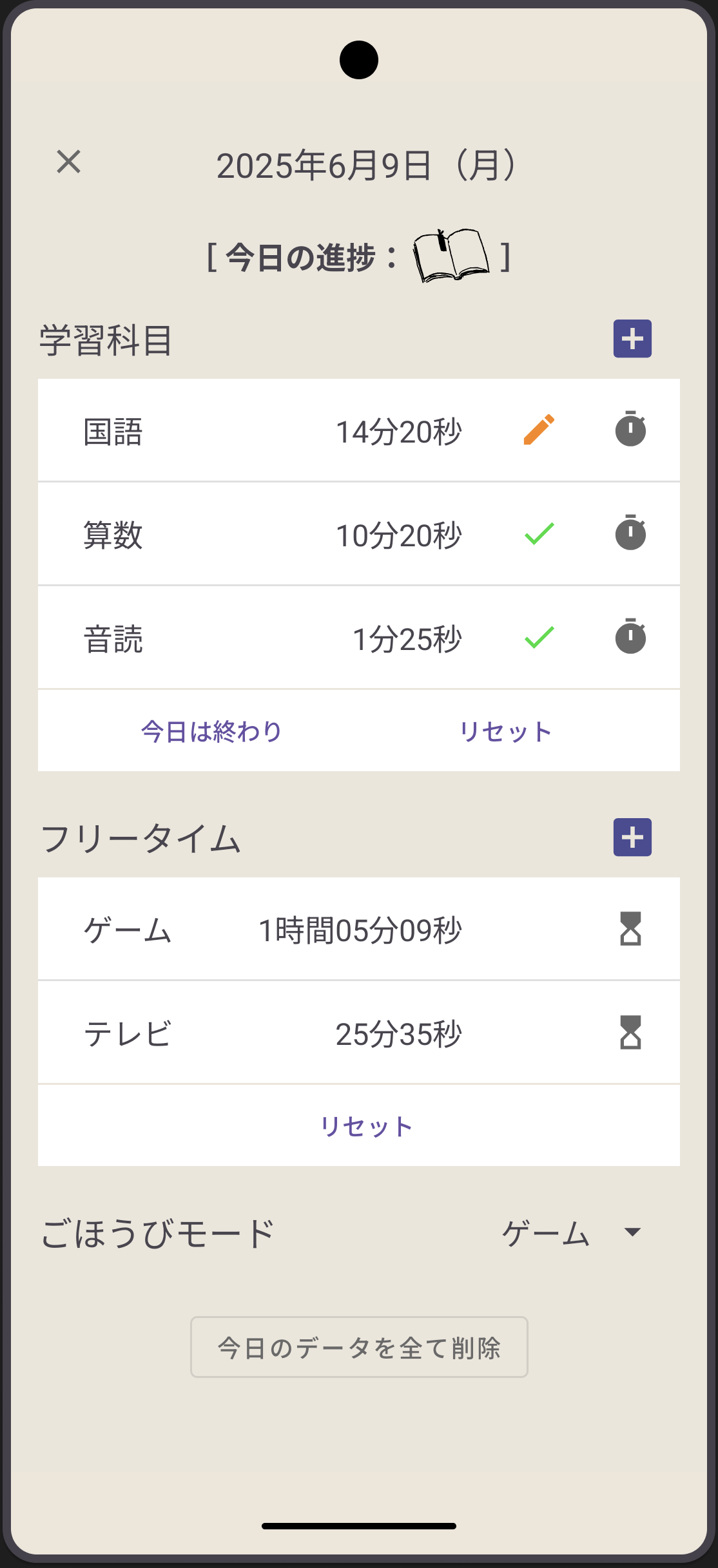 小学生から大人まで、年齢を問わず自主学習を管理できるアプリです。 日付毎に学習科目を登録し、ストップウォッチで学習時間を記録できます。 余暇の時間に行うゲームなどに使えるタイマー機能付き! 小学生も簡単に操作できるシンプルなデザインです。 大学ノートやメモ帳に気軽に書き込む感覚で使えます。 宿題、試験、資格取得...お子さんに限らず、学習を習慣化したい方、メリハリを付けて日々の学習に取り組みたい方のサポートツールです。 開発者が小学生の息子と考え実施している我が家独自ルールを「ごほうびモード」として実装しています!