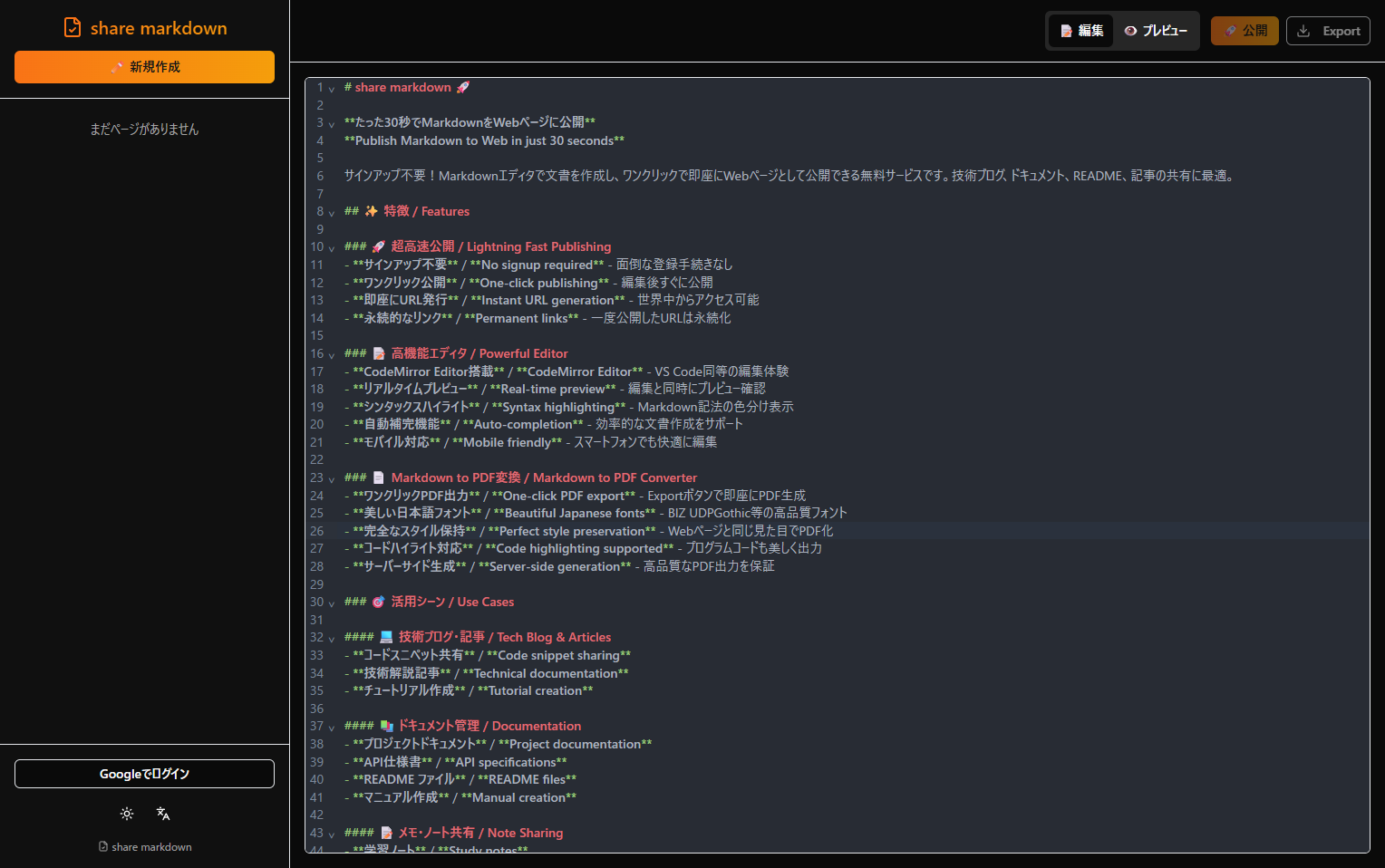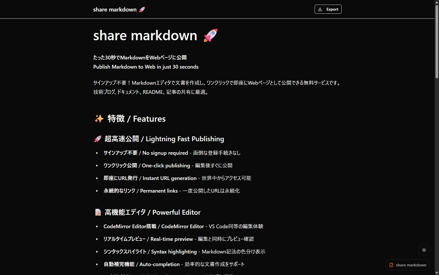 share markdown 🚀 たった30秒でMarkdownをWebページに公開 Publish Markdown to Web in just 30 seconds サインアップ不要!Markdownエディタで文書を作成し、ワンクリックで即座にWebページとして公開できる無料サービスです。技術ブログ、ドキュメント、README、記事の共有に最適。 ✨ 特徴 / Features 🚀 超高速公開 / Lightning Fast Publishing サインアップ不要 / No signup required - 面倒な登録手続きなし ワンクリック公開 / One-click publishing - 編集後すぐに公開 即座にURL発行 / Instant URL generation - 世界中からアクセス可能 永続的なリンク / Permanent links - 一度公開したURLは永続化 📝 高機能エディタ / Powerful Editor CodeMirror Editor搭載 / CodeMirror Editor - VS Code同等の編集体験 リアルタイムプレビュー / Real-time preview - 編集と同時にプレビュー確認 シンタックスハイライト / Syntax highlighting - Markdown記法の色分け表示 自動補完機能 / Auto-completion - 効率的な文書作成をサポート モバイル対応 / Mobile friendly - スマートフォンでも快適に編集 📄 Markdown to PDF変換 / Markdown to PDF Converter ワンクリックPDF出力 / One-click PDF export - Exportボタンで即座にPDF生成 美しい日本語フォント / Beautiful Japanese fonts - BIZ UDPGothic等の高品質フォント 完全なスタイル保持 / Perfect style preservation - Webページと同じ見た目でPDF化 コードハイライト対応 / Code highlighting supported - プログラムコードも美しく出力 サーバーサイド生成 / Server-side generation - 高品質なPDF出力を保証