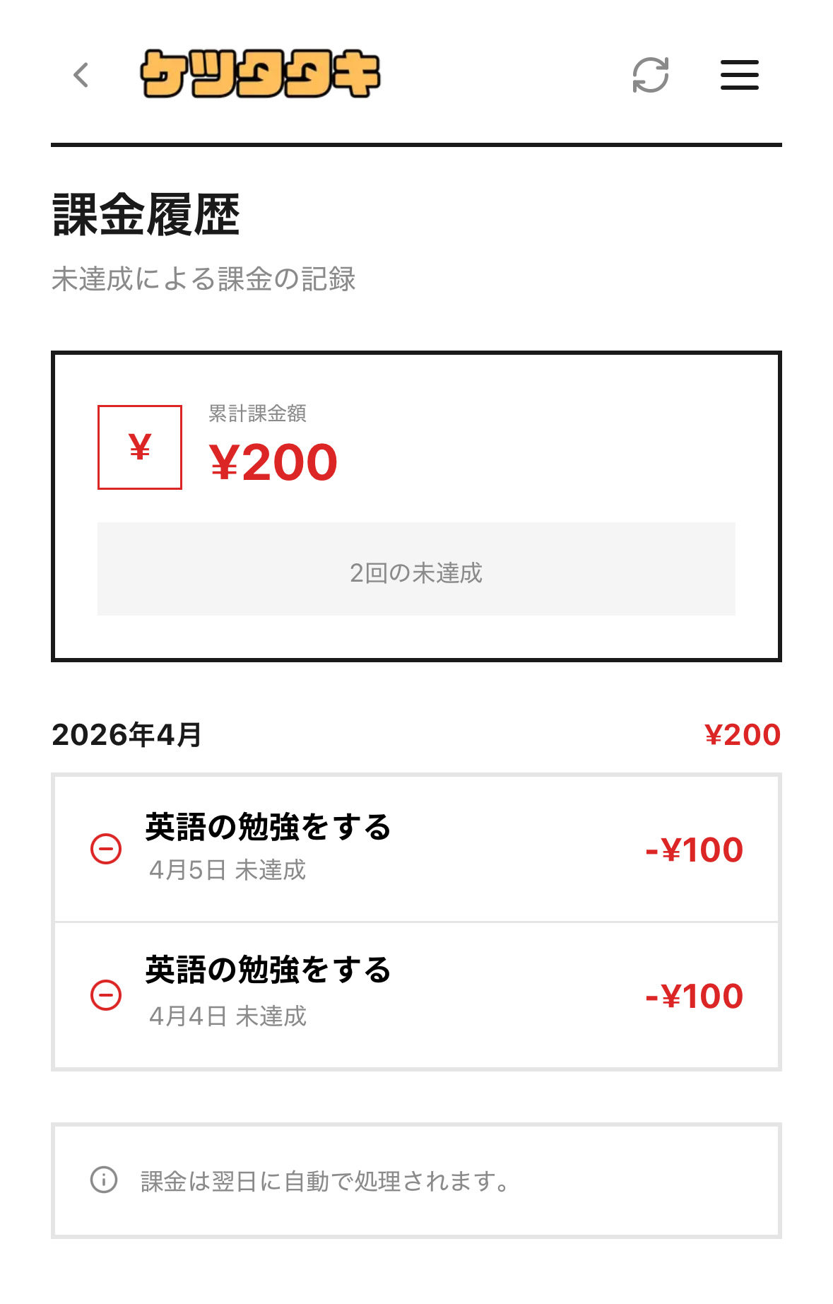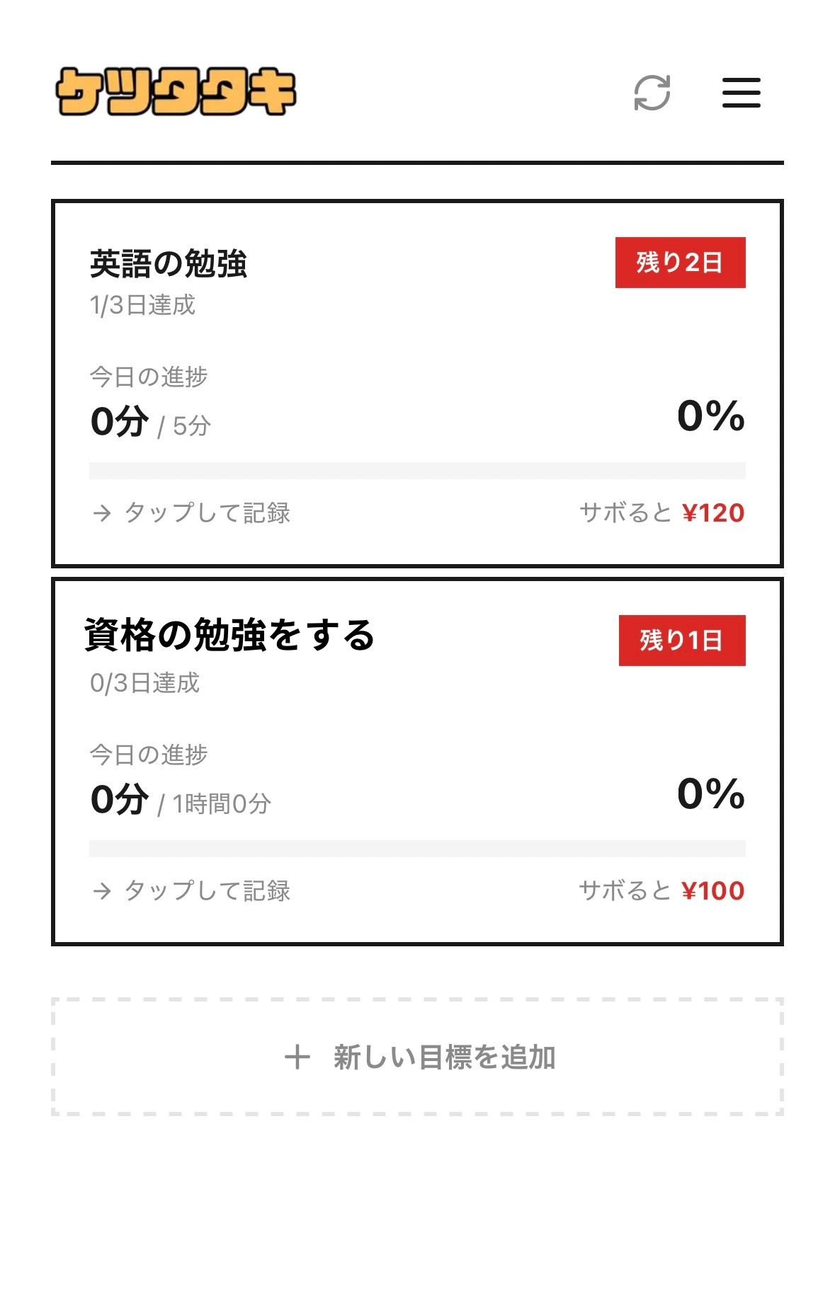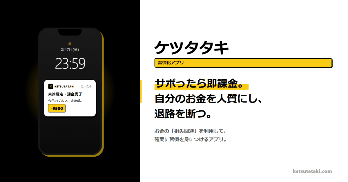 ケツタタキは「サボったら課金される」セルフマネジメントツールです。 目標を設定して、達成できなかったら自ら設定した金額の課金(¥100〜¥2,000)が発生します。 やる気に頼らず、お金の痛みで自分を動かす仕組みです。 ▼ 使い方 1. 毎日、何を何本やるかを決める(例:毎日、英語を30分勉強する) 2. サボった時に課金される額を設定する(例:¥500) 3. 毎日、作業している間、タイマーを回す 4. 達成できなかった日は、設定した金額が発生する やるしかない状況を自分で作る。それがケツタタキです。 ▼ 料金 ・無料プラン:目標1つまで、7日間まで、一度目標が終わると、7日間新しい目標が作れない ・PROプラン(¥980/月):目標無制限、最大365日、LINE通知、詳細分析 ・買い切りプラン(¥9,800):PROの全機能を永久利用 ▼ こんな人におすすめ ・ToDoアプリや習慣化アプリを入れても3日で開かなくなる人 ・やる気はあるのに行動に移せない人 ・自分に甘い自覚がある人 開発者自身が三日坊主で困っていたので、自分が一番使いたいサービスとして作りました。