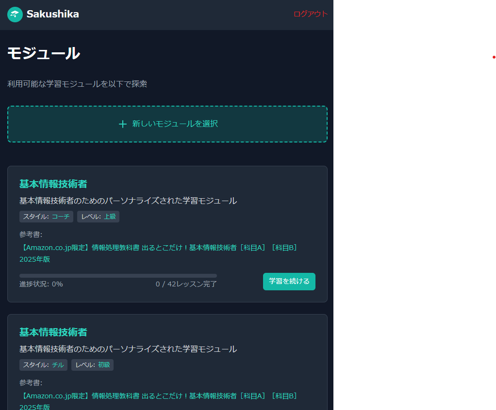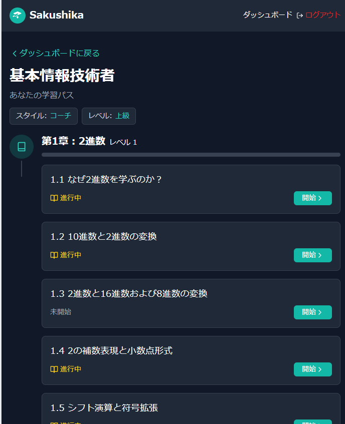 Sakushikaは、資格参考書の内容を短時間で学べる小分けコンテンツに変換。 スキマ時間に効率よく学習して、確実に資格取得を目指せます。 参考書での勉強でこんな悩みありませんか? ①電車で開きづらい ②どこまでやったかわからない ③理解が難しい ④進捗が実感しづらい ⑤ちゃんと理解できているかわからない ⑥モチベーションが続かない Sakushikaを使えばこんな学習が可能に! ★実際の参考書をもとに生成 あなたが実際に使用している参考書の内容をもとにAIが学習コンテンツを生成。本の内容を忠実に再現しながら、理解しやすい形式に最適化します。信頼性の高い内容で安心して学習できます。 ★3~5分で学べるようにコンテンツを細分化 長い章や節を3~5分で学べる小さなユニットに分割。各ユニットの最後には理解度テストを用意し、学んだ内容をすぐに確認できます。短時間で集中して効率よく学習できます。 ★スマホでスキマ時間に少しずつ学べる 通勤・通学時間や休憩時間など、ちょっとしたスキマ時間を有効活用。スマホで簡単にアクセスでき、どこでも学習を進められます。継続的な学習習慣が身につき、効果的に知識を定着させられます。 ★どこまで学習できているか一目瞭然 分かりやすい進捗管理システムで、学習の進み具合や理解度を視覚的に確認できます。達成感を味わいながら学習を進められるため、モチベーション維持にも効果的です。