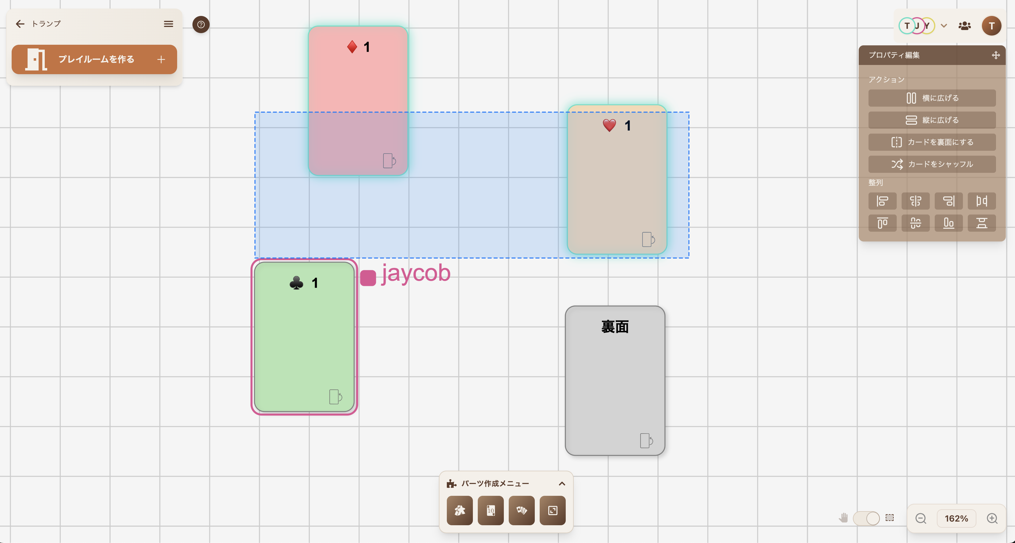 オンラインでボードゲームを試作し、何度もテストプレイできるサービスです。 [ざっくりまとめ] ・ボードゲームのアイデアを“すぐ作って試せる”オンライン試作ツール ・カードの裏表・山札・手札など、ボードゲームに必要な要素を自然に扱える ・試作→テスト→修正のサイクルを高速化し、物理試作までの負担を大幅に軽くする