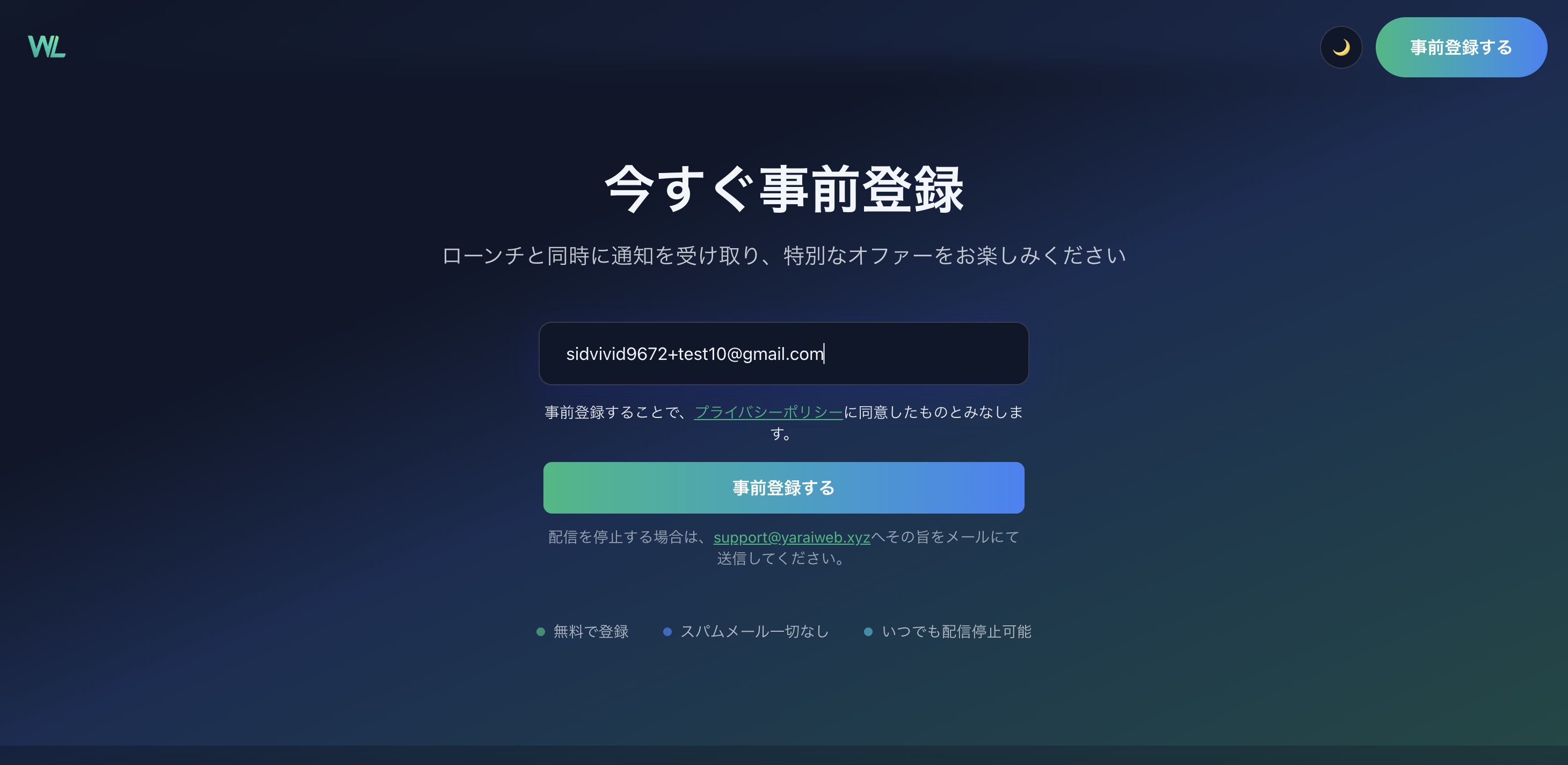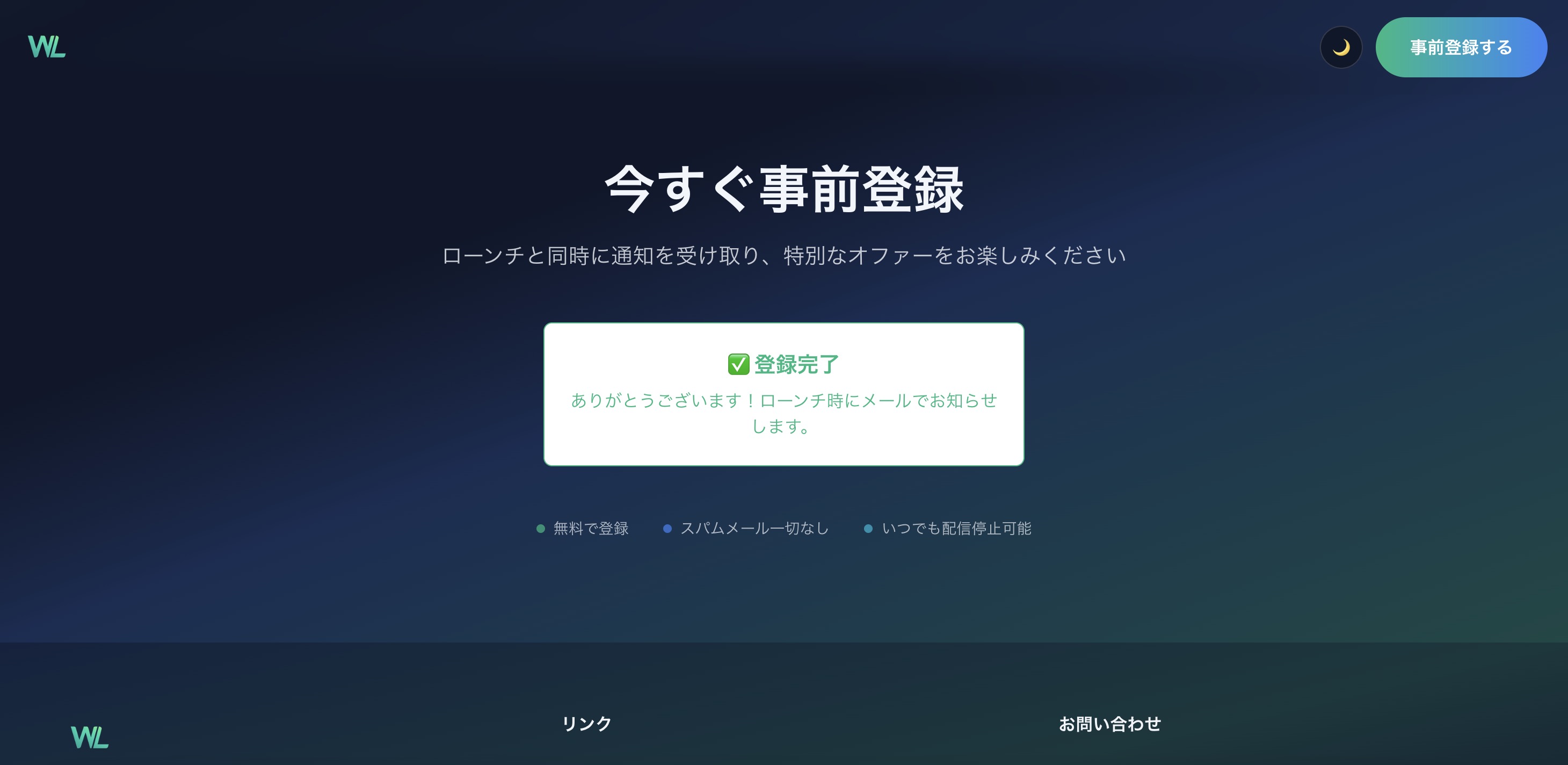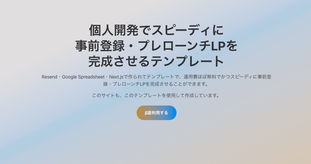 ## 個人開発で事前登録LPを作るの、めんどくさい サービス開発に時間を取られていて手が回らないし、事前登録機能・メール送信機能の作成など、意外とめんどくさい。 予算が限られているので、サーバー代やデータベース代などの運用費をかけたくない。。 ## そんな悩みを解決 - メール送信・データ保存機能完備 → データベースではなく、Google Spreadsheetを使用しており、データベース不要で始められます! - Resend・Google Spreadsheet・Next.js・Cloudflare workersで構成されており、ほぼ無料でできる! - Vibe Coderが使いやすい! → Next.js・Tailwind CSS・TypeScriptで作られているので、AIが使いやすい構成 ## 特長 - 買い切りプランで使い放題 → β版は980円で考えています(その後は2980円) - シンプルな構成でカスタマイズしやすい → Tailwind CSSのみで見た目を作っており、UIライブラリに依存していません。お好みのUIライブラリを使ったり、AIに書いてもらうなどして見た目をカスタマイズしやすい!