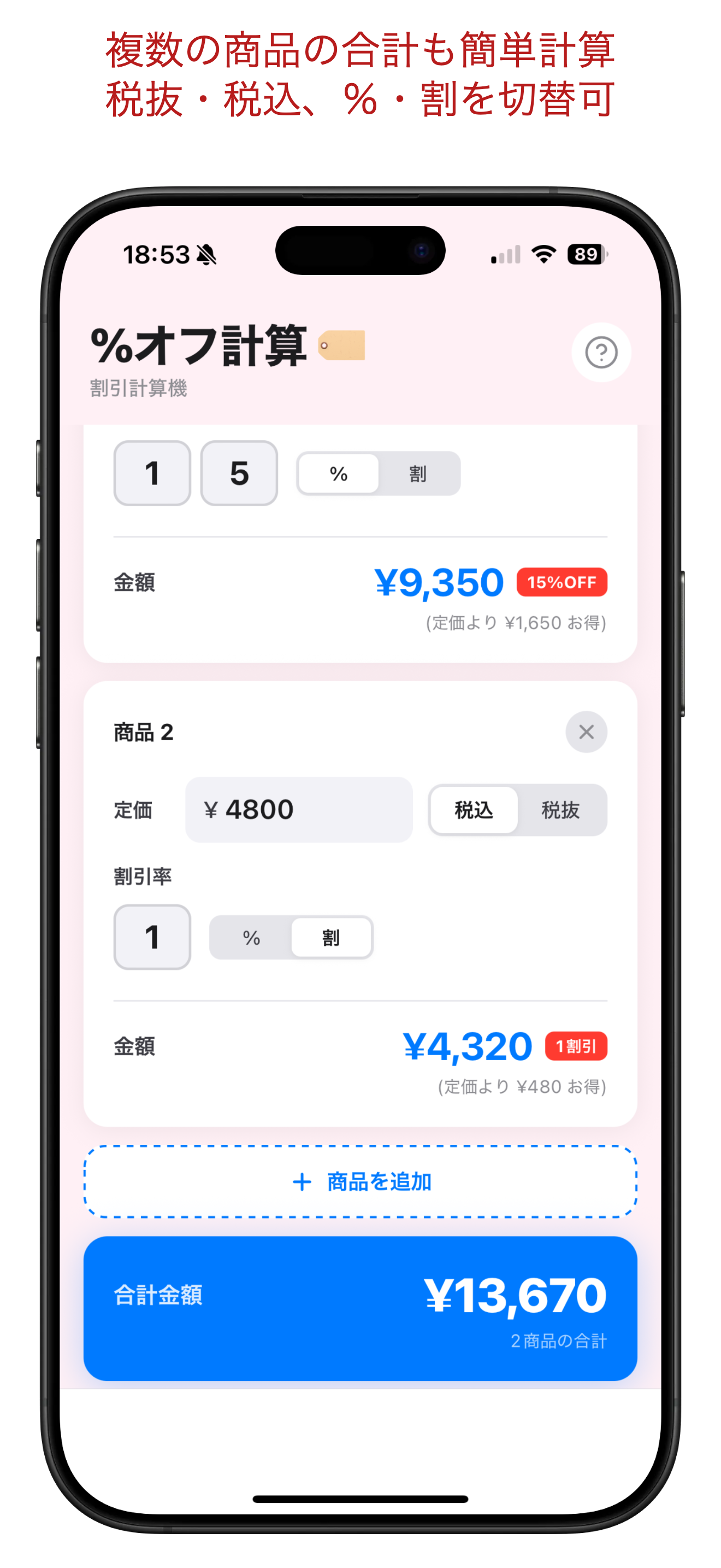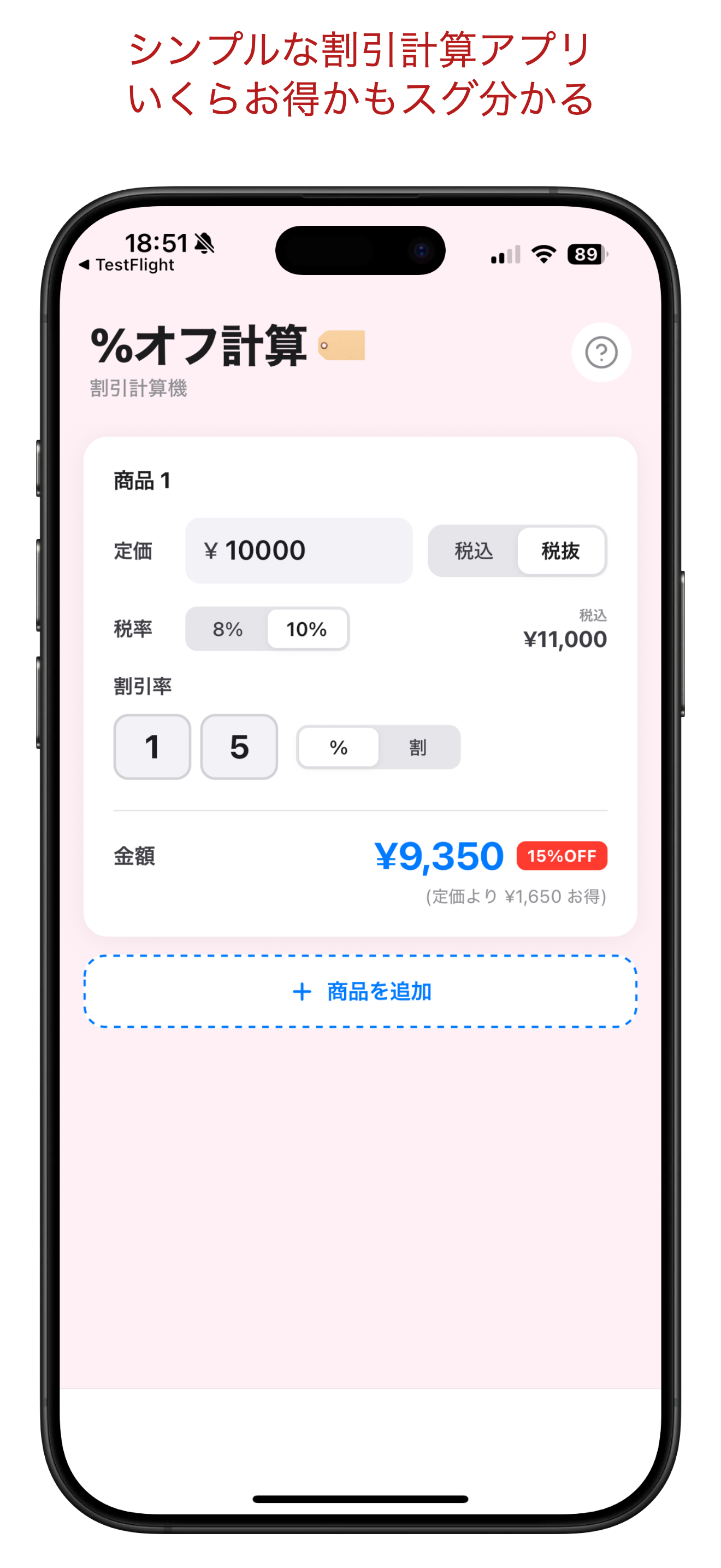 %オフ計算は、超シンプルな無料の割引計算アプリです。 アカウント作成不要、すぐ使えます。 定価を入れ、割引率を入力すると、金額といくらお得になったのかがすぐ表示されます。 必要に応じて、税込・税抜、%と割の切り替えも可能。 複数商品の価格を比較したり、合計金額を表示することもできるようになっています。