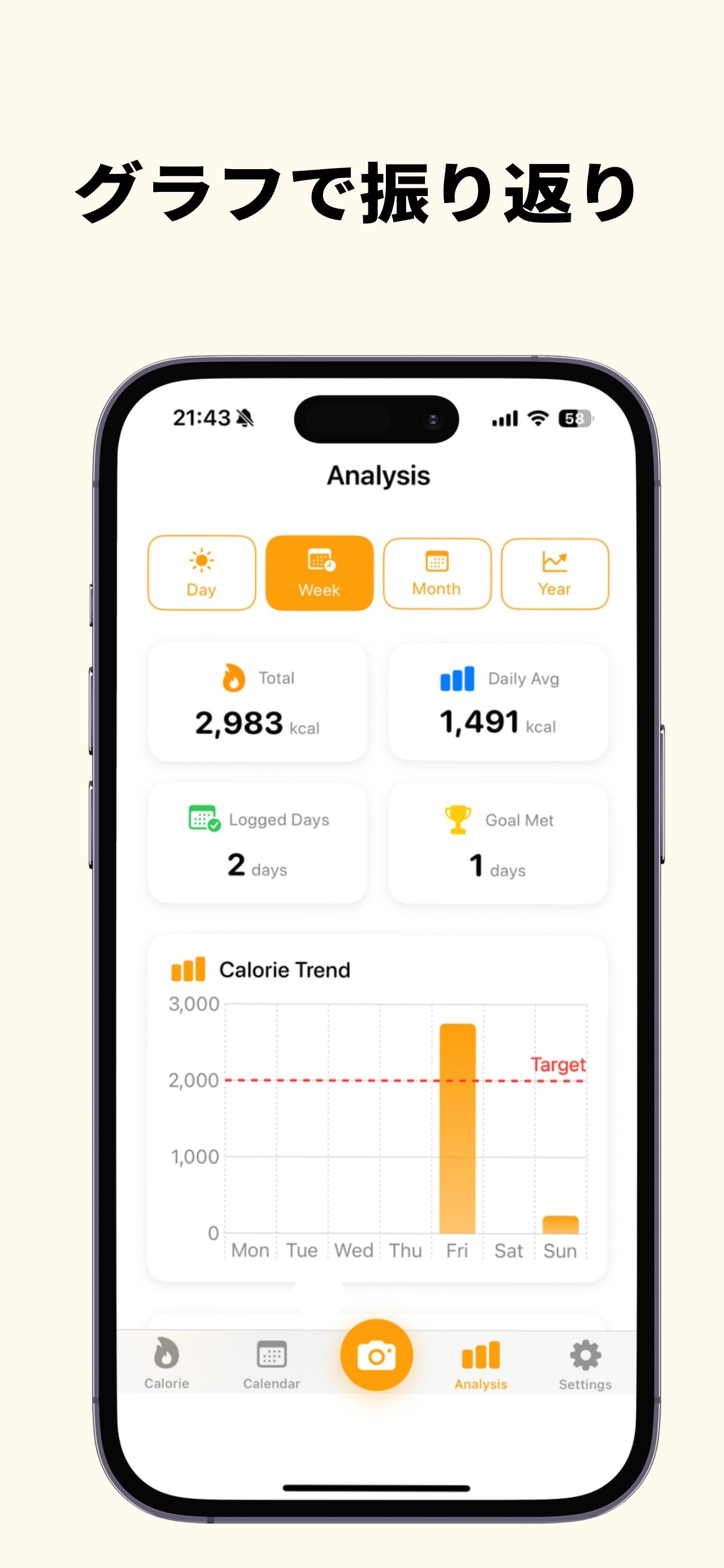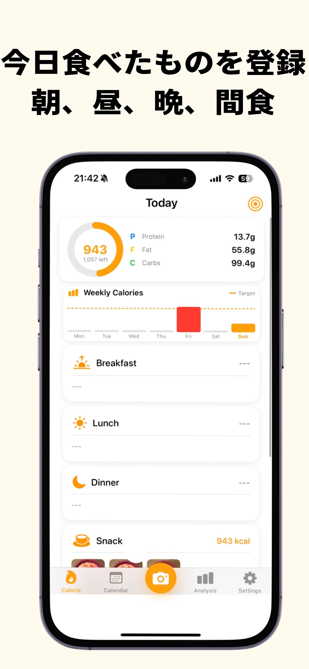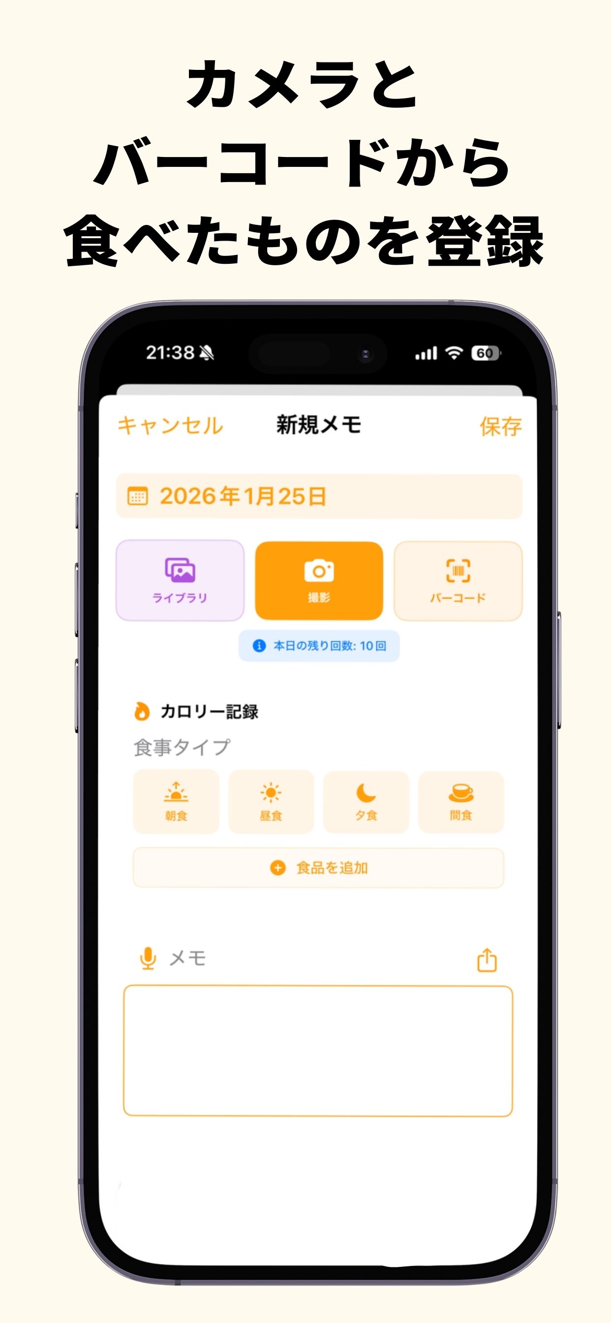 【撮るだけでカロリー管理】 食事を撮影するだけで、AIが自動でカロリーを計算。面倒な入力作業は一切不要です。 【主な機能】 ・AI食事認識:写真からカロリーを自動計算 ・バーコードスキャン:市販品の栄養成分を自動取得 ・PFC記録:タンパク質・脂質・炭水化物も管理 ・目標設定:1日の目標カロリーを自由に設定 ・進捗リング:達成度を視覚的に確認 ・カレンダー:過去の記録を簡単に振り返り ・分析:日・週・月・年ごとの推移を確認 【こんな方におすすめ】 ・食事記録が続かなかった方 ・カロリー計算が面倒だと感じていた方 ・ダイエットを始めたい方 ・健康的な食生活を送りたい方 【使い方】 1. 目標カロリーを設定 2. 食事を撮影 3. 進捗を確認 たったこれだけ。今日からカロリー管理を始めましょう。
