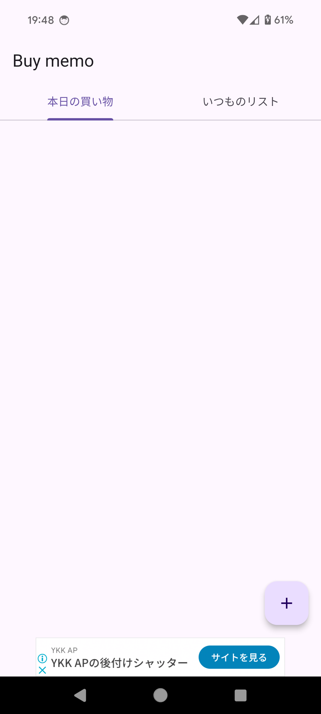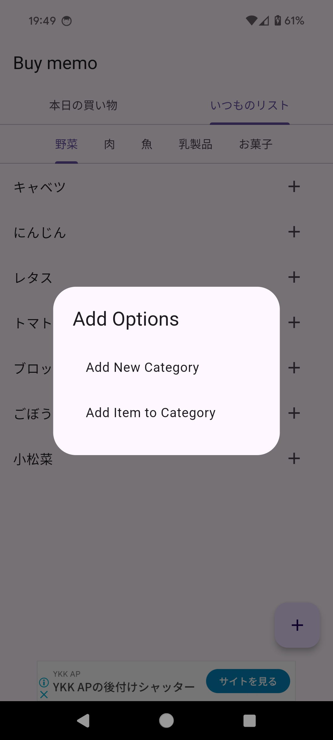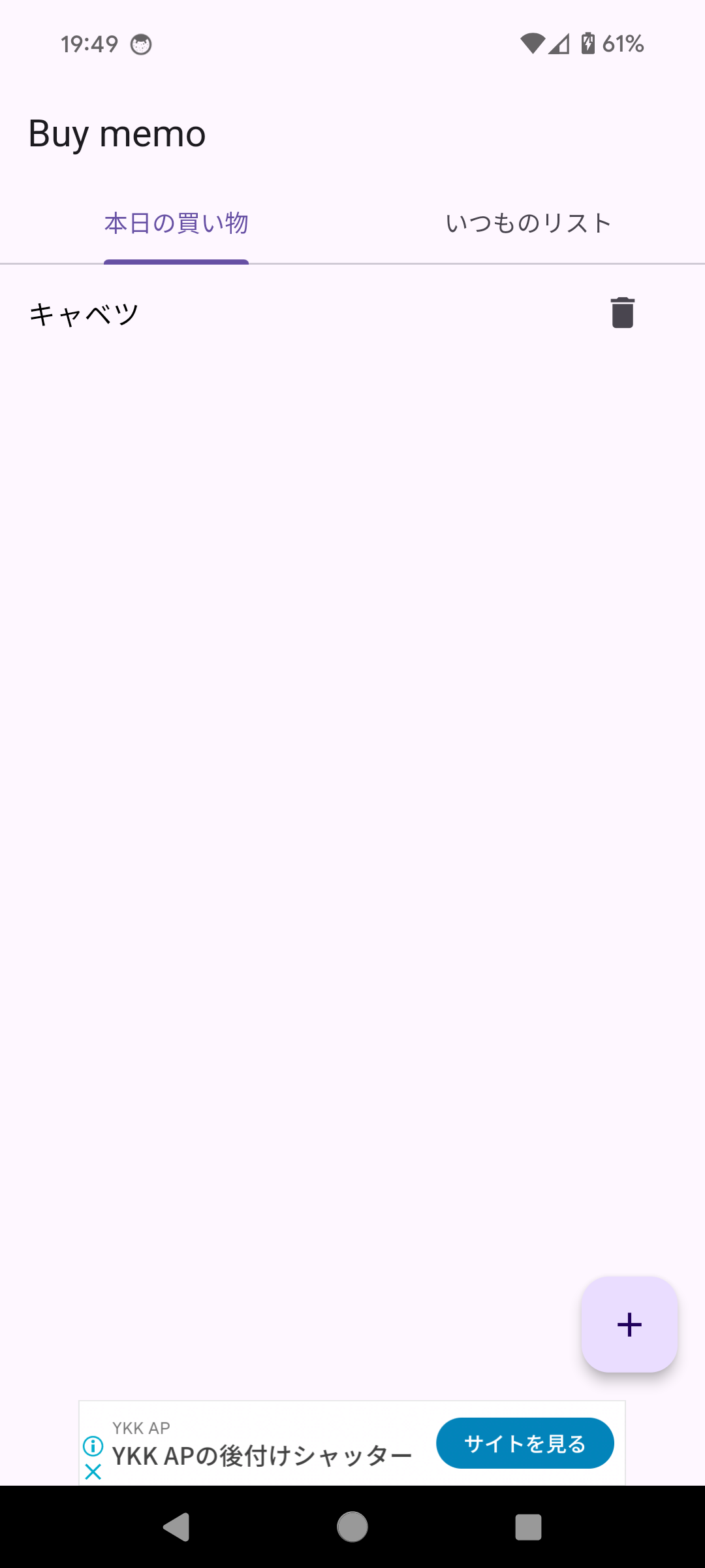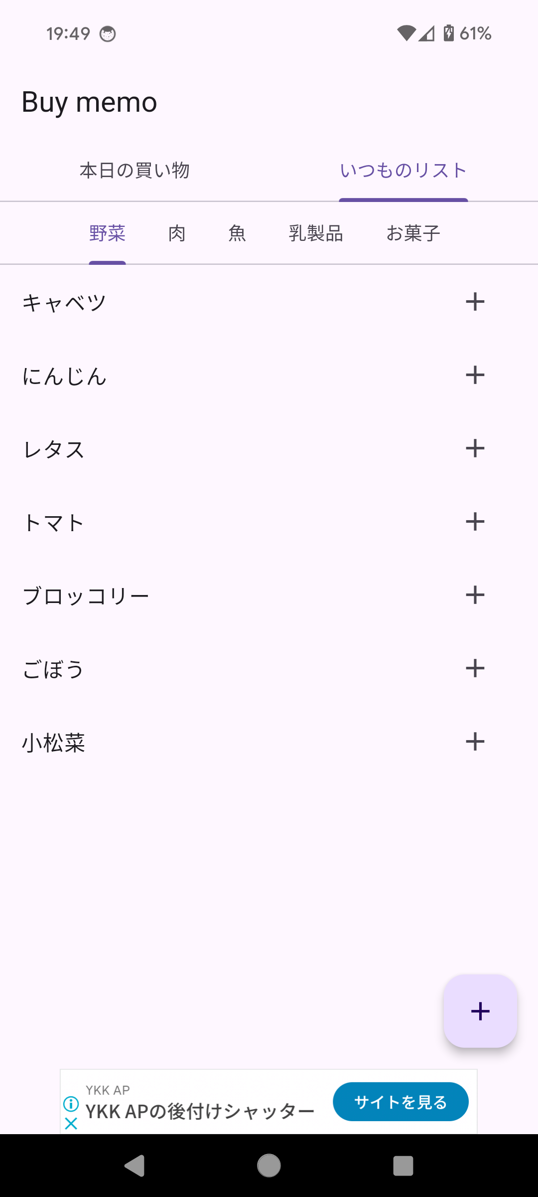毎日購入する買い物をメモします。本日の買い物といつものリストがあり、いつものリストで内容を登録しそこから選択すると、本日の買い物に登録されます。 それぞれリストの削除方法は長押ししたり、ゴミ箱ボタンを2度押下(1度目は横線)したりとあります