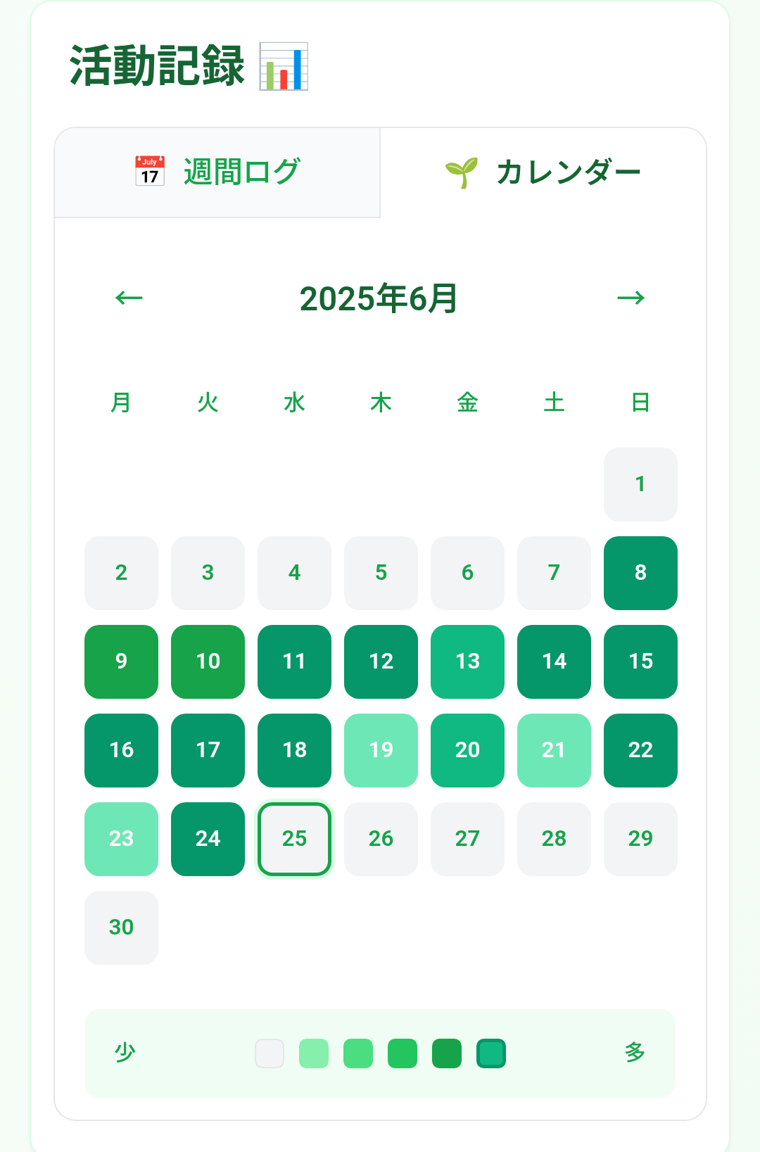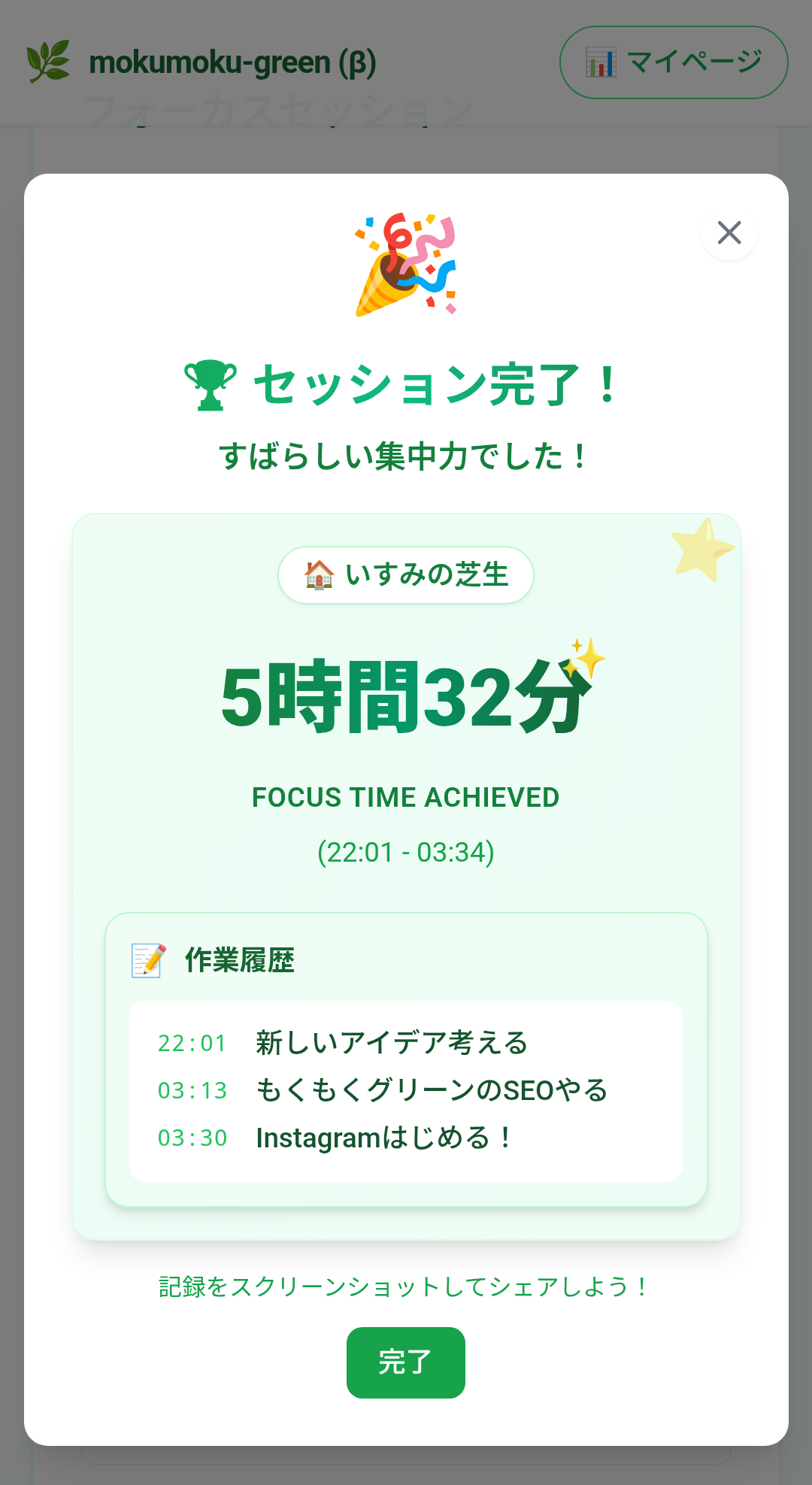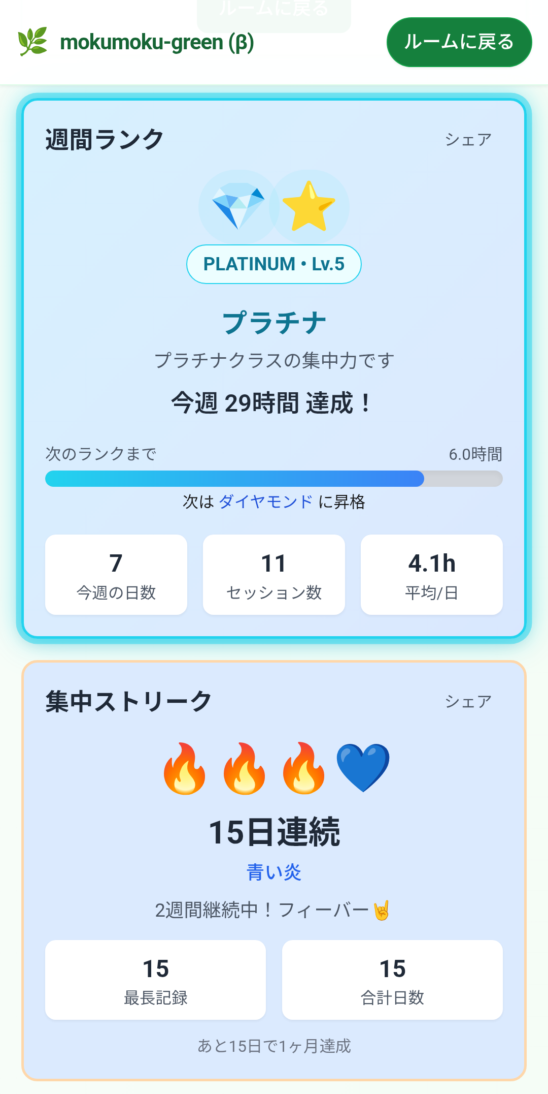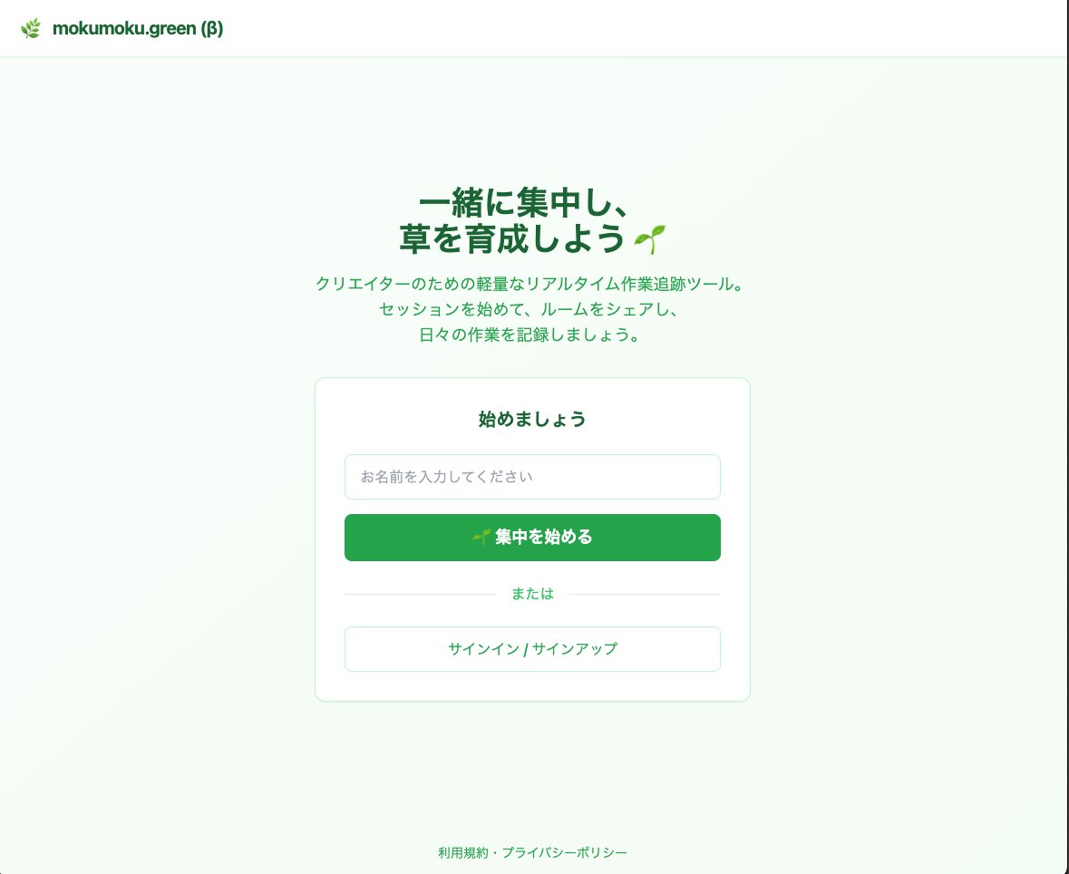 〜 🌱 作業に集中して、緑を獲得しよう 〜 mokumoku-green は、作業や学習の時間をリアルタイムで記録できる軽量Webアプリ。 集中した時間とやっていたことを、あとから見返せるようにカレンダーに可視化します。 ・作業開始で自動記録、ステータス更新で「何をやっていたか」も記録 ・URLをシェアすれば、一緒に作業する仲間の存在が励みになる ・進捗や継続日数は、GitHub風のカレンダーやログでひと目で確認可能 --- 💡 こんな悩みを解決します ・「集中していた記録を残しておきたい」 ・「進捗を目に見える形で振り返りたい」 ・「一人作業だと気が緩む…」 ・「誰かと一緒にがんばっている感覚が欲しい」 --- 🏢 バーチャルコワーキング体験 ・【作業リズムの共有】 - 他の人が頑張っている様子が自然と伝わる ・【ゆるいつながり】 - 挨拶や応援など、無理のない交流も可能 ・【必要なときだけ共有】 - ひとりでも、誰かとでも、自由に使える --- 🌱 基本機能 ✨ ワンクリックでセッション開始&自動記録 🤝 ルーム機能でステータス共有とチャット 🗓️ 週間・月間のログで作業を見える化 👤 ニックネームだけでゲスト利用OK、ブラウザ完結でアプリ不要 一人の集中にも、誰かとの並走にも。気軽に使える作業記録アプリです! --- 🔑 コンセプト ・スロースターター向けの長時間集中に対応 ・タスクやスケジュールは管理せず、気分でやりたいことを決められる記録方法 ・ADHDコミュニティで流行っている集中テクニック "Body Doubling" を採用