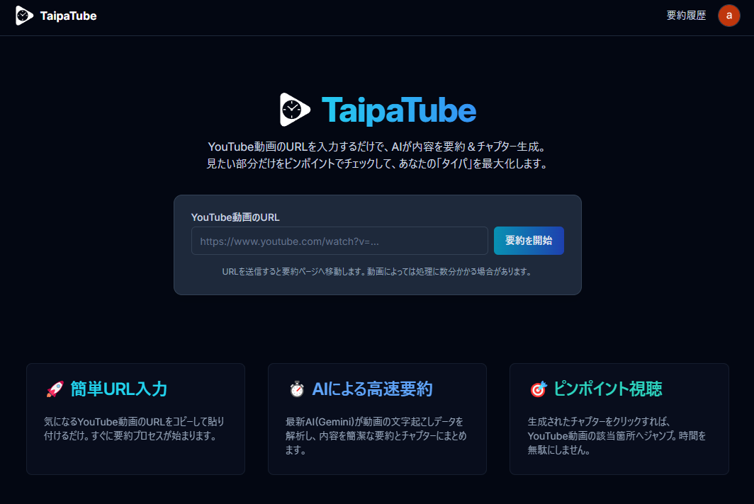 YouTube動画のURLを入力するだけで、AIが内容を要約&チャプター生成。 見たい部分だけをピンポイントでチェックして、あなたの「タイパ」を最大化します。 ※現在はFreeプランのみ利用可能です 🚀 簡単URL入力 気になるYouTube動画のURLをコピーして貼り付けるだけ。すぐに要約プロセスが始まります。 ⏱️ AIによる高速要約 最新AI(Gemini)が動画の文字起こしデータを解析し、内容を簡潔な要約とチャプターにまとめます。 🎯 ピンポイント視聴 生成されたチャプターをクリックすれば、YouTube動画の該当箇所へジャンプ。時間を無駄にしません。