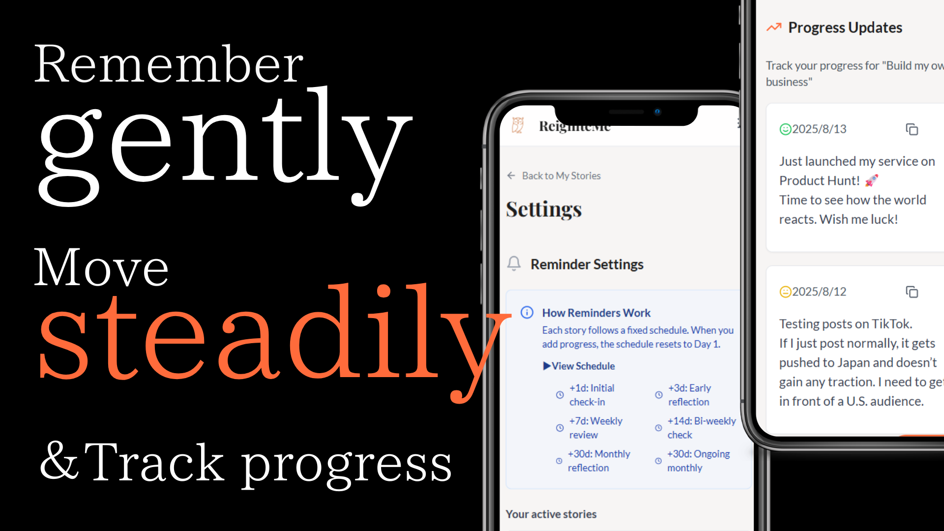 2年前に死にかけました。 そこで感じた強烈な後悔を、二度と忘れないためのWEBサービス。※UIは英語版のみ ReigniteMeは、人生をやり直したい人のためのプライベートなリマインド&進捗トラッキングサービスです。※一般公開も可 ・ただのウィッシュリストではありません ・とんでもないターニングポイントで見えた本当にやりたいこと(MAX3つまで)だけ登録 ・記録した誓いを優しくリマインド ・その時の熱量に合わせて頻度を調整 ・進捗も合わせて記録 急かさず、でも確かに背中を押してくれる、あなた専用の伴走者です。