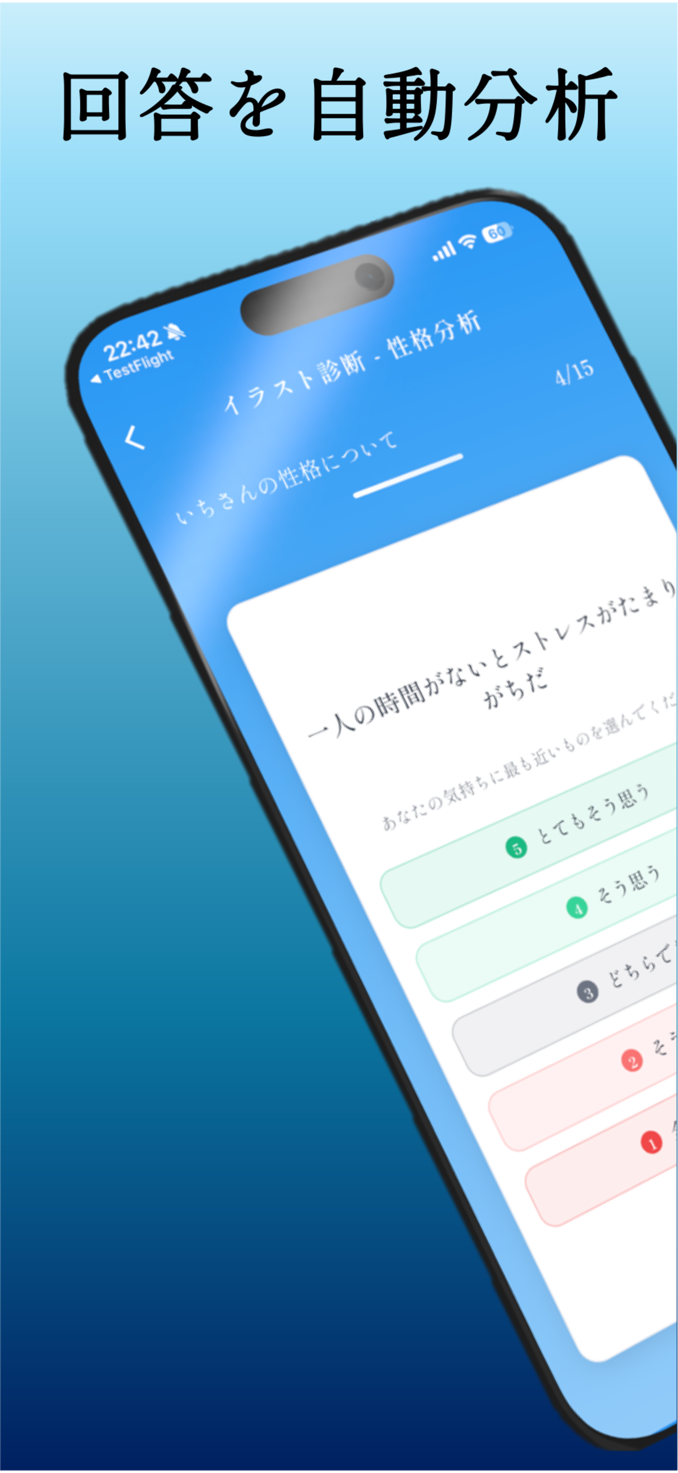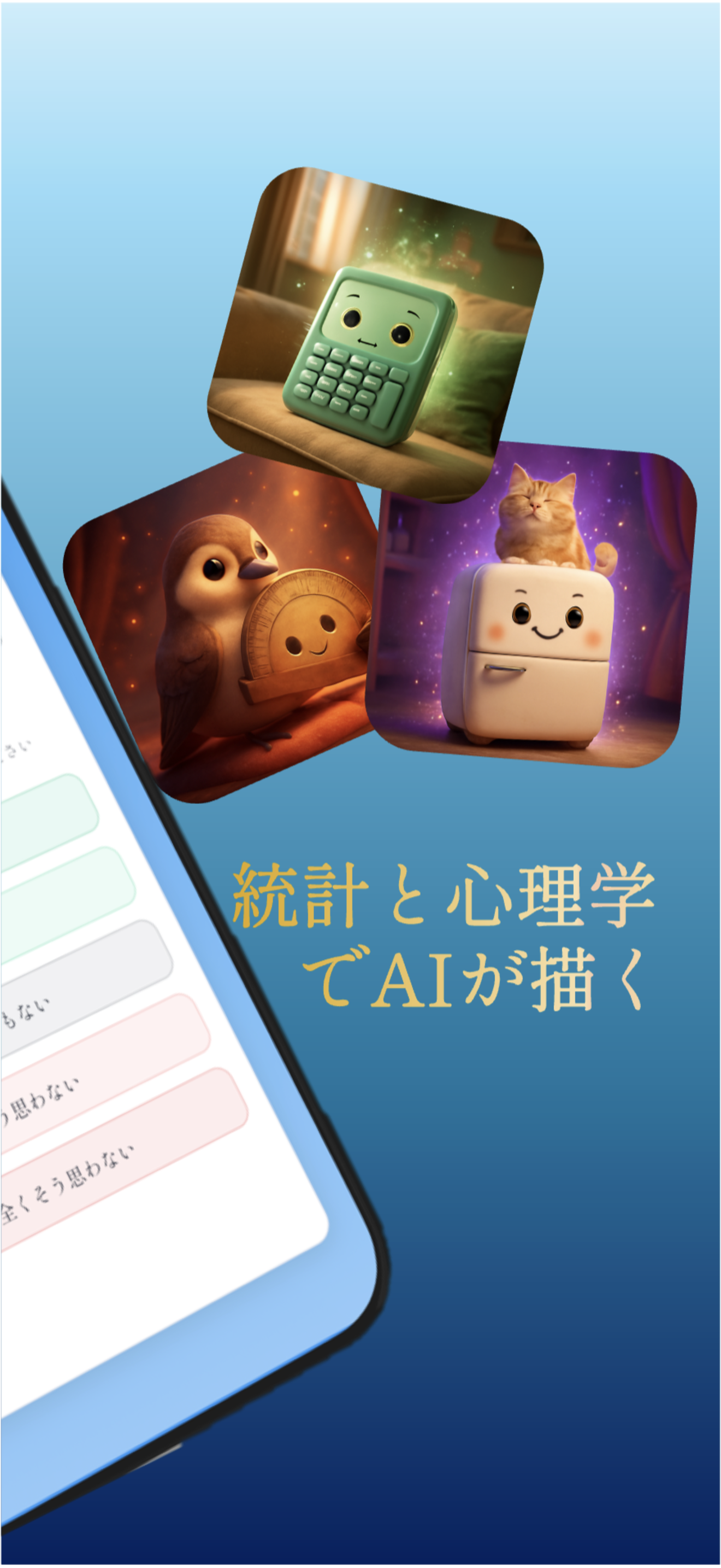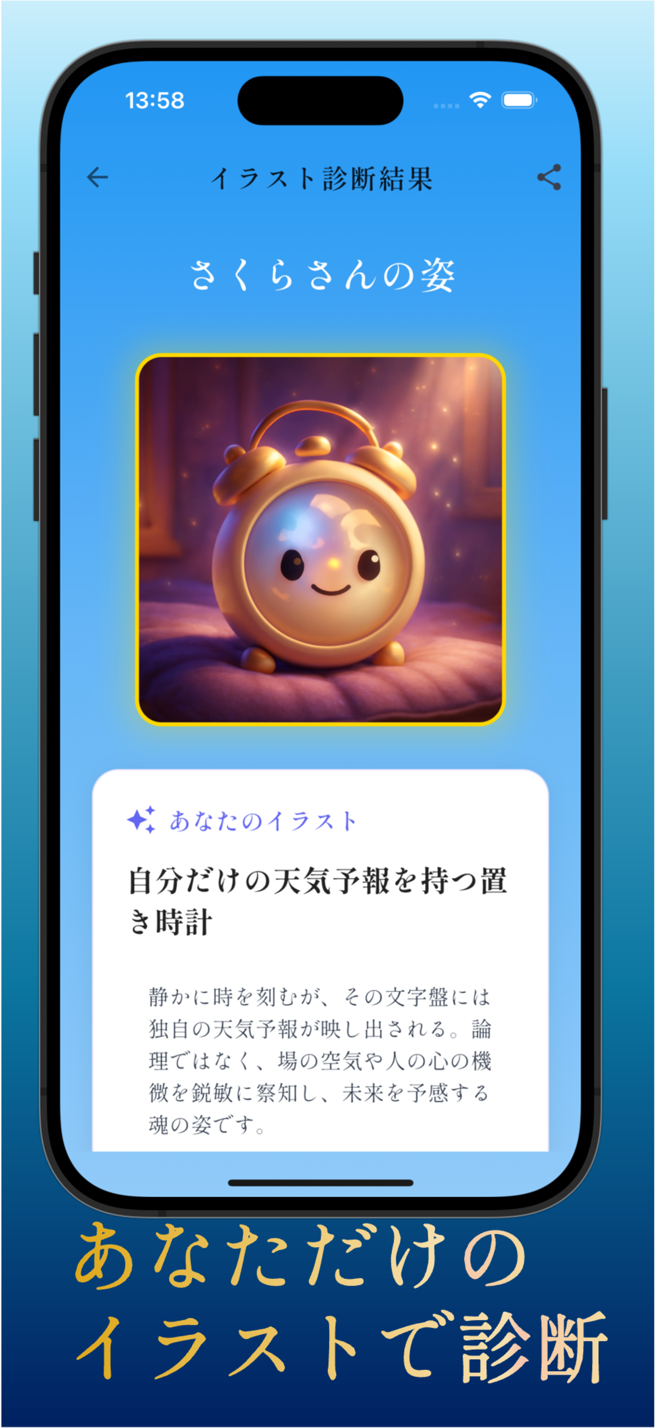 生成AIを用いてあなたのパーソナリティ診断を行います。 診断結果はオリジナルイラストとともにお届け。 想像以上に当たるものになりました。 ◆ 3つの機能 パーソナリティ診断 - AIによるイラスト付き性格診断 ・選択式質問と記述質問に基づく分析 ・物や動物でその姿を喩える新鮮なアプローチ ・保存・シェア可能なレポート イラスト心理分析 ・お題に沿ってあなたが描くイラストから現在の心理状態を分析 ・あなたが無意識に描くあなたの心をAIが読みとく 相性診断 (Premium) ・2人の性格診断から導き出す相性 ・心理学に基づく多面的な関係性評価 ・家族、友人、パートナーとの関係性を物に喩えて分析