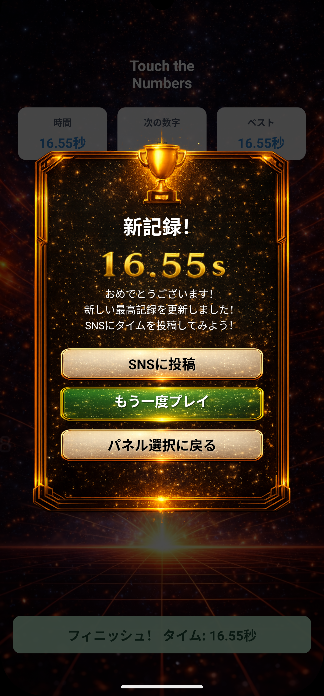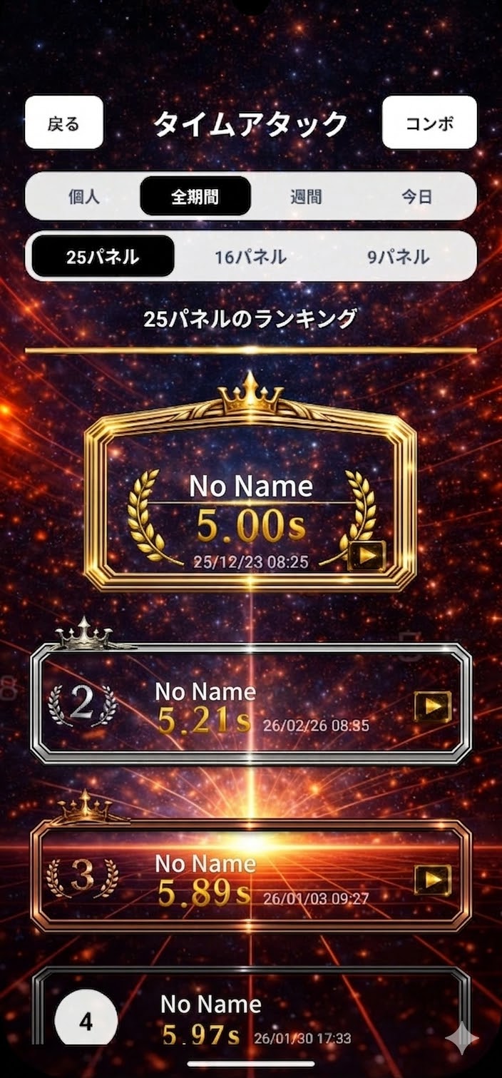 数字を1から順番にタップして最速タイムを競うシンプルな脳トレゲームです。 ■ 2つのモード ・タイムアタック:制限時間内にどれだけ素早くクリアできるか ・コンボアタック:連続ミスなしでどこまで伸ばせるか ■ 特徴 ・オンラインランキングで世界中のプレイヤーと競える ・デイリーミッション・週替わりチャレンジで毎日遊べる ・配色・表示スタイルのカスタマイズ対応 ・7言語対応(日本語・英語・中国語・フランス語・スペイン語・ドイツ語・アラビア語) スキマ時間に気軽に始められて、やり込むほど記録が伸びる脳トレゲームです。