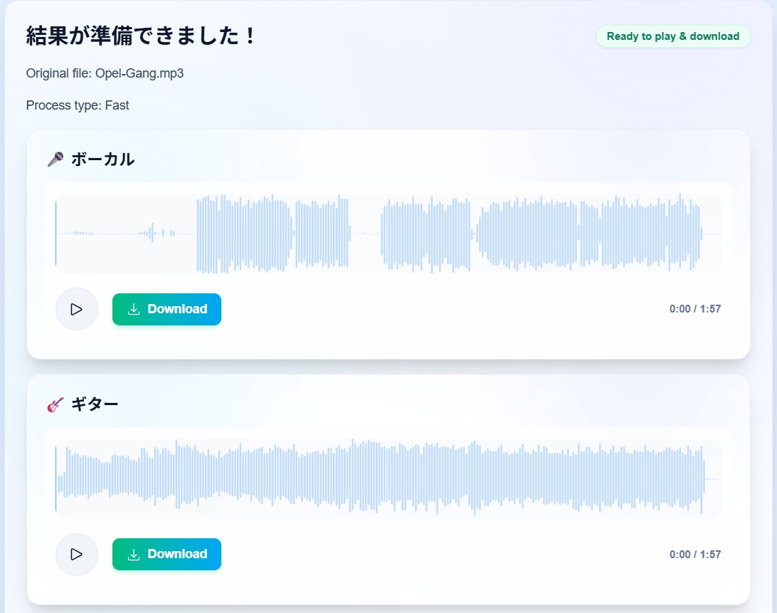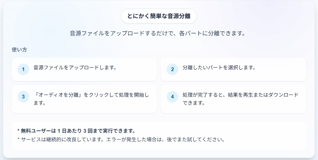 楽曲のパートを分離してくれます。 [ボーカル/ベース/ドラム/その他] を選択すると、そのパートだけを分離したトラックと、そのパート以外をミックスしたトラックを生成してくれます。 ミュージシャンや音楽制作にはもちろん、音楽好きな方にもどうぞ。 激安サブスクリプションもあり。