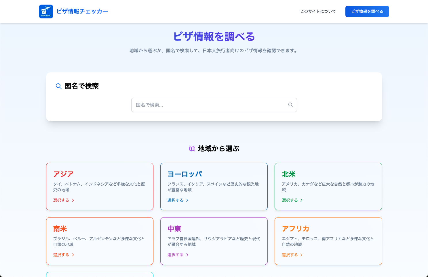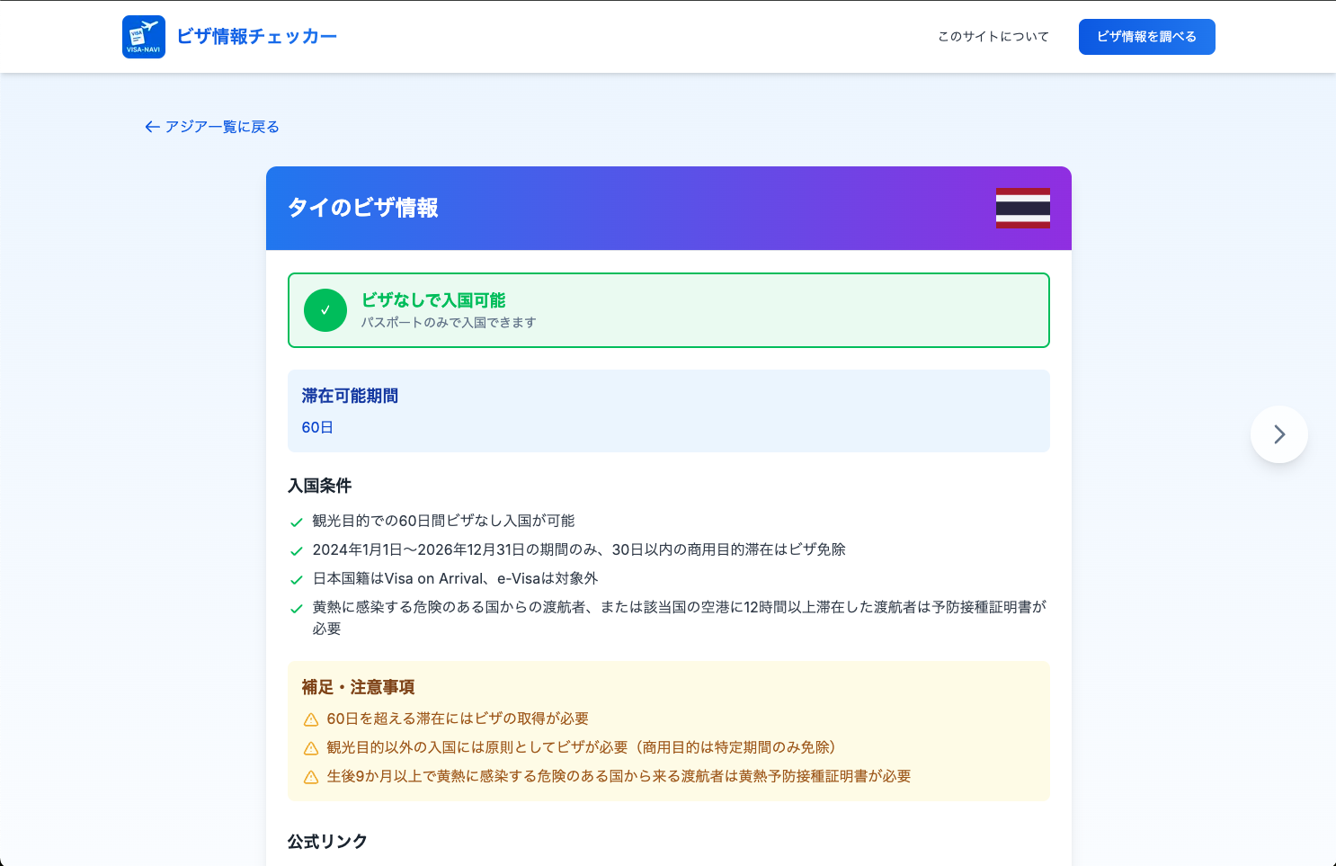 日本人旅行者向けの国別ビザ免除・ビザ必要情報を簡単に検索できるサービスです。 世界各国のビザ要件、滞在可能日数、入国条件などを確認できます。