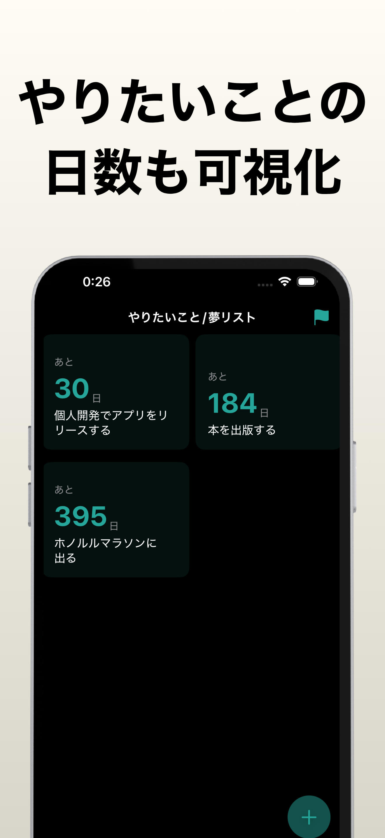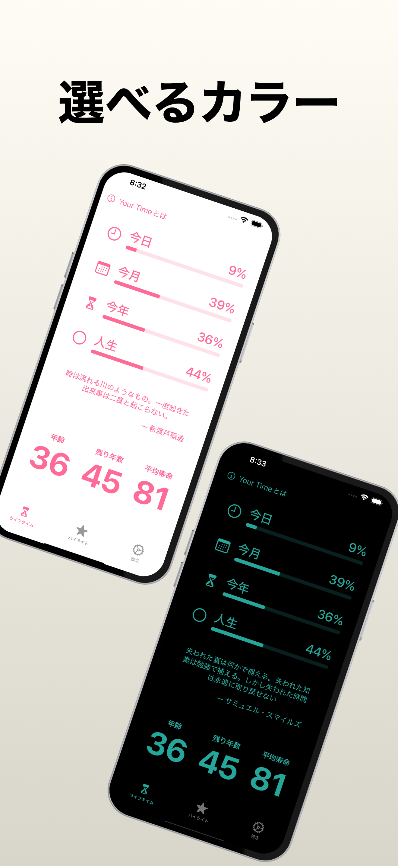 「スマホをいじって1日が終わってしまった…」 そんな経験、ありませんか? けれど、あなたの人生は思っているよりも、ずっと短い。 『Your Time』は、あなたの“残り時間”を、進捗率とプログレスバーで視覚化し、 人生の有限性に気づかせてくれるアプリです。 残り時間を見て、ショックを受けるかもしれません。 それでも、本気で人生を変えたいあなたにこそ、このアプリは力を発揮します。 限られた時間を意識することで、目標や夢に集中でき、 “やるべきこと”ではなく、“本当にやりたいこと”を大切にできるようになります。 「若い頃、僕の時間は未来へ向けて無限にあるように思えた。 今、僕は終末の時間から逆算する。 すると、人も風景も、そう、何もかもが違って見えてくる。」 ――蜷川 幸雄 今日という一日を、意識的に、意味のあるものに。 『Your Time』は、あなたの人生を整えるための、シンプルかつ本質的なツールです。 【主な機能】 ■ 人生の残り時間をリアルタイムに表示 統計に基づく平均余命から、あなたの「残された時間」を表示します。 ホーム画面のウィジェットにも対応しており、アプリを開かずにいつでも確認できます。 ■偉人の名言でモチベーションアップ 50以上の「時間」に関する名言も収録。 毎日を前向きに整える言葉が、心の軸を整え、行動の後押しになります。 名言は、ロック画面ウィジェットに設定可能。 スマホを見るたび、あなたにとって大切なことを思い出せます。 ■ やりたいこと/夢リストの管理 「アプリをリリースしたい」「マラソンに出たい」「本を出版したい」 そんな夢に期限を設け、目標までの残り日数を一目で可視化。 無料プランでは3つまで、プレミアムプランでは無制限に登録できます。 ■ ハイライト登録(1日1つ、あなたの“本当に大切なこと”に集中) 『Your Time』では、ToDoリストに埋もれない、人生における本当に大切な1つの行動を「ハイライト」として毎日登録できます。 一般的なToDoリストは、メールの返信、買い物、雑務など「今すぐやるべきこと」で溢れがちです。 しかし、それらに追われるだけでは、あなたの人生の本質的な目標や夢が後回しになってしまいます。 ハイライトでは、たとえば以下のような人生の意義ある行動に集中できます: • 「新しい習慣を始める」 • 「ポートフォリオを更新する」 • 「大切な人に感謝を伝える」 • 「読もうと思っていた1冊に集中する」 今日という一日を何に使うか。 その問いに、毎朝明確に答える習慣を作ることで、行動の質が大きく変わります。 「やるべきこと」よりも「やりたいこと」に、あなたの時間を使ってください。 たった一つに絞ることで、迷わず、ブレずに、一日を過ごすことができます。 ■ 毎日の時間の使い方を記録 集中度・エネルギーをログ化し、あなたの時間の“質”を可視化します。 毎日を振り返り、より良い明日につなげることができます。 ■ テーマカラーのカスタマイズ 自分らしい色で、気持ちよく時間を管理。 プレミアムプランでは全カラーテーマを利用可能です。 【こんな方におすすめ】 • 毎日が慌ただしく、時間が足りないと感じている方 • やりたいことに時間を使えていないと感じる方 • 人生の優先順位を見直したい方 • マインドフルネスや自己管理に興味がある方 【プレミアムプラン特典】 • やりたいこと/夢リストの登録数が無制限に • 全カラーテーマが利用可能に 【開発者より】 時間は、誰にとっても最も貴重な資産です。 『Your Time』は、あなたの残された時間を“意志ある時間”に変えるためのツールです。 ただ生きるのではなく、「あなたらしい人生」を生きるために。 その一歩を、今日から踏み出しましょう。