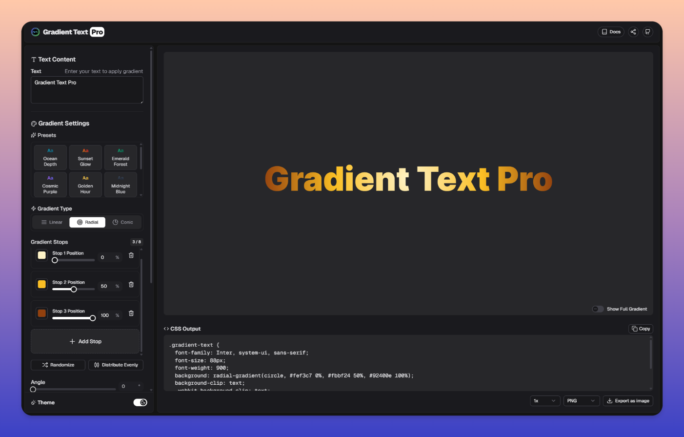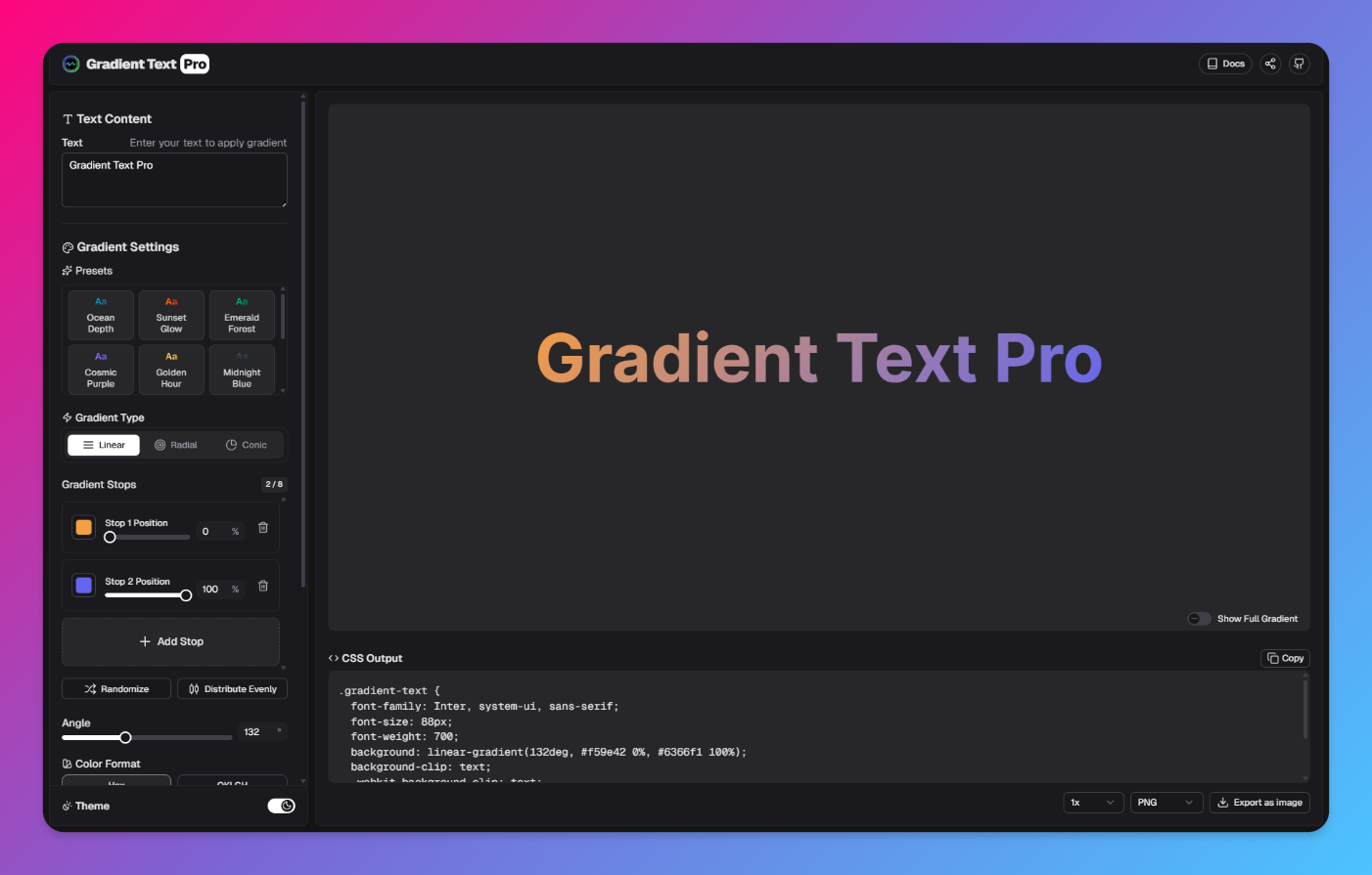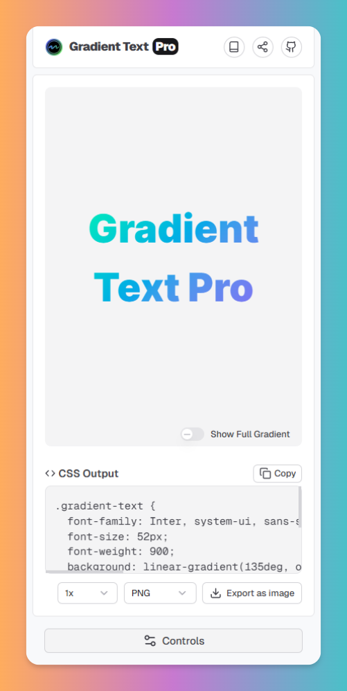 ✨ Gradient Text Pro - CSS グラデーションテキストジェネレーター 手軽にサクッと作れるグラデーション文字ジェネレーターです。デザインに詳しくなくても、見た目の良いグラデーション文字を直感的に作れて、そのままCSSや高画質画像として出力できます。 ・リアルタイムプレビューで変更が即反映。微調整が楽でストレスフリー ・複数のカラー停止点、角度、位置を自在にコントロールして複雑な表現も可能 ・フォントサイズ/太さ/文字間などタイポグラフィ設定で仕上がりを細かく調整 ・ワンクリックでCSSをコピー、PNG/WebP/SVGで高画質エクスポート ・HEXとOKLCHに対応。互換性重視も色味重視も選べる ・ダーク/ライト切替とプリセットで時短&使いやすさUP ・スマホでも快適に操作できるレスポンシブ設計 🛠️ 技術スタック ・Nuxt 4 ・Nuxt/UI ・Cloudflare Workers