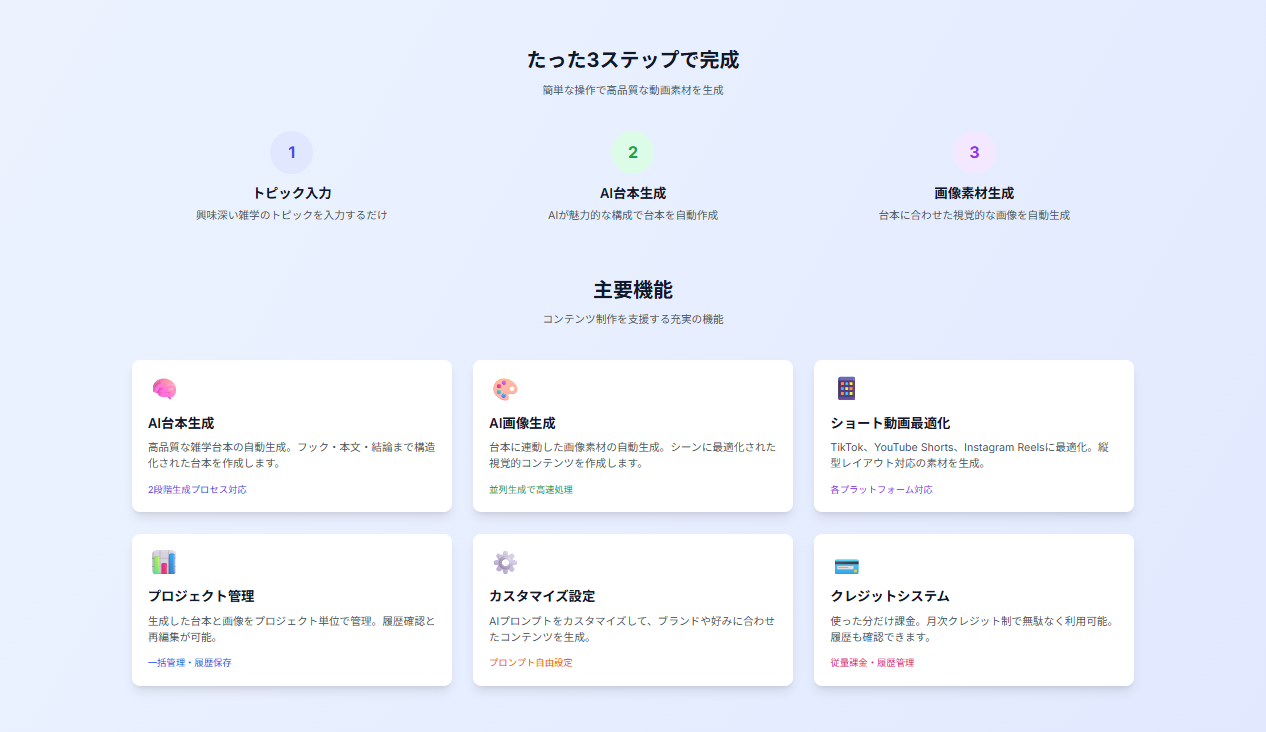 最新のAI技術を活用して、そこそこの品質の雑学ショート動画が自動生成されます。 マルチAIエージェントシステムによって台本作成から、動画素材生成までを一貫して行うことで台本の流れに沿った自然な画像が生成されます。し、 豊富なカスタマイズ機能で、各種プロンプトや、自然言語生成AIモデル、画像生成AIモデル、簡単に独自カスタマイズすることができるほか、VOICEVOX に対応しているので、ずんだモンや青山龍星などお好みの音声を選択して、語り速度やピッチも自由に調整可能。 本当に楽して稼げるAI副業が誰でも簡単にできるようにするために、今後もどんどんアップデートしていきます。