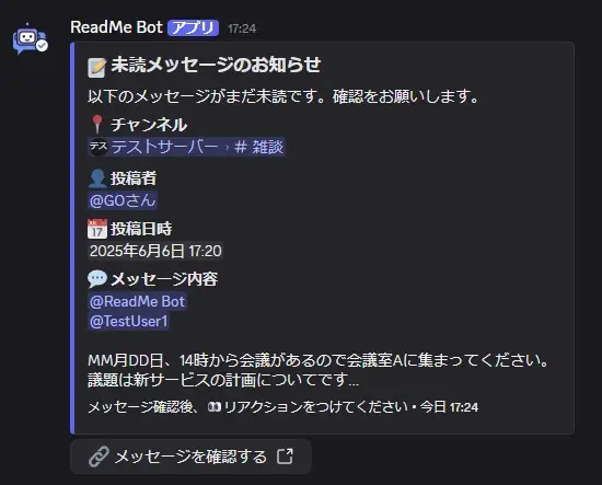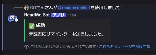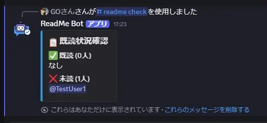 Discordのメッセージの既読管理とリマインドをするBotです。 既読管理したいユーザーまたはロールとReadmeBotをメンションすると、メッセージに自動でリアクションを付け、既読管理をします。 未読者にはDMでリマインダーを送信し、メッセージを既読するよう促します。