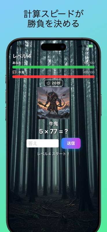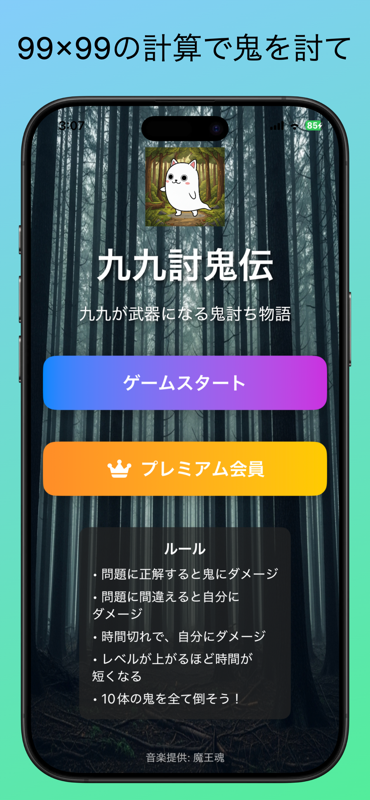 本アプリは、99×99までの掛け算問題に答えながら敵を倒して進む、計算力強化とアクション要素を組み合わせた脳トレゲームです。 テンポよく出題される計算問題に正解することで攻撃が発動し、ステージを攻略できます。 特徴 ・99×99までの掛け算で計算力を鍛えられる ・ステージごとに異なる敵や難易度 ・短時間で遊べるテンポ良い構成 ・繰り返しプレイしやすく、学習にも最適 計算力を鍛えたい方、脳トレを楽しみたい方、サクッと遊べるゲームをお探しの方に最適です。