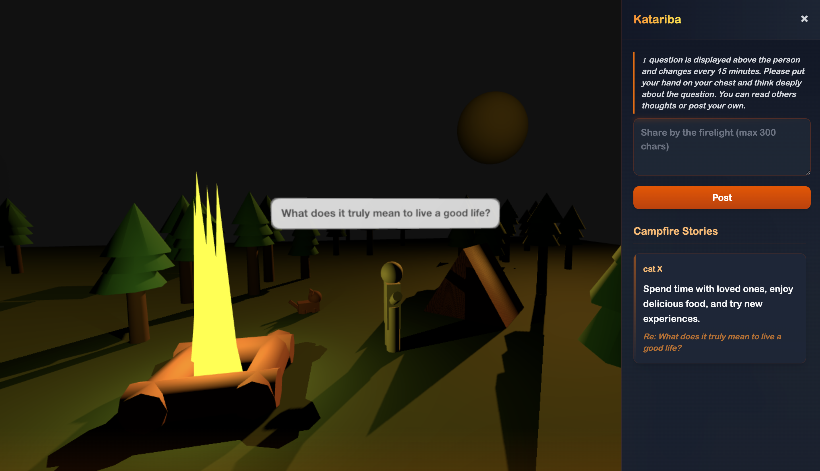「Kataribaとは?」 Kataribaは、忙しい日々を送る人々のための、心安らぐ空間を提供します。 人生の漠然とした疑問や、これまで深く考えなかったささやかな問いについて意見を交わすことで、新たな気づきを生みます。 森で友人とキャンプをしながら、"エモい"問いに関して語り合うような感覚を得ることができます。 ※現在英語のみの対応です