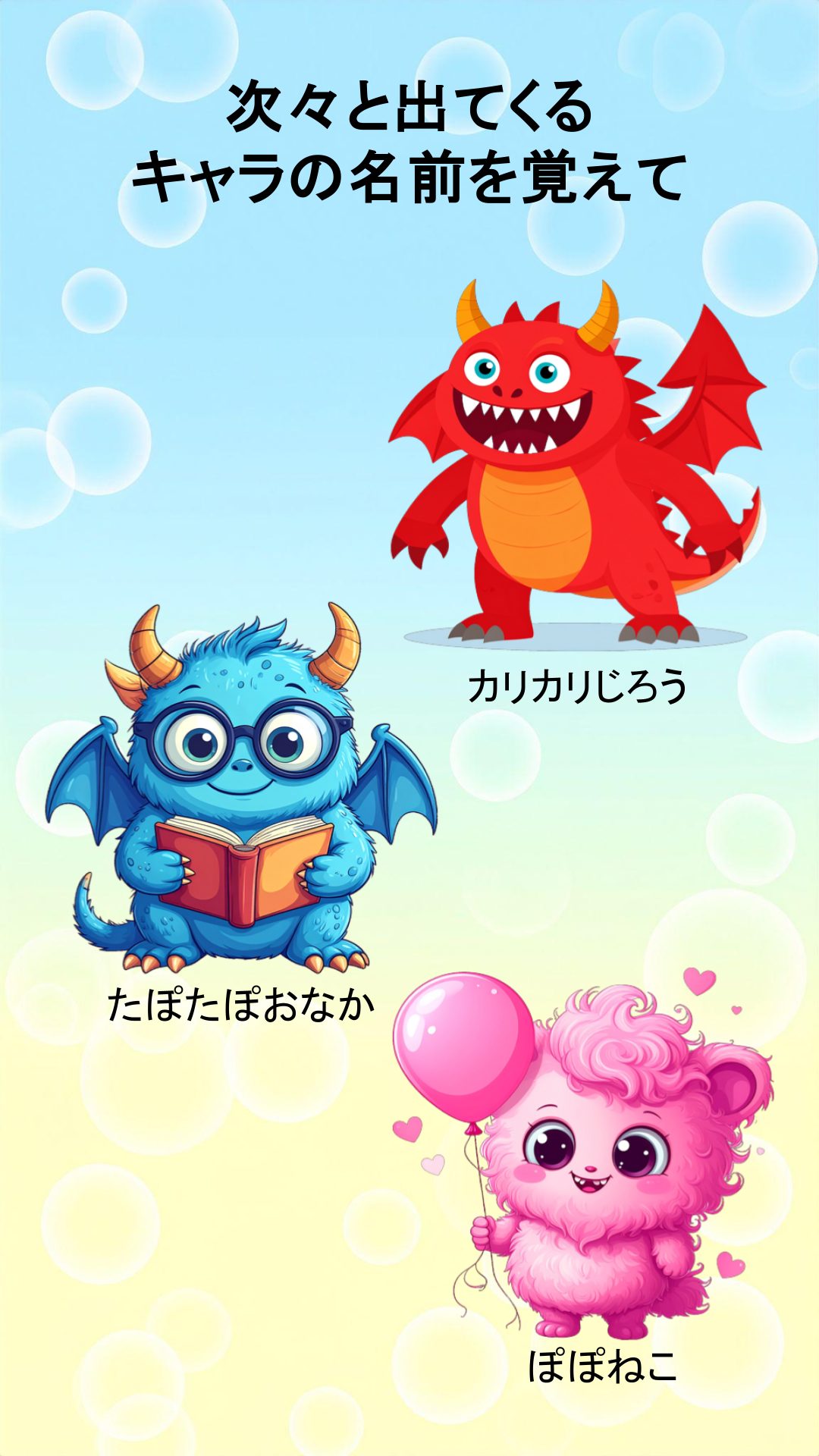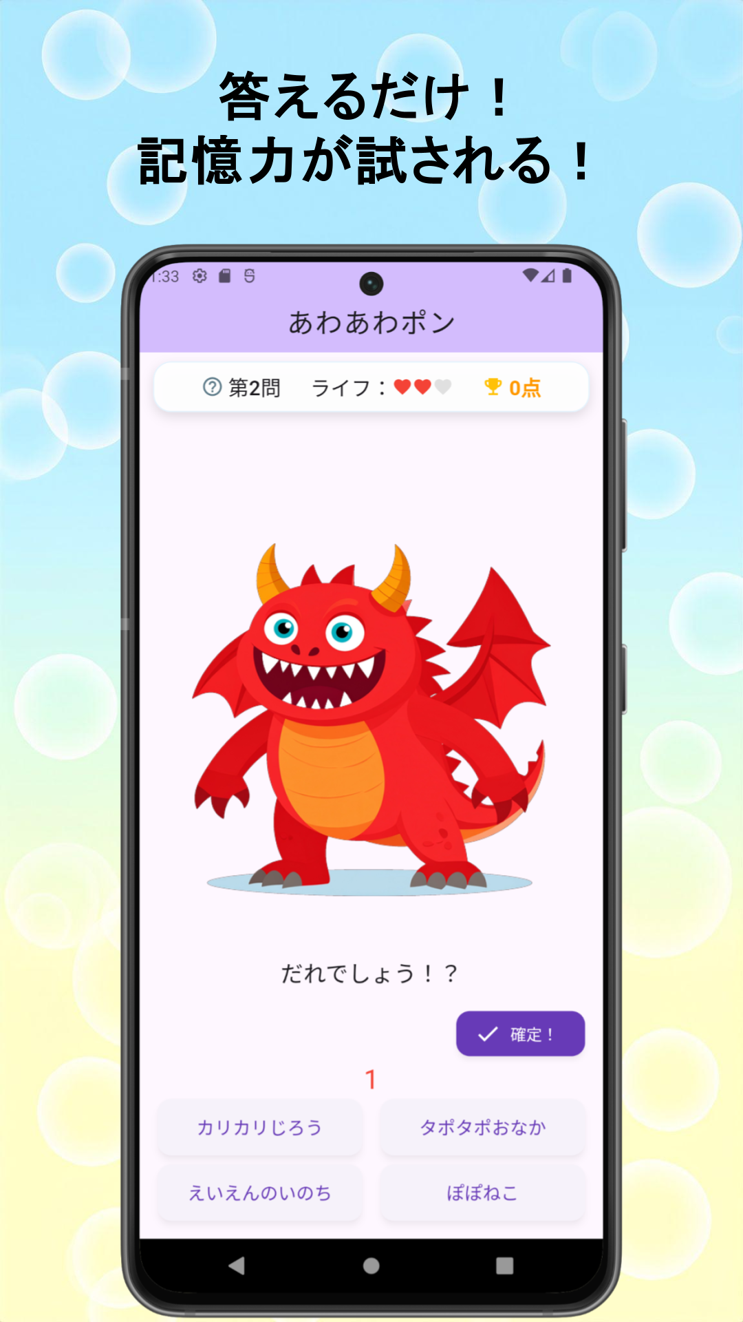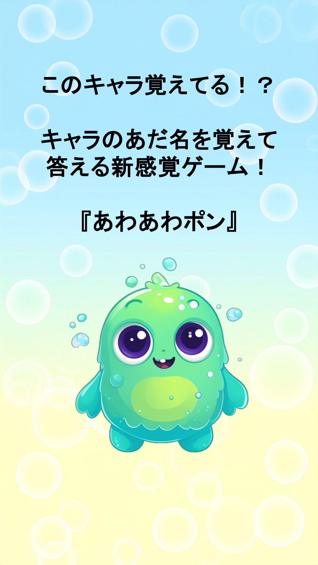このキャラの名前、なんだっけ!? 「くるくるくびれ」?それとも「ガチのギャル」? 次々に出てくるキャラのニックネームを“覚えて当てる”、新感覚の記憶力バトルパーティゲーム!爆笑しながら記憶力も鍛えられる、一石二鳥のスマートフォンアプリです! 🎪 こんな人におすすめ 友達とワイワイ笑いながら遊びたい 記憶力を楽しく鍛えたい ユニークなネーミングを楽しみたい 子どもと安心して遊べるアプリを探している スキマ時間にちょっと脳トレしたい 面白いアプリを使って配信したい(ご自由にどうぞ!) 🌟 ゲームの特徴 🎯 シンプルだけど奥が深いルール キャラがたくさん登場 → 自動でニックネーム付与 → 記憶する → 再登場時に答える! ライフ数は1・3・5から選べます 正解でスコアアップ 間違えるとライフが減ります ライフ0でゲームオーバー! 👥 一人でも友達とでも楽しめる シングルプレイ:ひとりでじっくり脳トレ マルチプレイ:友達と対戦&協力プレイ ルーム作成でパスコード共有 協力モード or 対戦モードを選べる! 📱 今すぐダウンロードして、爆笑記憶力バトルを始めよう! 「ぽよよんパニック」や「ずぼっとずぼら」など、予想不可能なネーミングがあなたを待っています。 一人でも、みんなでも、いつでもどこでも楽しめる「あわあわポン」で、笑いながら脳を活性化させよう!