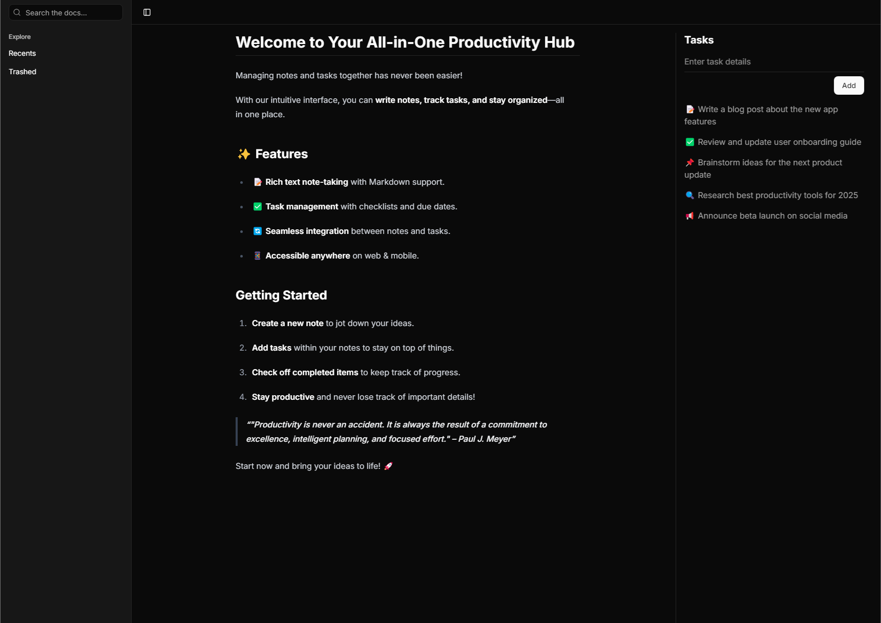 思いついたアイデアや記録をすぐにメモし、必要に応じてタスク化できるウェブサービスです。 シンプルな操作で整理しやすく、やるべきことを見失わない。思考をスムーズに行動へつなげるツールを目指しています。 メモはマークダウンに対応しています。