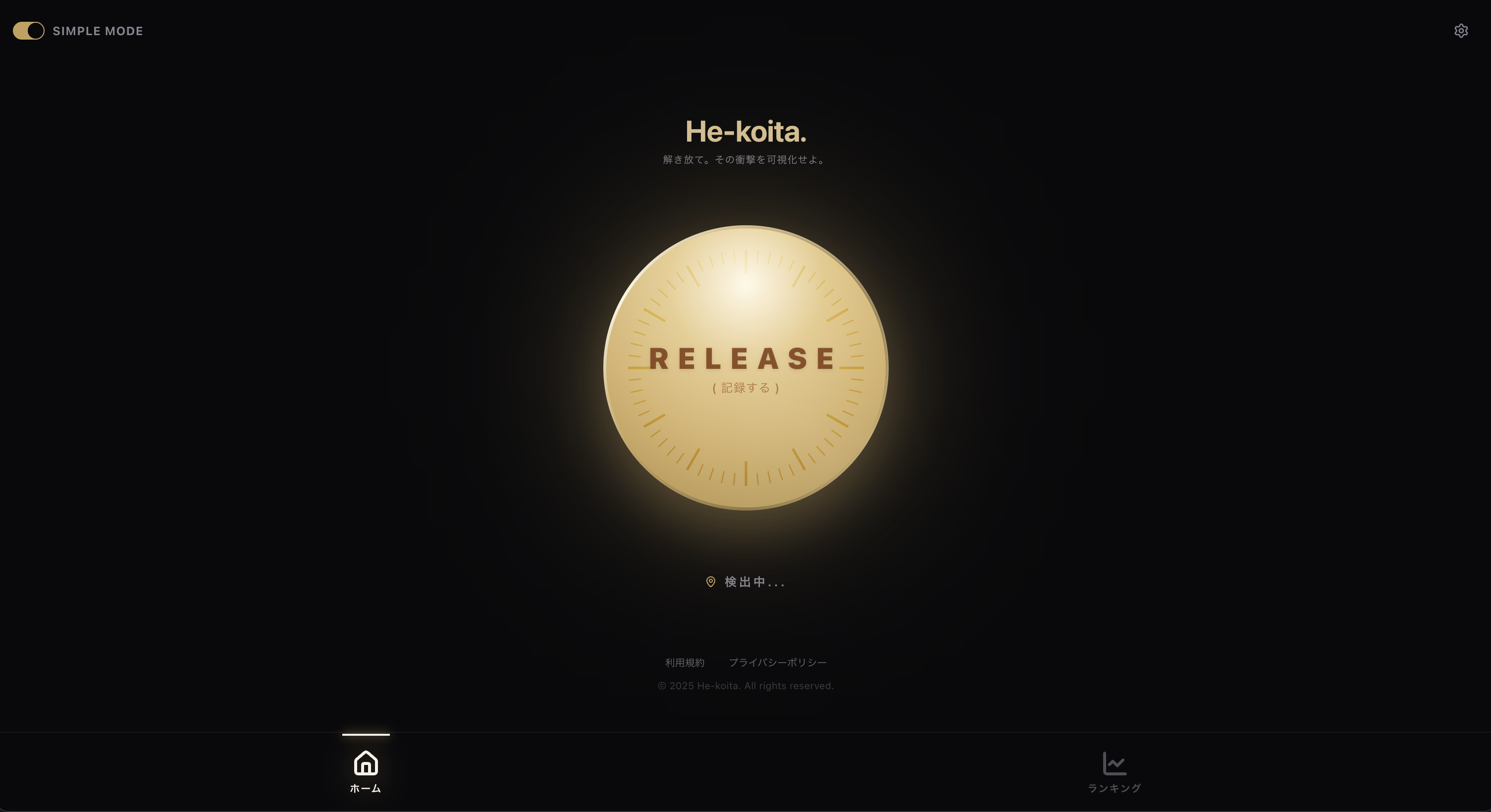 「He-koita」は、日々の生理現象(おなら)を、無駄に洗練されたUIと最新のWeb技術で記録・可視化するWebアプリケーションです。 真面目すぎる記録アプリへのアンチテーゼとして、「くだらないデータを、カッコよく扱う」ことを目指して開発されました。
