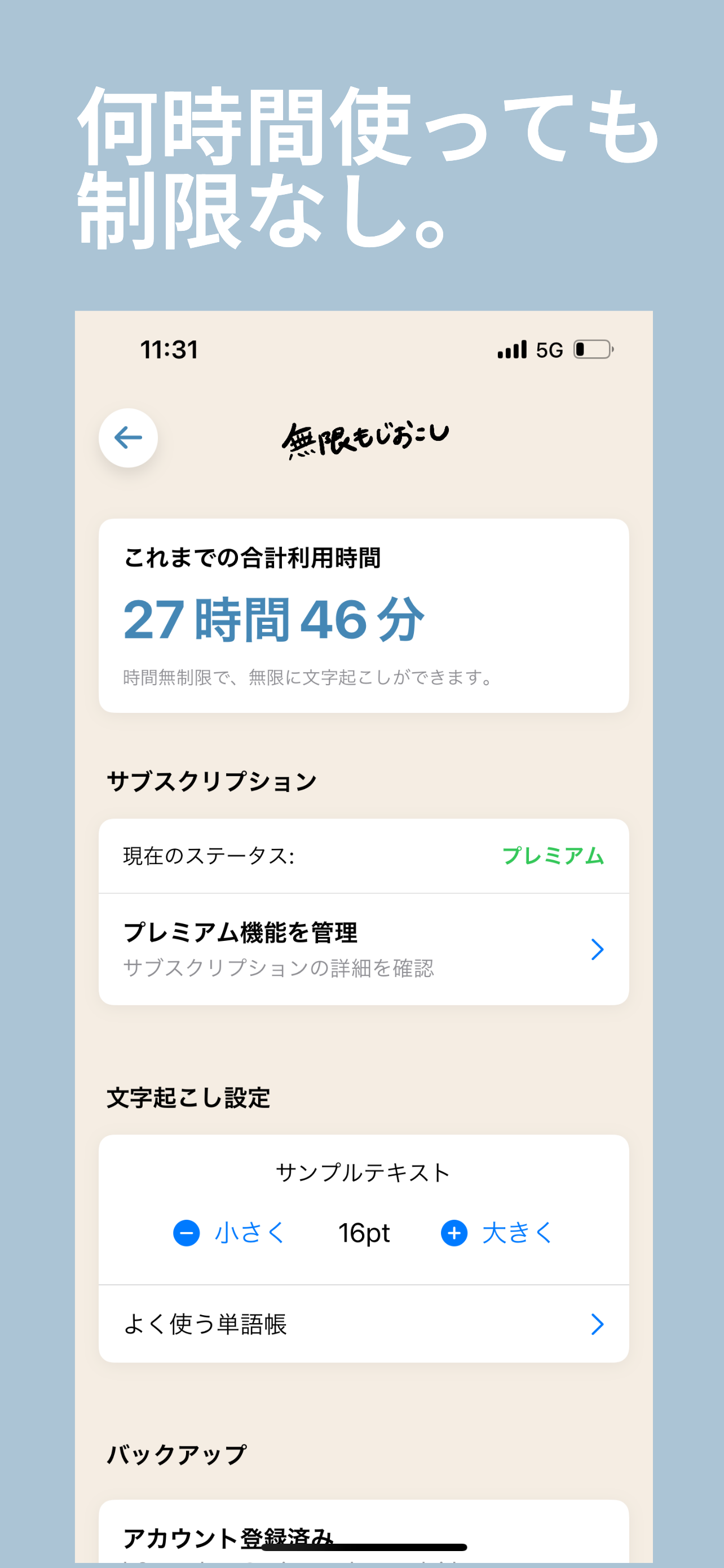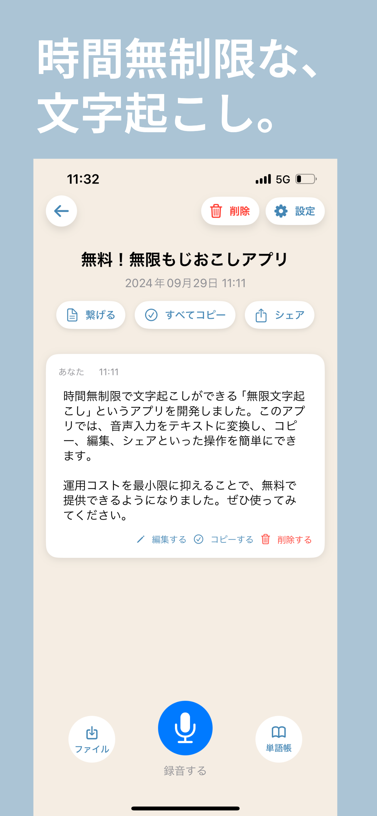 時間無制限で、無料で文字起こしし放題な「無限もじおこし」。 なぜ無料で提供できているのか。それは文字起こし技術の低コスト化を実現し、かつ個人開発のため人件費がかからないからです! アプリ内の広告収入によって、無料で持続可能なサービス提供を実現しました。 ちなみに、このアプリにはサブスクもあります。こちらは広告非表示、音声ファイルのインポート機能、生成AIによる変換機能の無制限利用を解放します。 広告を非表示にしたい方、プラスアルファの機能を利用したい方は検討ください! ◆アプリのこだわり◆ ■高品質な文字起こし 無料とはいえ、文字起こしは品質が命なのでこだわりました。「あー」「えー」などの不要な言葉を取り除き、句読点をつけることで読みやすい文字起こしを実現してます。 ■バッテリー消費を抑える スマホのリソースを過度に使う文字起こしアプリもありますが、それだとスマホが熱くなってバッテリー消費が激しくなります。 それだと私は使いたくないなーと思ったので、スマホでの高負荷な処理を辞め、バッテリー消費を抑えました。 ■他の場所へシェアしやすい 文字起こし内容は簡単にコピーができ、またシェアもできるようにしています。 他のアプリとの連携がしやすい設計をコンセプトにしています。 ■文字起こしの変換精度を高める 文字起こしでよくあることとして、一般的ではない固有な単語などの変換に失敗してしまうことがあります。 これを「よく使う単語帳」に登録することで、高精度に変換ができるようにしました。 ■バックアップでの引き継ぎもできる 機種を変更したりなどをしても、バックアップでデータを転送できるようにしているので安心してご利用ください!