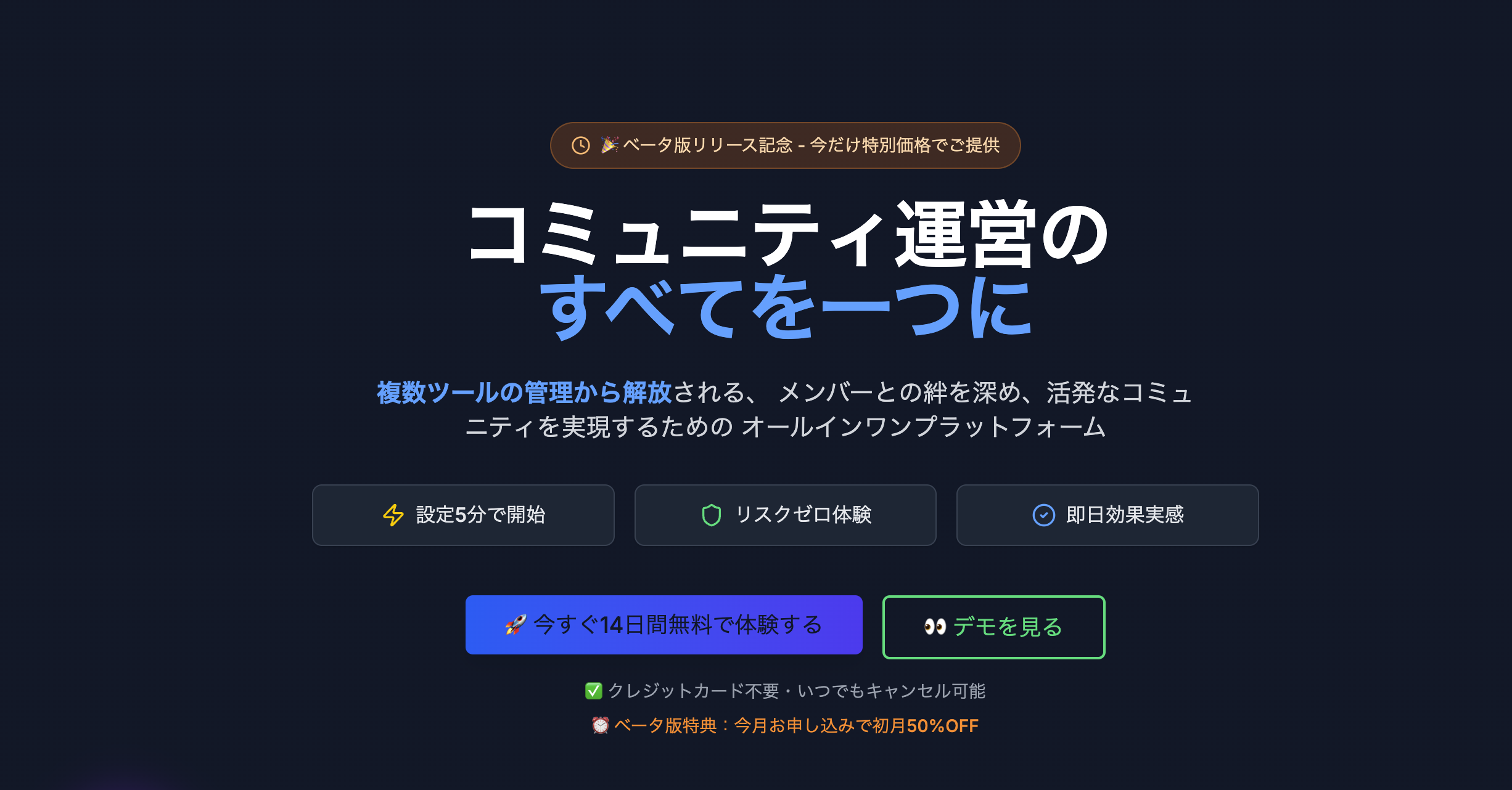 あなたのコミュニティ運営を根本から変革し、 新しい価値を創造するプラットフォームです。 ✅ビデオ通話 ✅メッセージ ✅スレッド ✅Q&A ✅イベント などの機能でコミュニティを効率的に運営