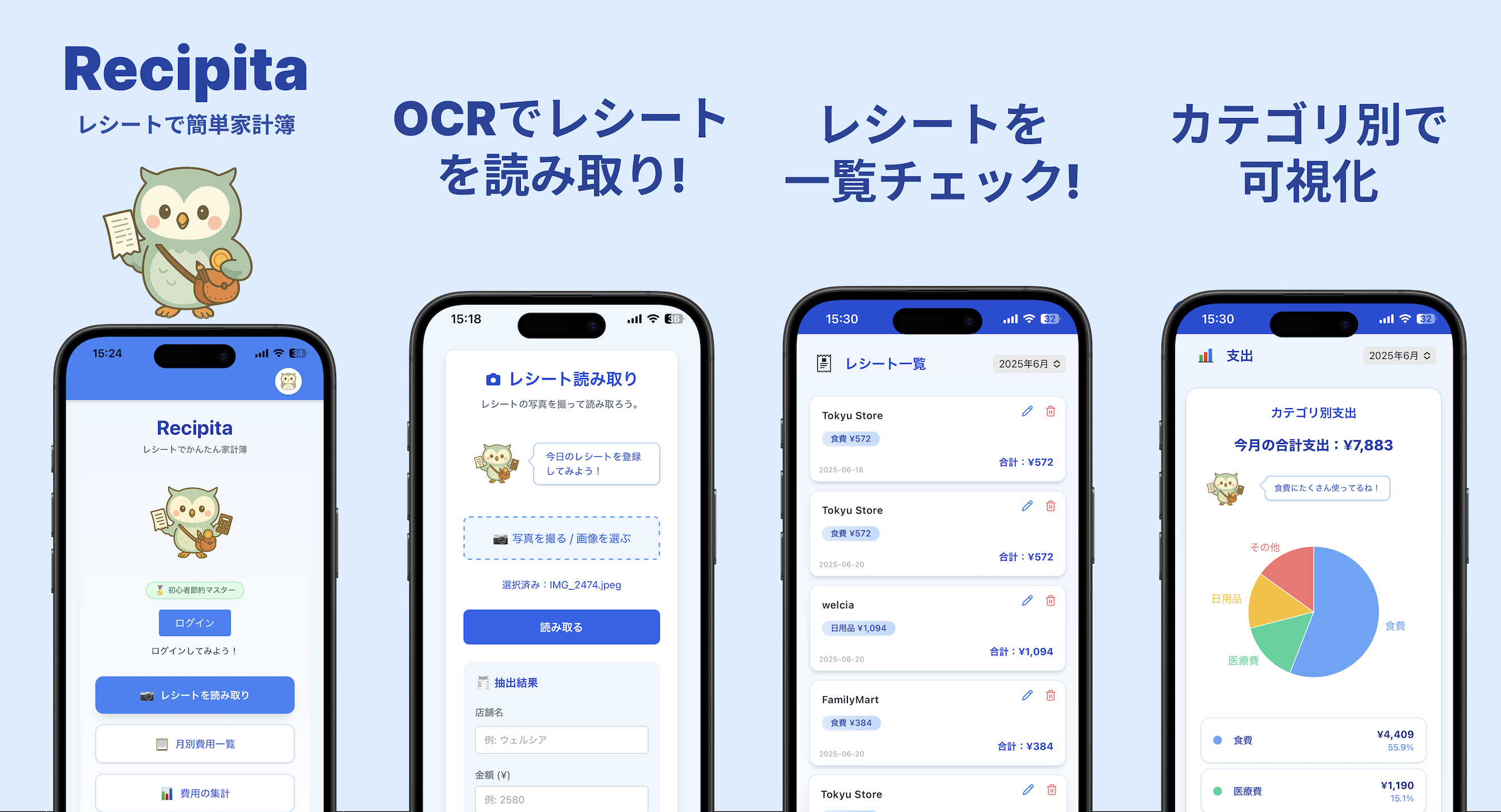 Recipitaは、レシートを撮るだけでAIが自動で記録してくれる家計簿アプリです! 難しい操作は不要で、スマホでもサクサク使えるシンプルなデザインにこだわりました。 レシートをアップするだけで、金額やお店の情報をAIが読み取り。 月ごとの支出を一覧で見たり、カテゴリごとの集計もできるので、「お金の流れ」が自然と見えてきます! ちょっとずつ、でもちゃんと家計を見直したい。そんな方に寄り添うアプリを目指しています🙌