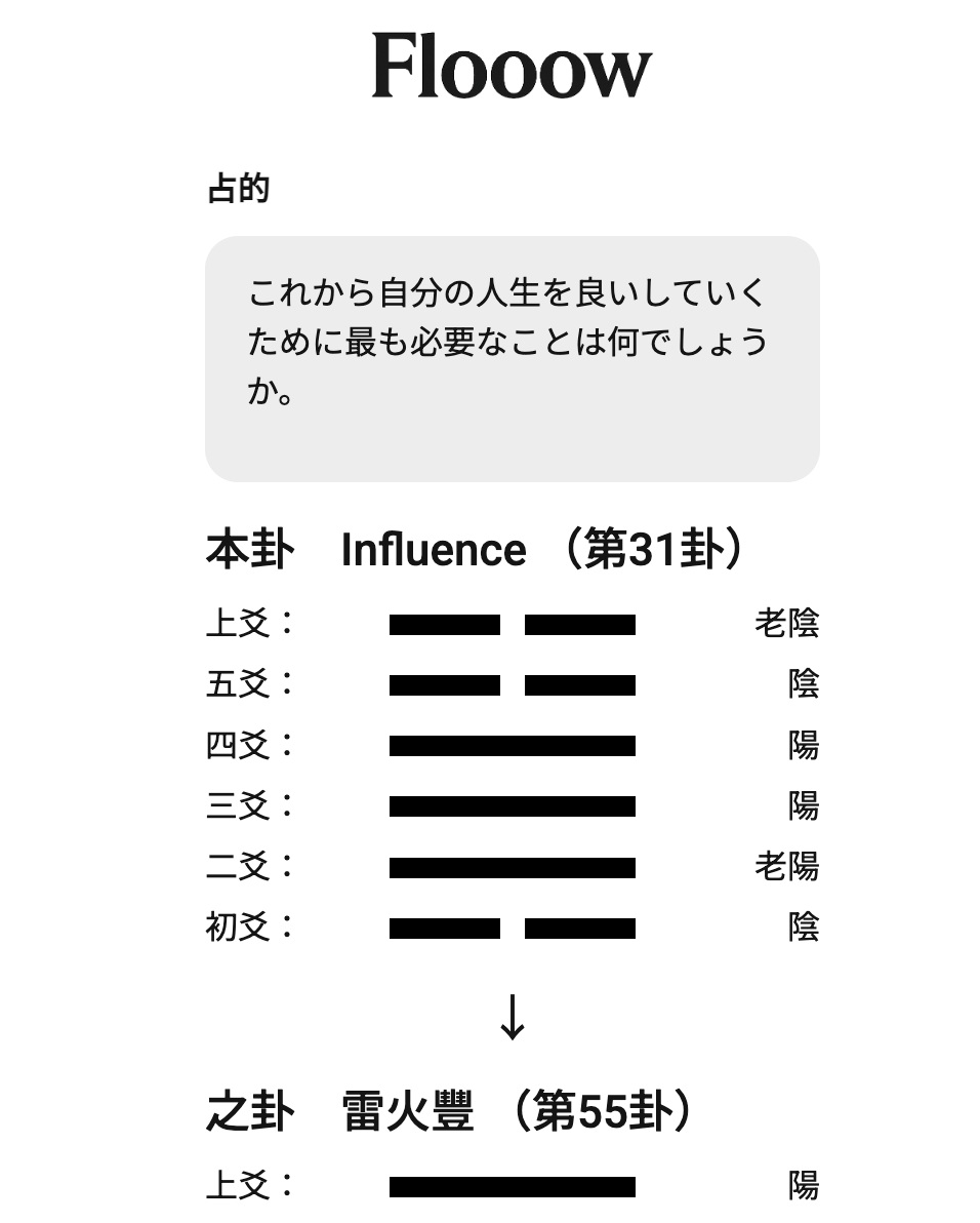 あなたの「問い」に流れを読む智慧を。 Flooowは生成AIと東洋の叡智「易経」を融合させ、あなたの悩みや迷いに対し“今の流れ”と“未来の兆し”を読み解きます。