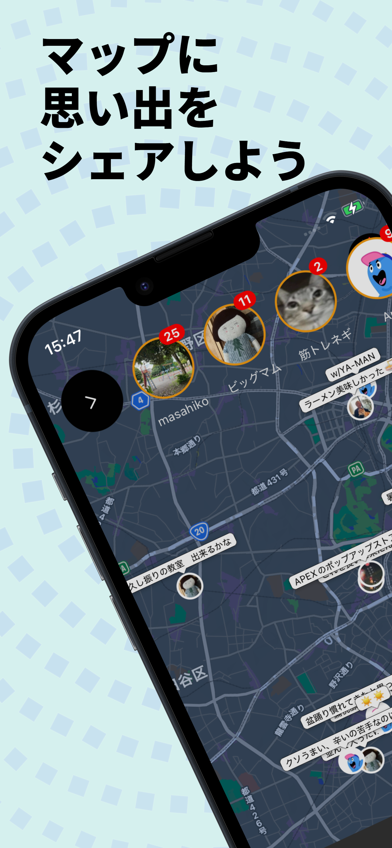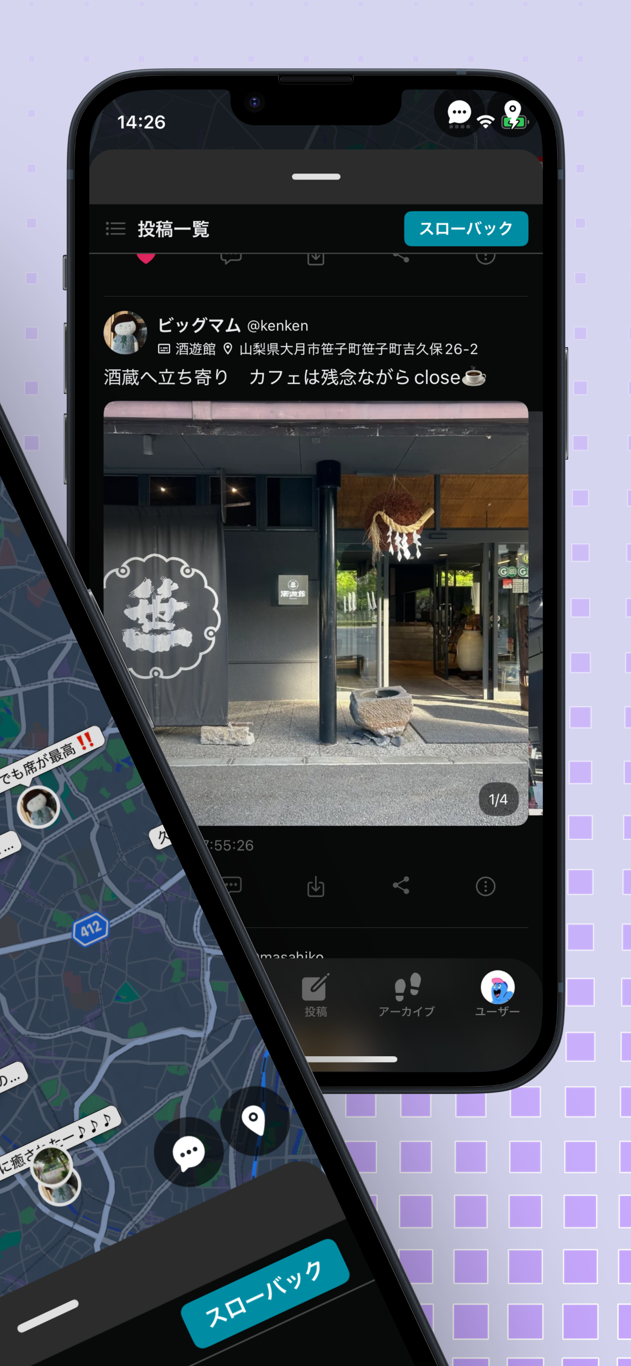 位置情報を活かして、あなたの行動や考えを記録できる地図中心のソーシャルアプリです。 現在地から文章・写真・動画・音声・トラッキングを添えて投稿でき、メディアファイルはダウンロード可能。 サーバー機能を使えば、仲間と場所ごとの記録を共有したり、個人で訪れた場所を整理することもできます。 投稿は公開・非公開を細かく選べ、すべての記録はアーカイブからいつでも振り返れます。 旅の記録、日常の足跡、仲間との思い出を、ひとつの地図に。