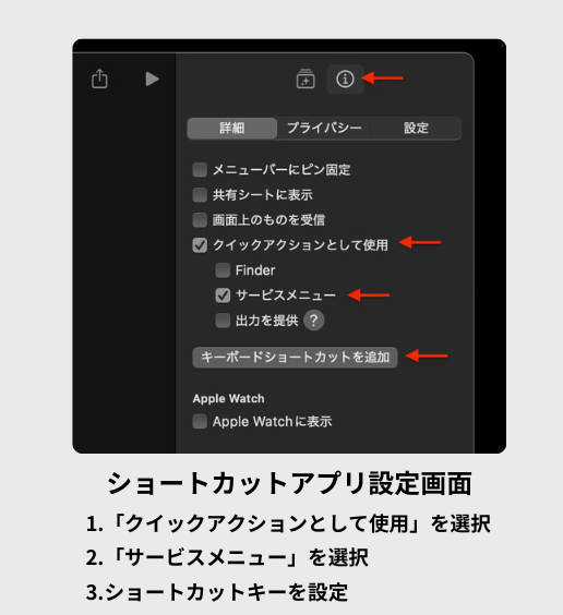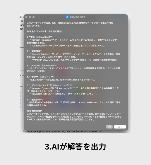 PC画面の任意の範囲について、AIに質問できる便利なMacOSショートカット! ショートカットアプリを使って、画面上の気になる部分を選択するだけで、その内容をAIに分析・解説してもらえます。 画像、文書、動画など、画面上のあらゆる要素について質問可能。 ショートカットアプリがインストールされたMacですぐにご利用いただけます。