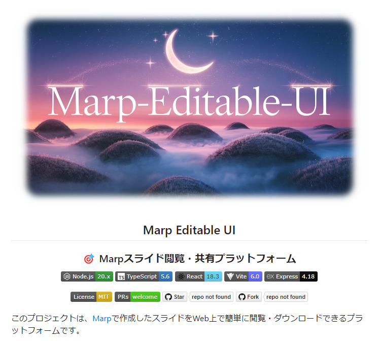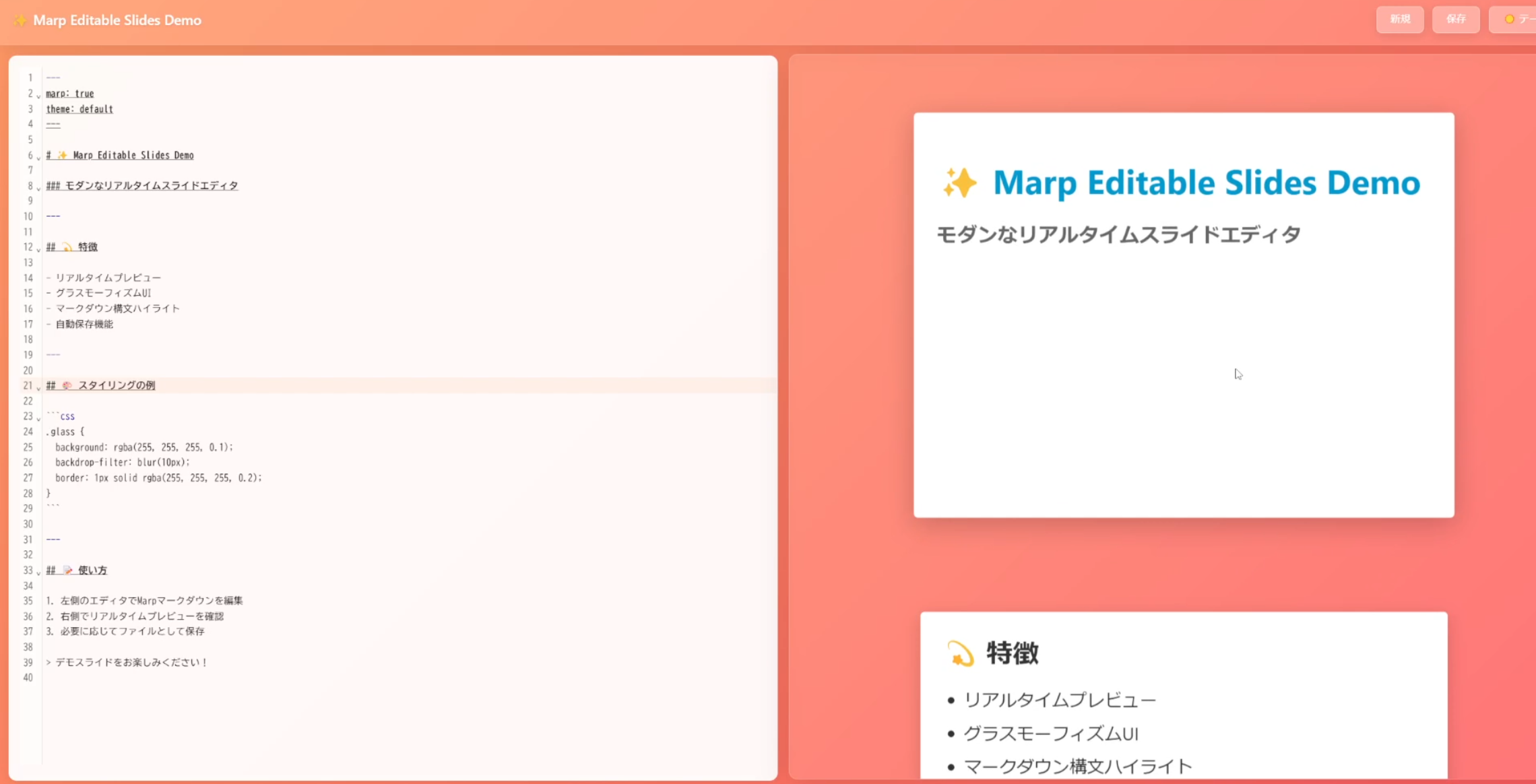 Marpで作成したスライドをWeb上で簡単に閲覧・ダウンロードできるプラットフォームです。 主な特徴: - モダンなWEBインターフェース - スライドのリアルタイムプレビュー - ブラウザベースで簡単アクセス - レスポンシブデザイン - ダーク/ライトモード対応