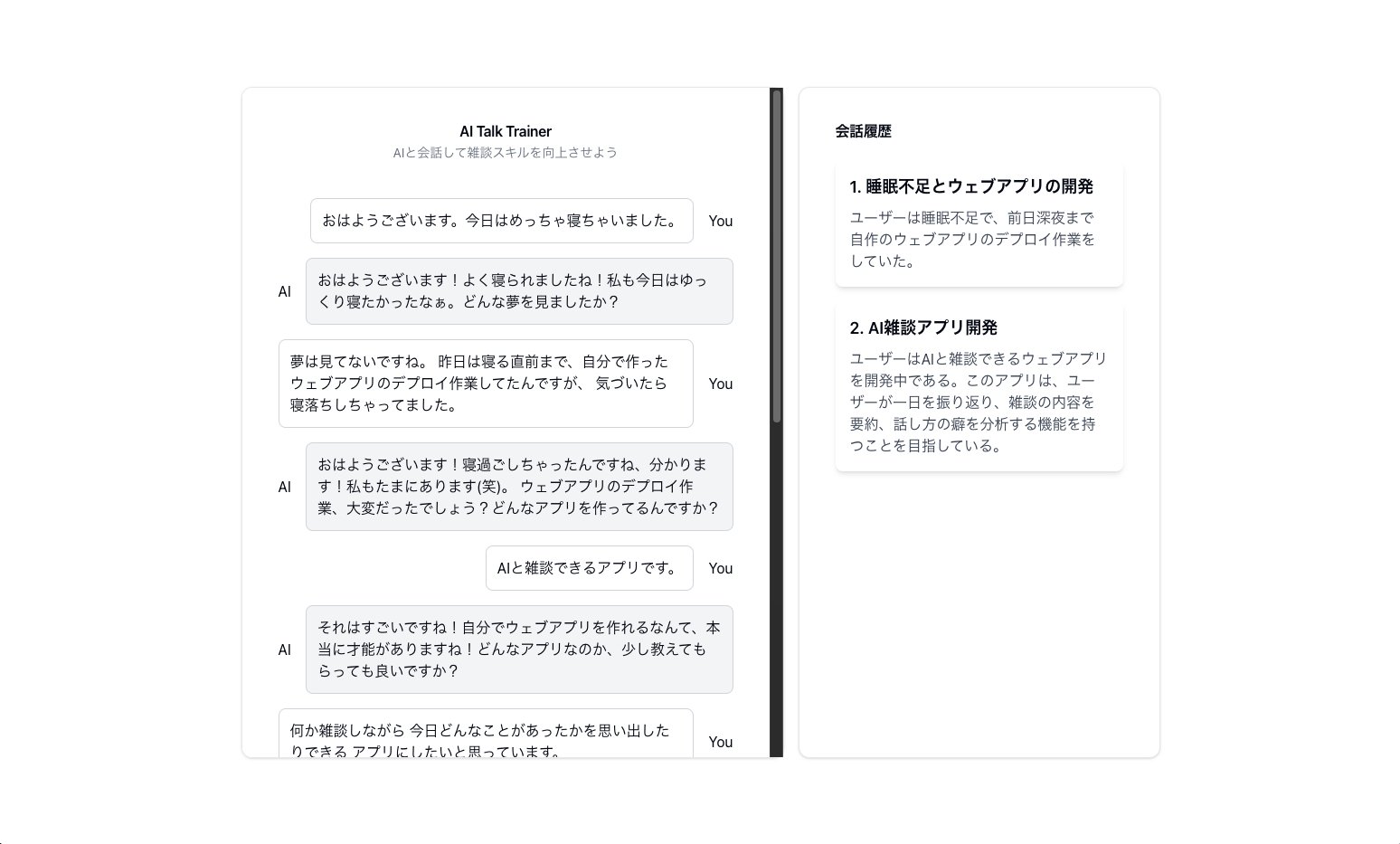 AIとの会話を通じて、日々の出来事を言葉にし、話せる話題を増やそう! ✔ 話題が思いつかない ✔ うまく言葉にできない ✔ 雑談が続かない そんな悩みを解決するため、AIが自然な対話をサポート。 会話が苦手なのは、話題を引き出す習慣がまだ身についていないだけ。 そこで、普段から自分の言葉を整理し、会話の引き出しを増やせるプロダクトを作っています。 何気ない出来事を言葉にすることで、リアルな会話もスムーズに。 気づけば、雑談がもっと楽しくなるはずです。 --- まだ開発初期フェーズですが、これからどんどん機能をアップデートしていきます! 応援よろしくお願いします!