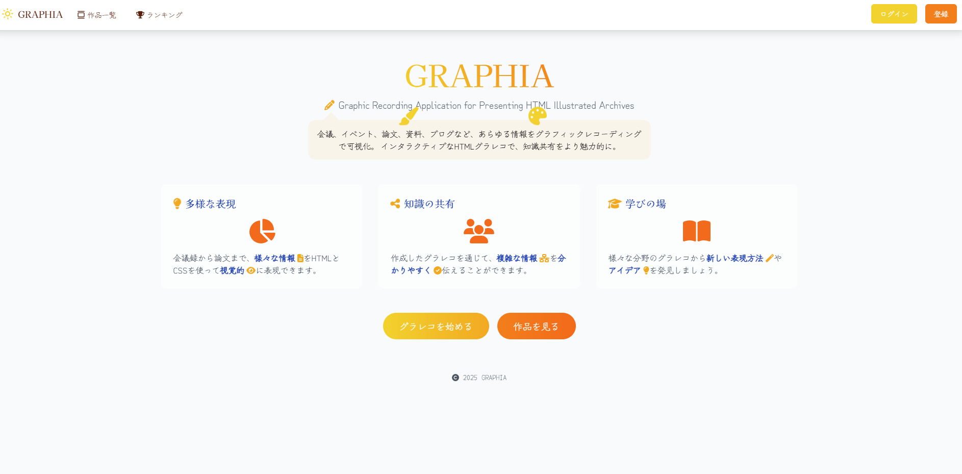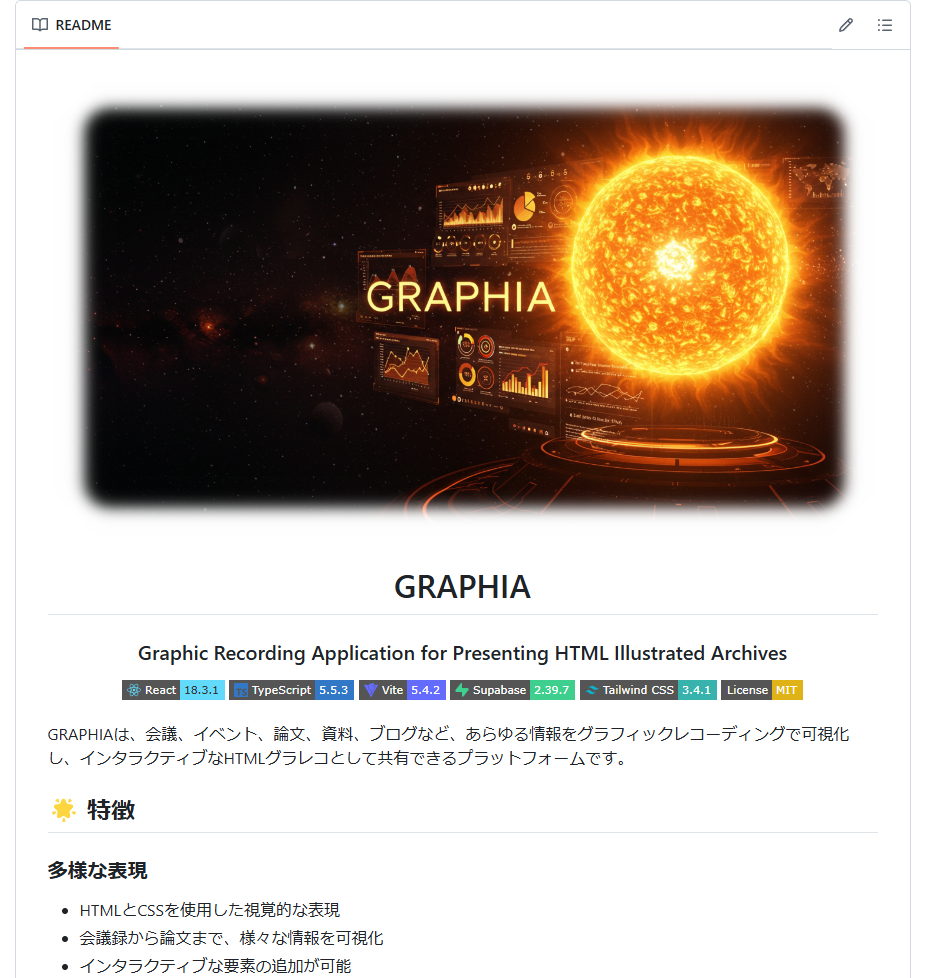 GRAPHIAは、会議、イベント、論文、資料、ブログなど、あらゆる情報をグラフィックレコーディングで可視化し、インタラクティブなHTMLグラレコとして共有できるプラットフォームです。HTMLとCSSを活用した豊かな表現力で、複雑な情報を分かりやすく伝え、知識共有を促進します。