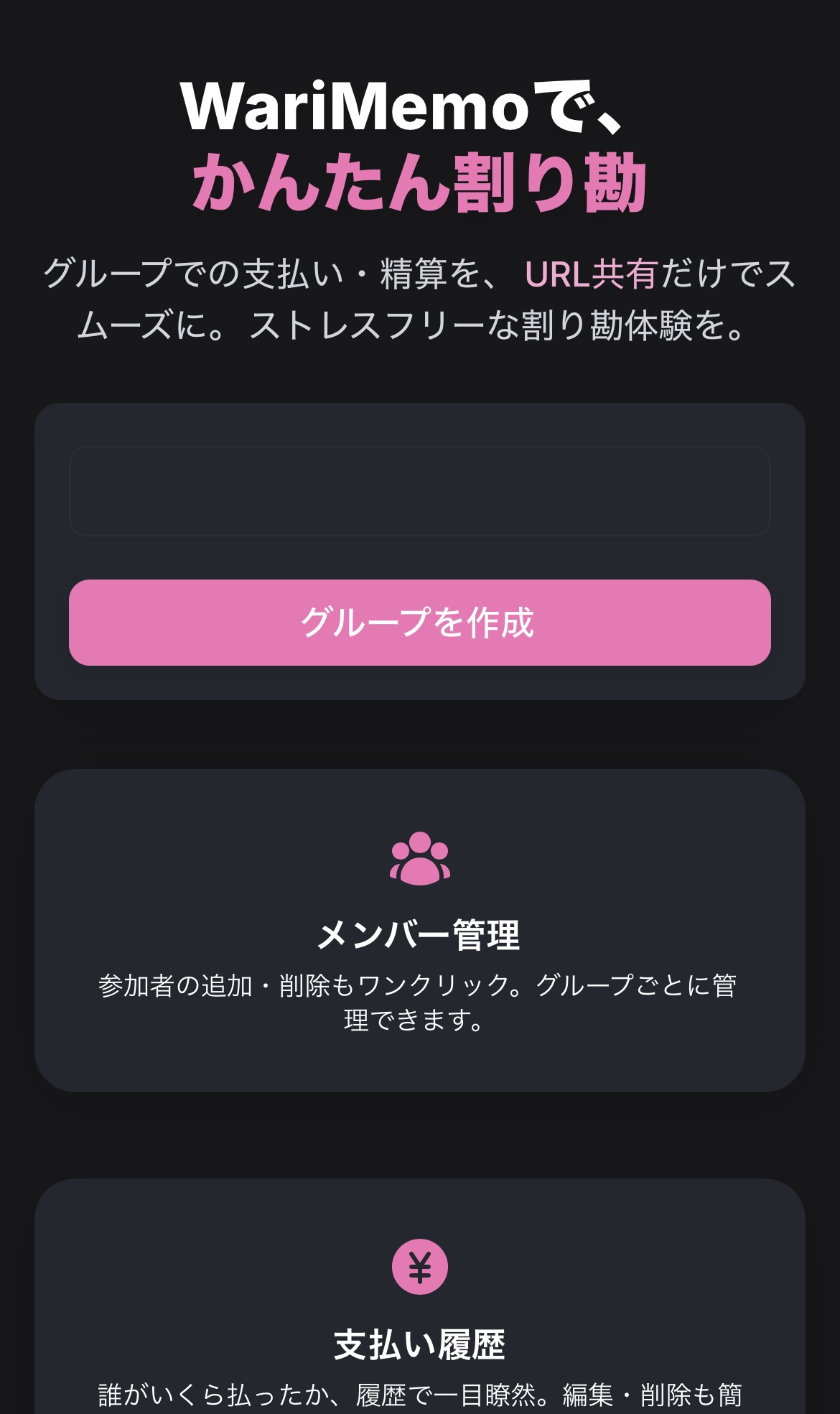 WariMemoは、ブラウザ上でグループの支払い・精算をURL共有だけで実現する軽量割り勘ツールです。 面倒な参加登録や複雑な計算を一切不要にし、誰でも簡単に割り勘グループを作成・管理できます 。