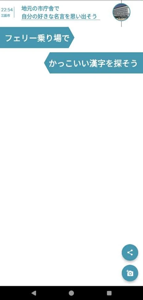 公園のベンチ」「美しい写真を取ろう」や「新が付く地名」「顔に見える雲を探そう」など、場所と活動の組み合わせで散歩の目的を自動生成します。